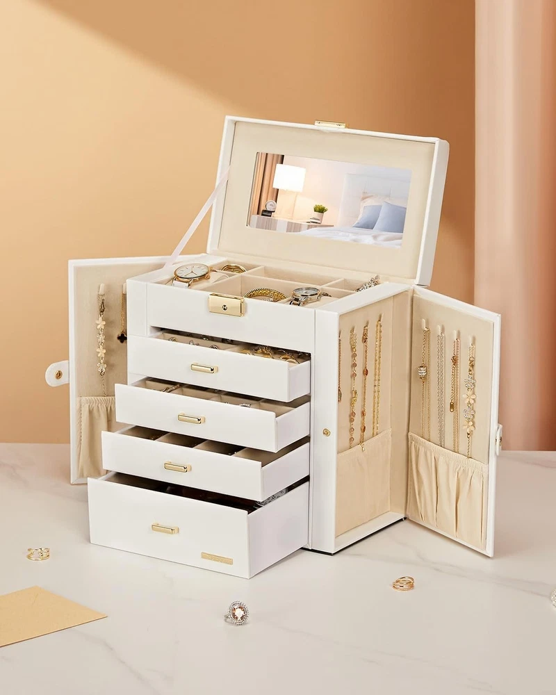 Stunning Lockable Jewelry Case with 4 Drawers - Ideal for Organizing Accessories ‹ › ‹ › ‹ › ‹ › ‹ › ‹ › ‹ › ‹ › ‹ › ‹ › ‹ › Stunning Lockable Jewelry Case Organize your precious jewelry and accessories in this elegant and functional jewelry case. Perfect for any collection! Key Features: Stunning black faux leather surface with a soft velvet lining, exuding sophistication. Dimensions: 10.43’’ (L) X 6.10’’ (W) X 11.14’’ (H), ample space to house watches, necklaces, earrings, bracelets, hairpins, brooches, and more. Four pull-out drawers: one deeper bottom drawer for larger jewelry and three equal-sized drawers. Drawer organization includes a combination of earring cards, ring rolls, and various compartments for your accessories. Each drawer features a delicate handle for easy access and a touch of elegance. Swing-out cabinets with 8 necklace hooks and 2 storage ledges to keep necklaces untangled and organized. Benefits: Elegantly designed to complement any room decor. Protective lock and key mechanism for peace of mind. Ribbon attached to the lid prevents it from falling back, enhancing usability. Built-in mirror for a convenient dressing experience. Thoughtful gift for special occasions, including Valentine's Day, Mother’s Day, birthdays, and weddings. Why Choose Our Lockable Jewelry Case? Let your treasured possessions shine while they remain beautifully organized and securely stored. This lockable jewelry case is not just a storage solution; it's a statement piece that enhances the beauty of your jewelry collection. With its elegant design, protective features, and thoughtful organization, it makes the perfect gift for any jewelry lover. Elevate your accessory storage and delight someone special by ordering this luxurious jewelry case today! Shipping Free & Fast Shipping - We offer free shipping to most of the USA with a normal delivery time of 3-10 businessdays. However, due to various situations, additional delivery time (up to 3 weeks) may be required for some items. Alternative Carriers - We may use alternative carriers (e.g. USPS, FedEx, UPS, etc.) to ensure your package arrives safely and on time. Due to the use of multiple carriers, we are unable to provide a tracking number automatically. Handling Time - Orders are processed and shipped within 1-5 business days of receiving cleared payment. Shipping Restrictions - Shipping to Alaska, Hawaii, Puerto Rico, Guam, and other US territories may incur shipping charges or delivery restrictions. Please contact us before ordering, or your order can be refunded/cancelled. State Restrictions - There may be restrictions based on your state of purchase. For example, certain items may not be shipped to California due to state regulations. Contact for Tracking Updates - If you require tracking updates or have any concerns about the delivery of your order, please feel free to contact us, and we will be happy to assist you. Return Please see our ebay return policy. We do not accept return on most products. This is to avoid customers mis-using ebay returns. All sales are final. Please be sure to check the return policy listed at the top of the listing. In rare cases, we may accept returns, if the buyer pays both ways shipping and 20% restocking fee. If you are un-sure of return policy of a particular item, please ask before buying. Payment We accept all major credit cards, PayPal, and Apple Pay for your convenience. Your payment information is secure and encrypted to ensure a safe and seamless transaction. Please complete your payment within 3 days of purchase to avoid any delays in shipping. Feedback Your feedback is extremely important to us. We strive to provide the best products and customer service possible. If you are satisfied with your purchase, please take a moment to leave us a positive review. If you have any concerns or issues with your order, please contact us before leaving negative feedback. We are committed to resolving any problems and ensuring your satisfaction. Contact Us If you have any questions or concerns, please feel free to reach out to our customer support team. You can contact us through the eBay messaging system. We are available Monday to Friday, 9:00 am to 5:00 pm EST, and we will do our best to respond to your inquiry within 24 hours. Buy it now and enjoy a pleasant shopping experience! UPC: Not Set Unit Quantity: 6.84 Items Included: Jewelry Box,Removable Pillows,Drawer Organizers Suitable For: Bracelet,Earring,Necklace,Ring,Watch,Bangle Material: Faux Leather,Leather,Velvet Theme: Not Set Features: Mirror,Lockable,Pull Out Drawers,Swing Out Cabinets Brand: Unbranded Type: Jewelry Box Color: White Lining Material: Leather Shape: Rectangle Country/Region of Manufacture: Not Set Department: Women Capacity: More Than 25 Pieces Item Length: Not Set Item Depth: 6.10 in Item Width: Not Set MPN: Not Set Unit Type: lb Vintage: Not Set Handmade: Not Set Personalize: Not Set Customized: Not Set