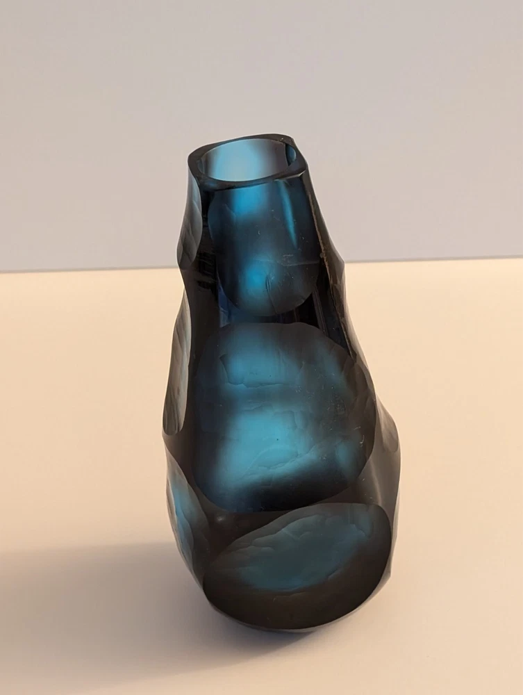 I love this MCM vase. It's arresting, in that it's extremely unusual. The saturated tones of cobalt blue and purple pop when placed by light. The vase comes alive and stands on its own as a piece of art, with or without flowers inside. It measures, 7 1/2 inches tall and 3 inches wide. In great condition. No chips or scratches.