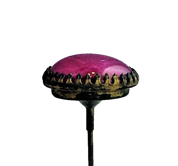 The product is a stunning oval pink star sapphire glass hatpin, handmade with no modifications. It features a beautiful pink star sapphire glass design that is sure to add a touch of elegance to any collection. This unique and eye-catching hatpin would make a lovely addition to any vanity or collection of collectibles.