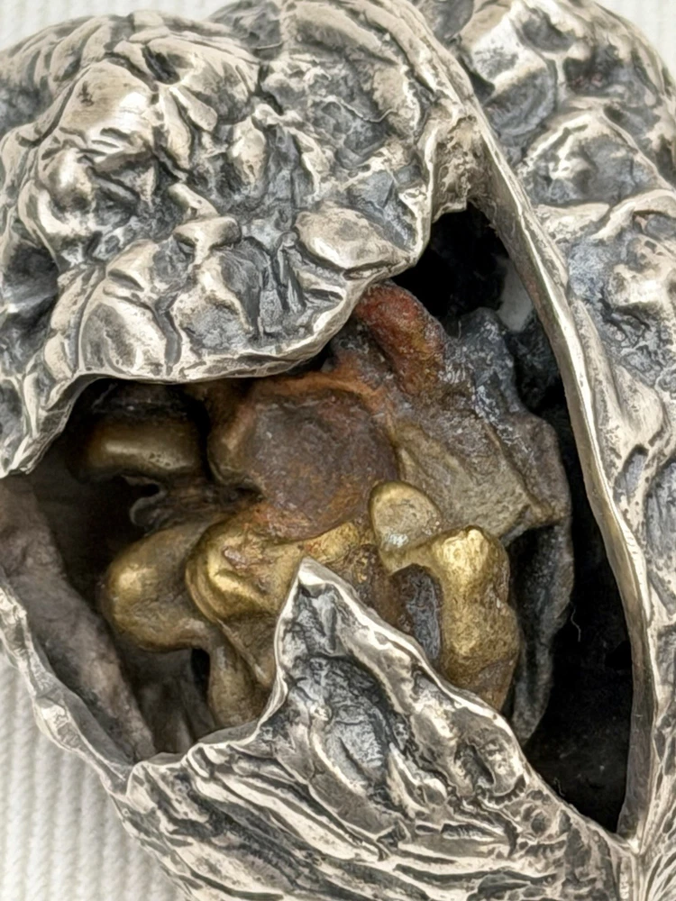 Stunning Sterling Silver 925 “Fabano” Figural Walnut Nut with Bronze Interior – 6.1 oz – Rare This unique and beautifully crafted piece is made of solid sterling silver 925 and is marked accordingly, along with a maker’s mark that appears to read “Fabano.” Designed in the form of a cracked walnut, it features an impressively realistic textured exterior and a contrasting bronze-colored interior representing the nut inside. A high-quality collectible with excellent attention to detail, weighty in hand at 6.1 oz, and ideal for collectors of figural silver, nature-inspired decorative objects, or fine artisan metalwork. Condition: Pre-owned and in excellent condition with light age-appropriate wear. No dents or damage noted. Beautiful patina preserved. Features: • Solid Sterling Silver 925 • Marked 925 and Fabano • Figural walnut with bronze-tone nut interior • Weight: 6.1 oz (aprox.) • Highly detailed and finely crafted • Great addition to silver collections or decorative display A rare and striking piece—hard to find in this quality and weight.