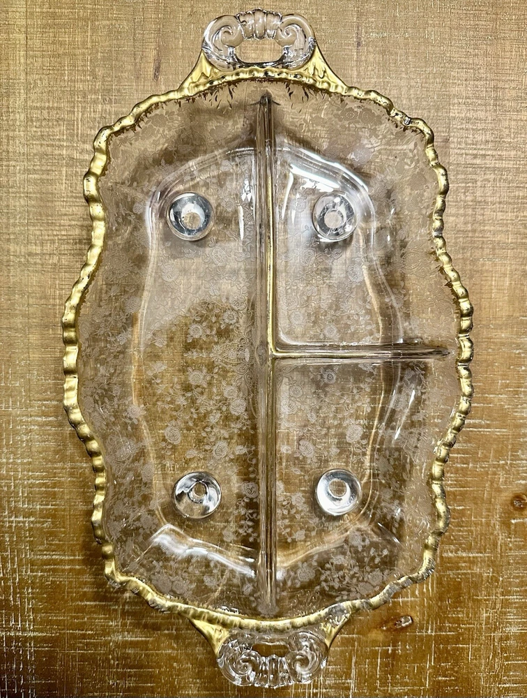 See photos for any imperfections. This vintage Cambridge Glass relish dish is a stunning addition to any collection. The dish features a beautiful rose point pattern on a clear glass base, with a glossy finish. It has three compartments, perfect for displaying candy or other small items. The dish is handmade and has a studio-crafted production technique, making it a unique and elegant piece. The antique dish is unboxed and has a rectangular shape, with a flower theme and art deco style. It is a original, licensed reproduction from the Rose Point product line and has a production technique of elegant glass. The dish is perfect for use as a candy dish or for serving small items at your next dinner party. Add this beautiful, one-of-a-kind piece to your collection today!