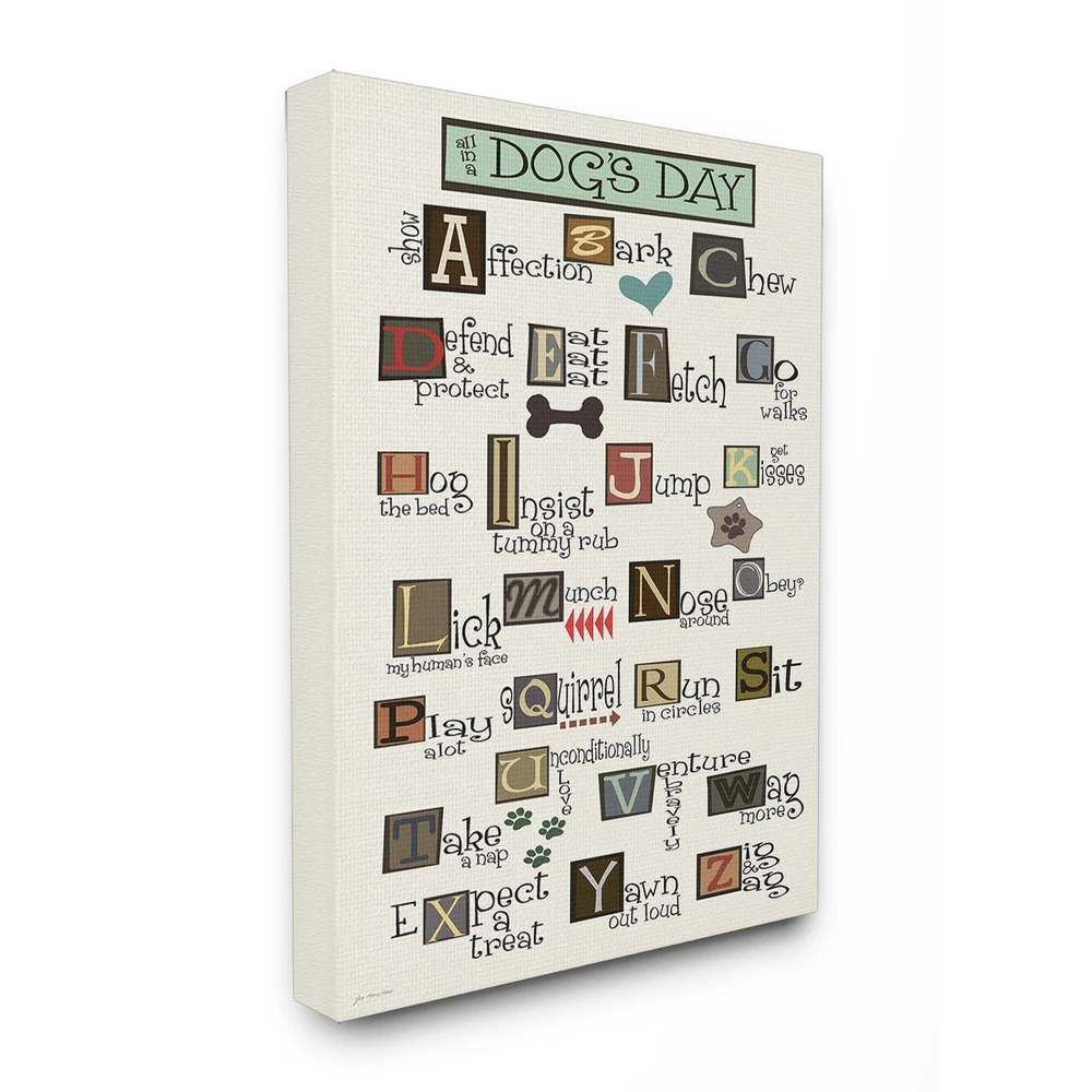 Hang this wrapped piece of wall art near your dog's food bowl or favorite place to sit. This stretched canvas wall art comes to you ready to hang.Canvas art is unframed and ready to hangAnimal-themed medium-sized wall art features a dog's ABCsUnframed rectangular wall art pairs well with contemporary decorMeasures 20 inches high x 16 inches wide x 1 1/2 inches deepMade in the USA Free Shipping Over $49.99* Details Stupell 'All in a Dog's Day ABC' Stretched Canvas Print Wall Art Product Description: Hang this wrapped piece of wall art near your dog's food bowl or favorite place to sit. This stretched canvas wall art comes to you ready to hang. Canvas art is unframed and ready to hang Animal-themed medium-sized wall art features a dog's ABCs Unframed rectangular wall art pairs well with contemporary decor Measures 20 inches high x 16 inches wide x 1 1/2 inches deep Made in the USA