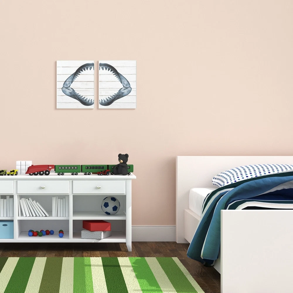 The more the better, right? Our multi piece wall art offerings are proudly made in the USA. All of our wall plaques start off as high quality lithograph prints that are then mounted on durable MDF wood. Each piece is hand finished and comes with a fresh layer of foil on the sides to give it a crisp clean look. It arrives ready to hang with no installation required, and comes with sturdy clear corners to keep it from damaging in transit. Free Shipping Over $49.99* Details Stupell Kids Shark Teeth Ocean Animal Textured Wood Design 2 Piece Wood Wall Product Description: The more the better, right? Our multi piece wall art offerings are proudly made in the USA. All of our wall plaques start off as high quality lithograph prints that are then mounted on durable MDF wood. Each piece is hand finished and comes with a fresh layer of foil on the sides to give it a crisp clean look. It arrives ready to hang with no installation required, and comes with sturdy clear corners to keep it from damaging in transit.