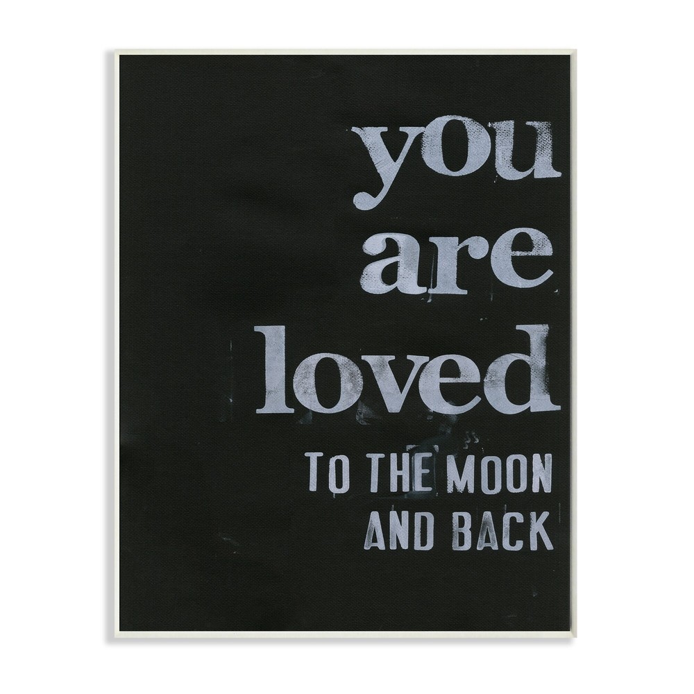 Keep your design simple with this black and white 'You Are Loved to the Moon and Back' wall art. High-quality inks on a hand-cut, stretched canvas make this a quality piece.Rectangular stretched canvas artHigh-quality inksCanvas is hand cut and stretched over a durable internal wood frame for a strong constructionContemporary, unframed designMedium size fits well on wallsMeasures 16 inches x 1.5 inches x 20 inchesMade in the USA Free Shipping Over $49.99* Details Stupell 'You Are Loved To The Moon And Back' Stretched Canvas Wall Art Product Description: Keep your design simple with this black and white 'You Are Loved to the Moon and Back' wall art. High-quality inks on a hand-cut, stretched canvas make this a quality piece. Rectangular stretched canvas art High-quality inks Canvas is hand cut and stretched over a durable internal wood frame for a strong construction Contemporary, unframed design Medium size fits well on walls Measures 16 inches x 1.5 inches x 20 inches Made in the USA