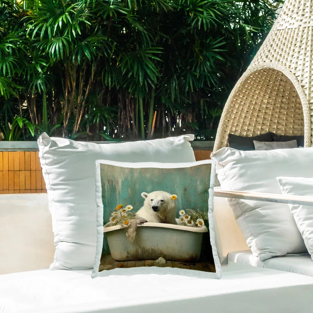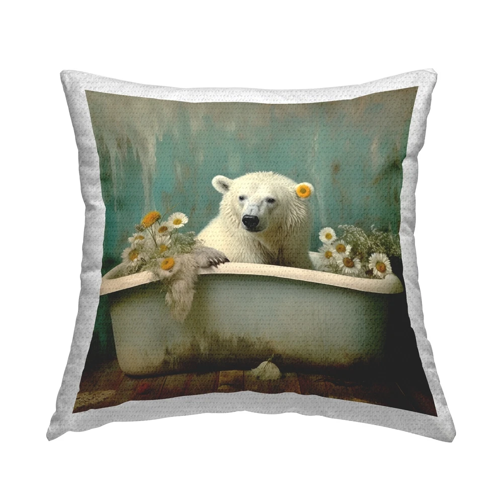 Update your outdoor living space with Stupell Decorative Outdoor Printed Pillow in a wide variety of colors, styles, and trends. The printing process makes the ink part of the fabric for greater outdoor durability. Quick-dry pillows arrive with inserts already zipped inside their case. Ideal for outdoor couches, chairs, loungers and benches. Pillow cases printed in the USA.Features: Dimensions: 18 x 18 Inches, Including Filling InsertDecorative outdoor pillows are a great and easy way to decorate your outdoor living space, adding both a decorative accent and comfort. Pillows arrive with insert already zipped inside and ready to fluff. Casing and filling insert are both made of quick-dry soft polyester material. The printing process makes the ink part of the fabric for Free Shipping Over $49.99* Details Stupell Polar Bear Daisy Filled Tub Printed Outdoor Throw Pillow Design by Lazar Product Description: Update your outdoor living space with Stupell Decorative Outdoor Printed Pillow in a wide variety of colors, styles, and trends. The printing process makes the ink part of the fabric for greater outdoor durability. Quick-dry pillows arrive with inserts already zipped inside their case. Ideal for outdoor couches, chairs, loungers and benches. Pillow cases printed in the USA. Features: Dimensions18 x 18 Inches, Including Filling Insert Decorative outdoor pillows are a great and easy way to decorate your outdoor living space, adding both a decorative accent and comfort. Pillows arrive with insert already zipped inside and ready to fluff. Casing and filling insert are both made of quick-dry soft polyester material. The printing process makes the ink part of the fabric for greater outdoor durability. To wash remove filling insert from casing using invisible zipper. Clean pillow case separately, machine wash on delicate with cold water and mild detergent. For best quality hang dry. Pillow insert is spot clean only. Artwork Relates ToBathing, Flower, Animal, Mammal, Wildlife, Tub, Bathtub, Bathroom, Polar Bear Design by Lazar Studio