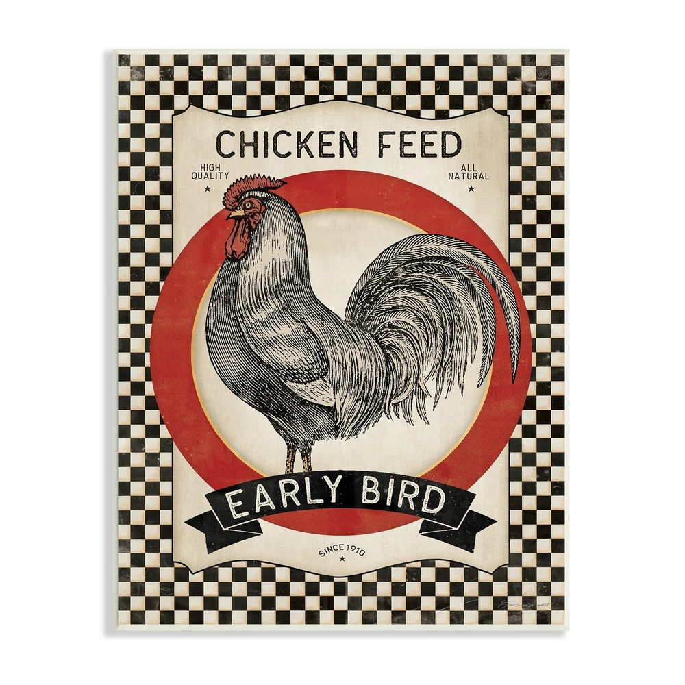 Proudly made in the USA, all of All of our wall plaques start off as high quality lithograph prints that are then mounted on durable 0.5 inch thick MDF wood. Each piece is hand finished and comes with a fresh layer of foil on the sides to give it a crisp clean look. It arrives ready to hang with no installation required, and comes with sturdy clear corners to keep it from damaging in transit.Features:Wall Art is Ready to Hang - No Installation or Hardware Needed. For Easy Set Up Lean or Layer Artwork on Shelf or Against Wall.All of our wall plaques start off as high quality lithograph prints that are then mounted on durable 0.5 inch thick MDF wood. Each piece is hand finished and comes with a fresh layer of foil on the sides to give it a crisp clean look. Made In USA.Artwork Ideal for any Free Shipping Over $49.99* Details Stupell Vintage Farmhouse Chicken Feed Advertisement Rooster Checkered Pattern Product Description: Proudly made in the USA, all of All of our wall plaques start off as high quality lithograph prints that are then mounted on durable 0.5 inch thick MDF wood. Each piece is hand finished and comes with a fresh layer of foil on the sides to give it a crisp clean look. It arrives ready to hang with no installation required, and comes with sturdy clear corners to keep it from damaging in transit. Features: Wall Art is Ready to Hang - No Installation or Hardware Needed. For Easy Set Up Lean or Layer Artwork on Shelf or Against Wall. All of our wall plaques start off as high quality lithograph prints that are then mounted on durable 0.5 inch thick MDF wood. Each piece is hand finished and comes with a fresh layer of foil on the sides to give it a crisp clean look. Made In USA. Artwork Ideal for any Living Room, Den, Entryway, Bedroom, Office, Kitchen or Bathroom. Design by Stephanie Workman Marrott