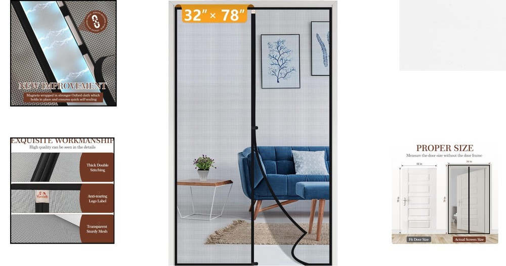 Sturdy Magnetic Screen Door 34"x79" Fits 32"x78" - Easy Installation & Windproof ‹ › ‹ › ‹ › ‹ › ‹ › ‹ › ‹ › ‹ › ‹ › ‹ › Sturdy Magnetic Screen Door Dimensions: 34" x 79" (Fits Door Size 32" x 78") Features: Complete Package: Includes a magnetic screen door, roll of hook&loop, push pins, and instruction manual for easy installation. Upgraded Durability: Wrapped with thickened webbing on all sides, reinforced stitching using six needles per inch, ensuring long-lasting strength. Enhanced Anti-Tearing: Dual-seaming in the top middle and a logo label offering additional support, effectively preventing tearing. Windproof Design: Special hook&loop hasp at the middle and bottom prevents the screen from blowing away in strong winds. Quality Material: Constructed with 18 x 16 mesh material, providing excellent abrasion resistance and color stability, ensuring longevity even in direct sunlight. Benefits: Brings fresh air into your home while effectively keeping pests outside. Perfect for families with children, ensuring safety as kids pass through. Pet-friendly mesh design allows easy access for pets while maintaining a barrier against the elements. Quick and effortless installation process, supported by clear instructions and additional security push pins. Responsive customer service providing replacement accessories and solutions for any issues. Why Choose Our Sturdy Magnetic Screen Door? Transform your living space with our Sturdy Magnetic Screen Door, engineered to provide an inviting entrance while keeping unwanted pests at bay. With its robust design and materials, this screen door guarantees durability and functionality. Enjoy the seamless passage for both yourself and your pets, complemented by a windproof feature and easy installation process. Elevate your home experience today with a screen door that harmonizes beauty and practicality. Don’t wait – embrace the blend of convenience and elegance; order your Sturdy Magnetic Screen Door now! Shipping Free & Fast Shipping - We offer free shipping to most of the USA with a normal delivery time of 3-7 days. However, due to the current situation, additional delivery time (up to 3 weeks) may be required for some items. Alternative Carriers - We may use alternative carriers (e.g. USPS, FedEx, UPS, etc.) to ensure your package arrives safely and on time. Due to the use of multiple carriers, we are unable to provide a tracking number automatically. Handling Time - Orders are processed and shipped within 1-2 business days of receiving cleared payment. Shipping Restrictions - Shipping to Alaska, Hawaii, Puerto Rico, Guam, and other US territories may incur shipping charges or delivery restrictions. Please contact us before ordering, or your order can be refunded/cancelled. State Restrictions - There may be restrictions based on your state of purchase. For example, certain items may not be shipped to California due to state regulations. Contact for Tracking Updates - If you require tracking updates or have any concerns about the delivery of your order, please feel free to contact us, and we will be happy to assist you. Return 30-Day Hassle-Free Returns - We want you to be completely satisfied with your purchase. If you are not, you can return the item within 30 days of receiving it for a full refund or exchange. Easy Return Process - To start a return, simply contact us and we will provide you with a prepaid return shipping label and detailed instructions. Restocking Fee - There are no restocking fees for returns. However, the buyer is responsible for return shipping costs if the return is not due to a seller's error. Refund Processing Time - Refunds will be processed within 5 business days of receiving the returned item in its condition. Payment We accept all major credit cards, PayPal, and Apple Pay for your convenience. Your payment information is secure and encrypted to ensure a safe and seamless transaction. Please complete your payment within 3 days of purchase to avoid any delays in shipping. Feedback Your feedback is extremely important to us. We strive to provide the best products and customer service possible. If you are satisfied with your purchase, please take a moment to leave us a positive review. If you have any concerns or issues with your order, please contact us before leaving negative feedback. We are committed to resolving any problems and ensuring your satisfaction. Contact Us If you have any questions or concerns, please feel free to out to our customer support team. You can contact us through the eBay messaging system. We are available Monday to Friday, 9:00 am to 5:00 pm EST, and we will do our best to respond to your inquiry within 24 hours. Buy it now and enjoy a pleasant shopping experience! Model: Magnetic Screen Door Unit Quantity: 1 Suitable For: Fixed Window,Doorway,Back Door Material: Fiberglass Features: Durable,Easy To Install,Extra Strong Adhesive Strength,Self-Adhesive,Tear Resistant,Pet Friendly Color: Black Item Height: 34 in Item Width: 32 in Item Length: 34 in Type: Magnetic Screen Door Number in Pack: 1 Item Depth: 0.5 in Item Thickness: 0.1 in Item Weight: 1.6 lb