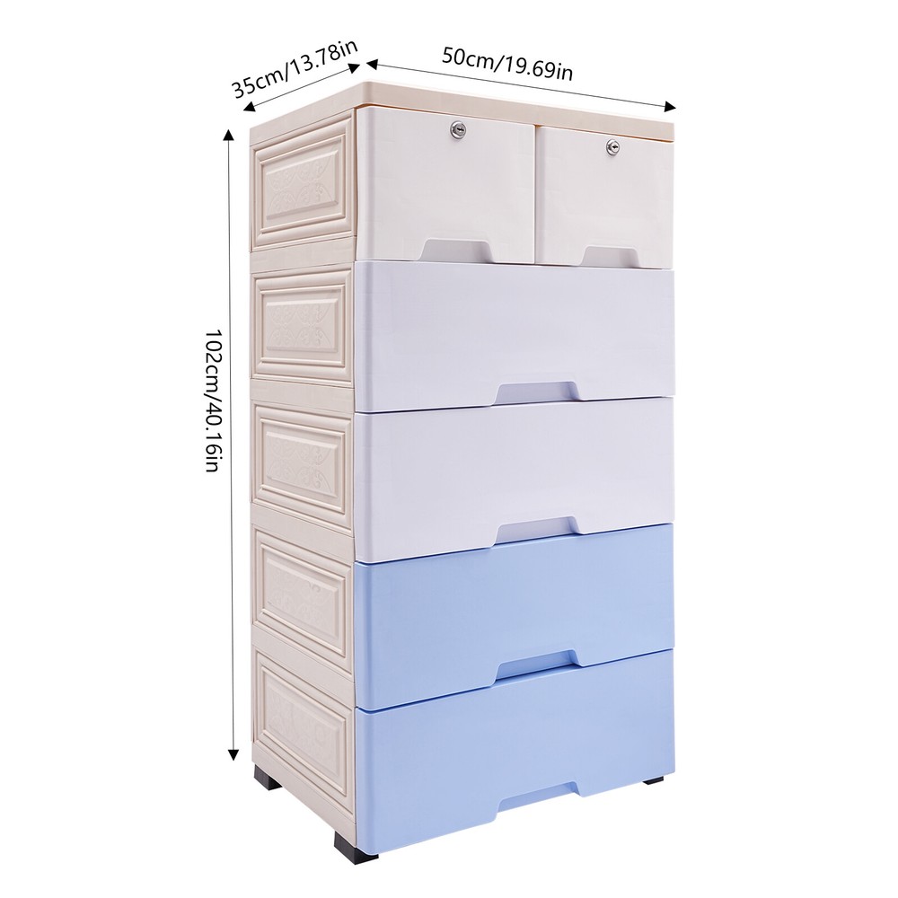 Description Cleanness and tidiness are a good attitude towards life and will put you and your family in a good mood. Our storage cabinet is made of high-quality PP with sufficient storage space and a beautiful and practical design, allowing you to neatly and efficiently organize your belongings and make you feel organized and relaxed. Say goodbye to a cluttered room and enjoy a neater, more efficient life! Details Round Corners& Edges: They can prevent your children from being injured caused by accidental collision. Convenient Handles: Each drawer has a concave handle to help you open or close drawers more easily. Small Pulleys: They are built into the bottom feet for convenient and easy moving of this cabinet. Anti-breakaway Snap: It can prevent the drawer from falling easily after pulling open to improve the safety of use. Specification Color: Gradient Blue Material: PP Process: Injection Molding Style: Modern Pattern: Solid Shape: Rectangular Assembly Required: Yes Installation Type: Floor Standing Number of Drawers: 6 Product Size: 50*35*102cm/19.69*13.78*40.16 inch Package Size: 51.5*49*40.5cm/20.28*19.29*15.94 inch Overall Load Capacity: 20-30kg/44.09-66.13 lbs Gross Weight: 7.9kg/17.42 lbs Net Weight: 6.8kg/14.99 lbs Package Included 1* Storage Cabinet 2Pairs* Keys Other Accessories for Assembly Notes Please note that this product does not include clothes and other storage items. Please allow the slight color difference caused by the shooting light and 1-3cm error due to manual measurement and make sure you do not mind before ordering. Sturdy and Durable: It is made of high-quality PP with an injection molding process, which is eco-friendly, odorless, anti-corrosion, and rust-resistant, ensuring its beauty and long-term use. Life Assistant: The lower 4 large drawers allow you to categorize clothes and other daily necessities to create a cleaner and tidier home environment. The upper 2 lockable drawers can hold important or dangerous items such as scissors and utility knives, and the top platform can hold remote control boards, alarm clocks, potted plants, and other items within reach. It's also at the right height for kids to reach easily and develop their organizing habits. Excellent Load Capacity: The high-quality materials and rectangular construction give it excellent stability and can hold 44.09-66.13 lbs, allowing you to place items with confidence. Minimalist Style: The gradient blue color scheme combines rectangular shapes with clean lines to create a minimalist aesthetic, highlighting a strong modern appeal and adding a touch of sophistication to your room. Simple Installation: With complete installation parts and a simple structure, you can assemble it yourself and enjoy the fun of the installation process. Easy to Clean: Thanks to its smooth surface and simple construction, you can wipe it clean with a damp rag. Ideal Gift: Thanks to its practicality, it will make a fine gift for family, friends, and loved ones on Christmas, housewarming, birthdays, anniversaries, and holidays. Customer Service: We aim to provide quality products and services. If you have any problems, please feel free to contact us. We will reply and solve the problem for you as soon as possible.