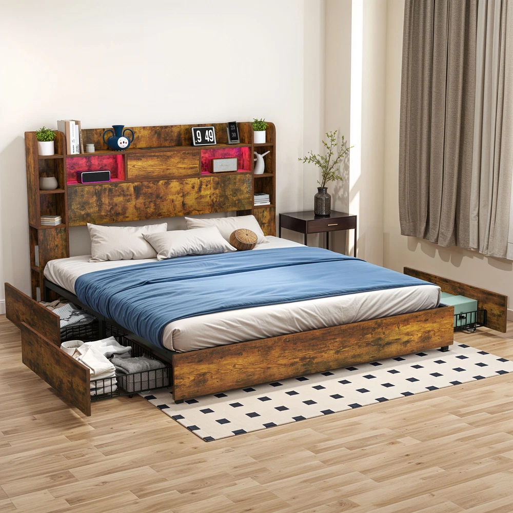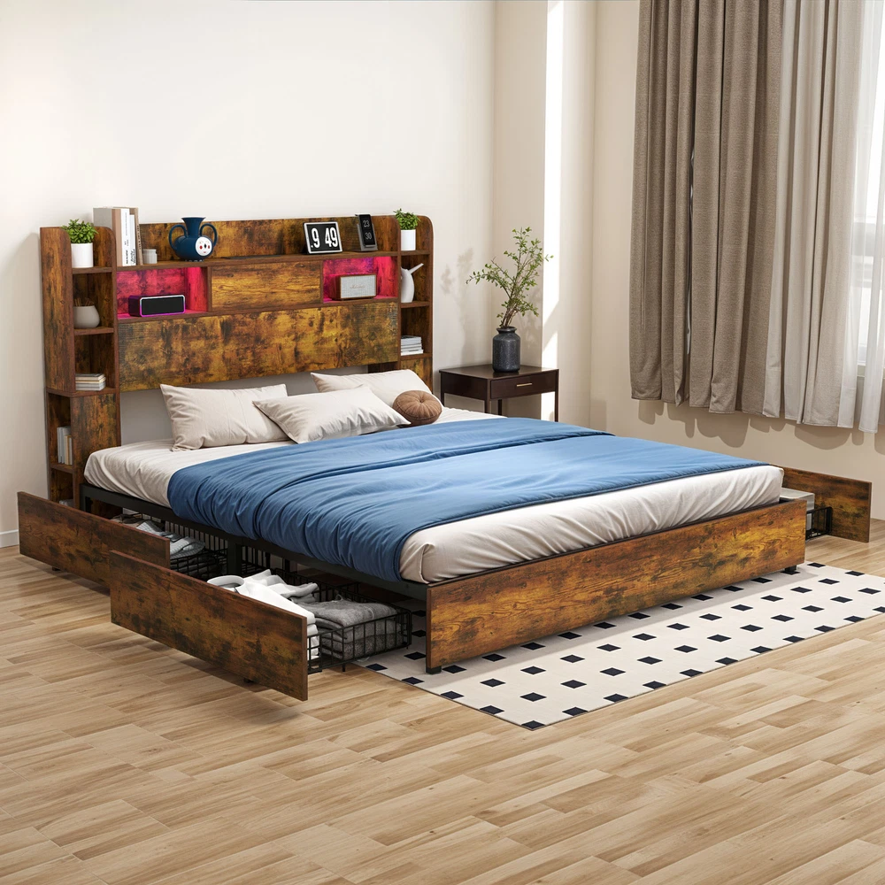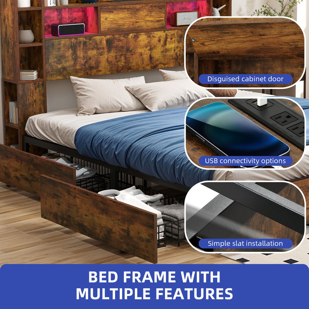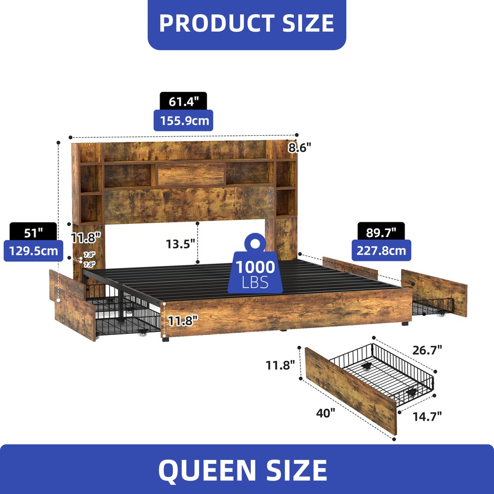Metal Bed Frame 89.7" x 61.4" w/ Headboard Storage & Underbed Hidden 4 Drawers Product Description NOTE: Professional Installation would be Highly Recommended. Description: 1. Material: Metal 2. Color: Burnt Wood 3. Features: 4 Underbed Drawers, Built in Charging Station, Headboard with Storage, USB Port 4. Suitable for: Master Bedroom, Guest Room, Kids Room 5. Warranty: 1 Year 6. Mattress Size: Queen Features: Integrated Storage Headboard: This bed frame features a headboard with multiple shelves, perfect for displaying your favorite books and decor. The clever design helps keep your essentials within arm's reach, enhancing both style and functionality. Advanced Charging Station: With built-in USB and USB-C ports, this frame allows you to conveniently charge your devices. Enjoy the luxury of powering your gadgets directly from your bed, eliminating the need for additional outlets. Spacious Under-Bed Drawers: Four generously sized drawers provide ample storage for clothing, bedding, and more. The easy-glide design ensures smooth operation, helping you maintain a tidy and organized bedroom. Durable Metal Construction: Crafted from high-quality metal with a burnt wood finish, this bed frame offers both strength and elegance. Its robust design ensures long-lasting stability, supporting a restful night's sleep. Versatile Room Suitability: Designed to complement any room, this bed frame is ideal for master bedrooms, guest rooms, and kids' rooms. Its timeless aesthetic and practical features make it a versatile addition to any home. Dimensions: 1. Overall Size: 89.7" x 61.4 x 51" Queen Mattress Package Included: PACKAGE WILL BE SENT THROUGH 2 DIFFERENT SHIPPING 1. Set of Bed Frame (MATTRESS NOT INCLUDED) 2. Assembling Hardware Kits 3. Instruction Manual Book Shipping 1. Normally the item will be dipatched within 1 business day if payment is cleared before 12pm PST. 2. Please verify the correct shipping address in your PayPal account before making the payment. We only dispatch the item to the address that is sent to us at the time of checkout. 3. We don't ship to Hawaii, Alaska, Puerto Rico, APO/FPO/PO Boxes. 4. We don't provide local pick-up service. 5. Normally we will use USPS, UPS, FedEx & LTL to dispatch items. Payment 1. We accept PayPal and credit card. 2. We will ship to the confirmed Paypal shipping address that is provided with the payment only. Return 1. 30 days Money Back Guarantee. 2. Please contact our customer service to receive a RMA form first if want to return the item. 3. All returned items MUST in new condition with the original package. Contact If has any problem, please contact us by sending an ebay message. Our customer service will resolve the problem as soon as possible. On Feb 10, 2025 at 02:34:43 PST, seller added the following information: