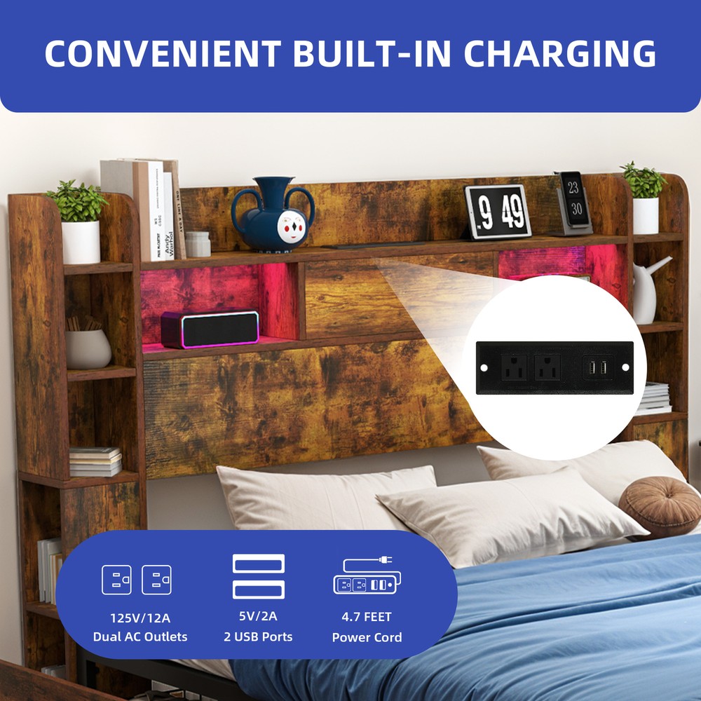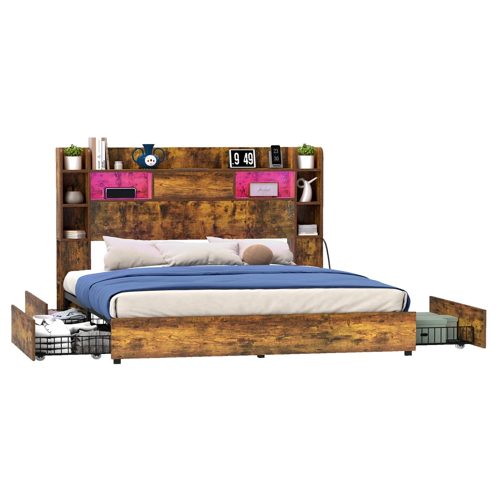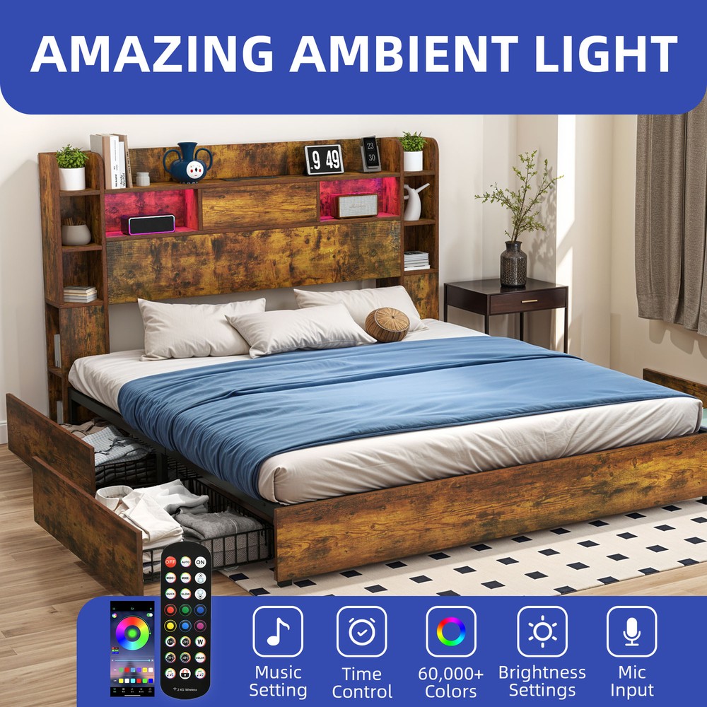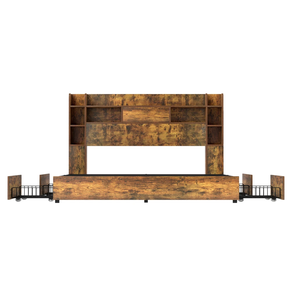 Metal Bed Frame 89.7" x 61.4" w/ Headboard Storage & Underbed Hidden 4 Drawers Product Description NOTE: Professional Installation would be Highly Recommended. Description: 1. Material: Metal 2. Color: Burnt Wood 3. Features: 4 Underbed Drawers, Built in Charging Station, Headboard with Storage, USB Port 4. Suitable for: Master Bedroom, Guest Room, Kids Room 5. Warranty: 1 Year 6. Mattress Size: Queen Features: Integrated Storage Headboard: This bed frame features a headboard with multiple shelves, perfect for displaying your favorite books and decor. The clever design helps keep your essentials within arm's reach, enhancing both style and functionality. Advanced Charging Station: With built-in USB and USB-C ports, this frame allows you to conveniently charge your devices. Enjoy the luxury of powering your gadgets directly from your bed, eliminating the need for additional outlets. Spacious Under-Bed Drawers: Four generously sized drawers provide ample storage for clothing, bedding, and more. The easy-glide design ensures smooth operation, helping you maintain a tidy and organized bedroom. Durable Metal Construction: Crafted from high-quality metal with a burnt wood finish, this bed frame offers both strength and elegance. Its robust design ensures long-lasting stability, supporting a restful night's sleep. Versatile Room Suitability: Designed to complement any room, this bed frame is ideal for master bedrooms, guest rooms, and kids' rooms. Its timeless aesthetic and practical features make it a versatile addition to any home. Dimensions: 1. Overall Size: 89.7" x 61.4 x 51" Queen Mattress Package Included: PACKAGE WILL BE SENT THROUGH 2 DIFFERENT SHIPPING 1. Set of Bed Frame (MATTRESS NOT INCLUDED) 2. Assembling Hardware Kits 3. Instruction Manual Book Shipping 1. Normally the item will be dipatched within 1 business day if payment is cleared before 12pm PST. 2. Please verify the correct shipping address in your PayPal account before making the payment. We only dispatch the item to the address that is sent to us at the time of checkout. 3. We don't ship to Hawaii, Alaska, Puerto Rico, APO/FPO/PO Boxes. 4. We don't provide local pick-up service. 5. Normally we will use USPS, UPS, FedEx & LTL to dispatch items. Payment 1. We accept PayPal and credit card. 2. We will ship to the confirmed Paypal shipping address that is provided with the payment only. Return 1. 30 days Money Back Guarantee. 2. Please contact our customer service to receive a RMA form first if want to return the item. 3. All returned items MUST in new condition with the original package. Contact If has any problem, please contact us by sending an ebay message. Our customer service will resolve the problem as soon as possible. On Feb 10, 2025 at 02:34:43 PST, seller added the following information: