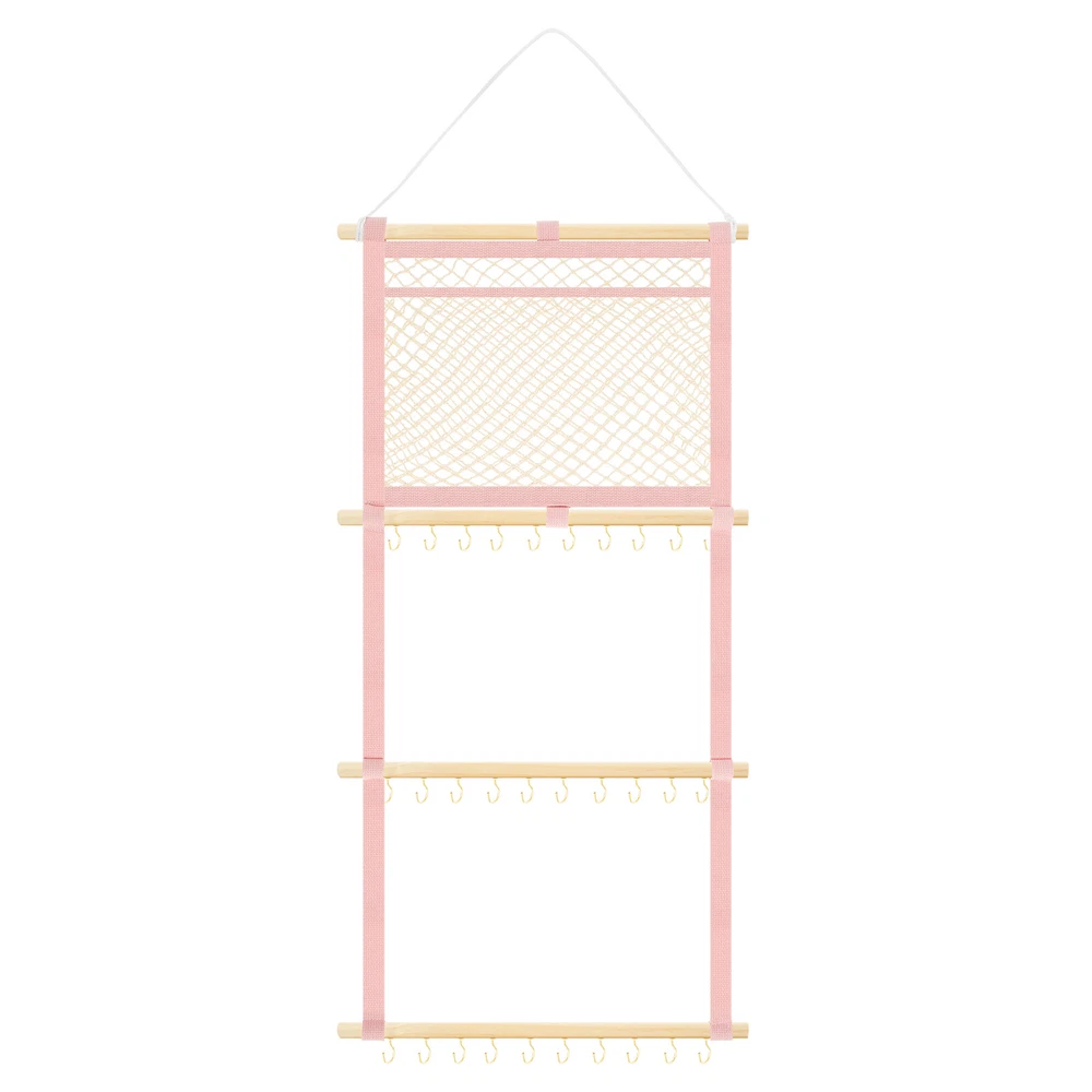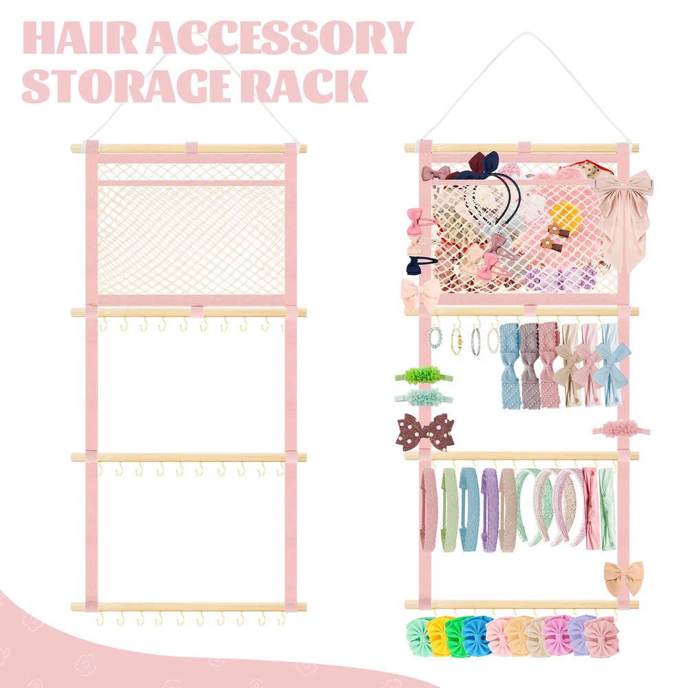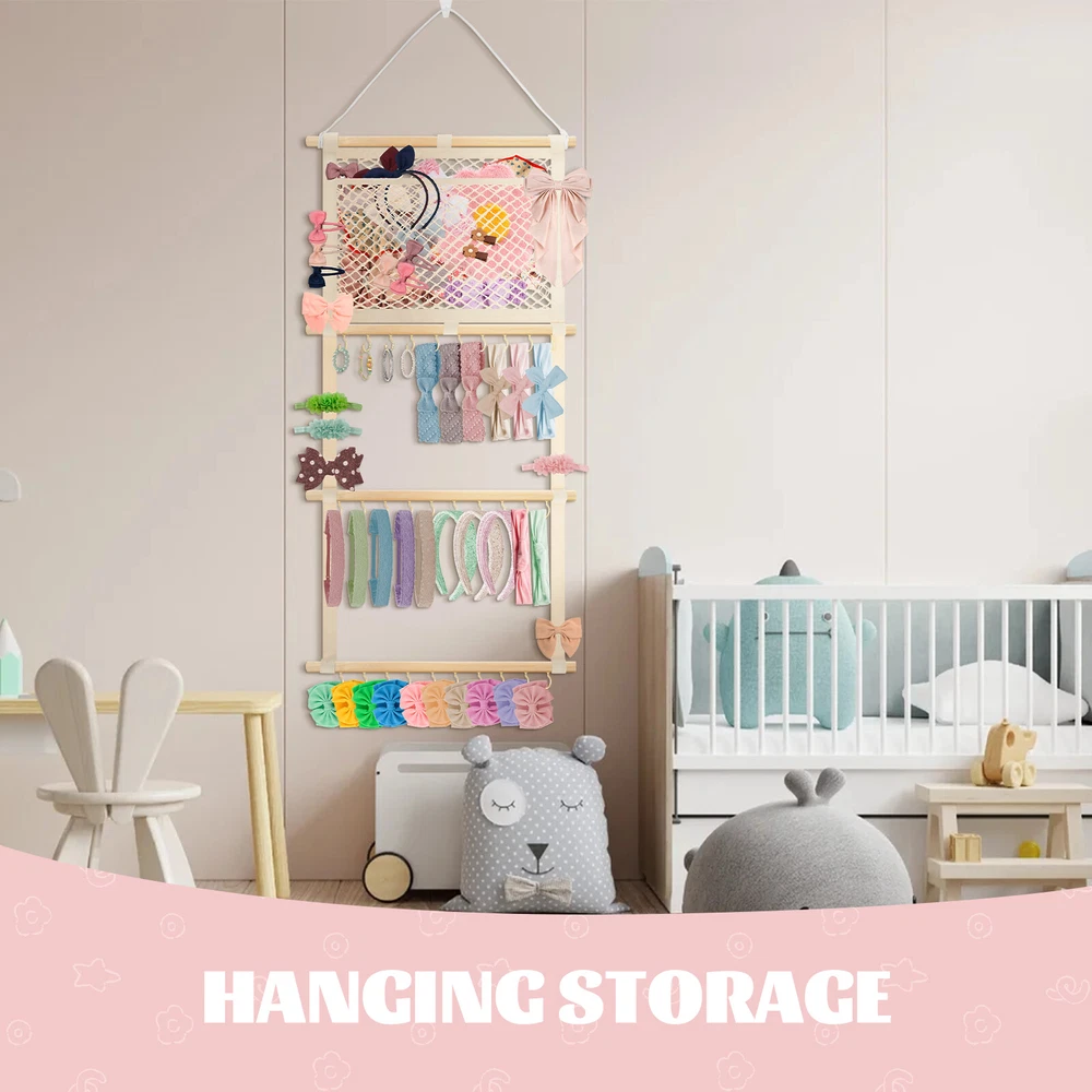 This headband display stand is a game-changer for keeping accessories organized! The sturdy metal hooks and strong cotton canvas mesh hold everything securely without slipping. The smooth wooden sticks add durability while the non-marking nails make wall mounting easy. Perfect for storing baby headbands, bows, or even scarves—saves so much space and looks neat! Highly recommend for its quality and practicality.