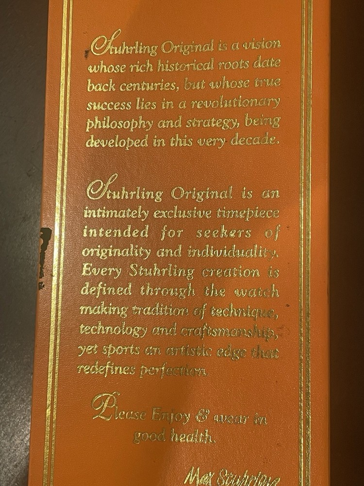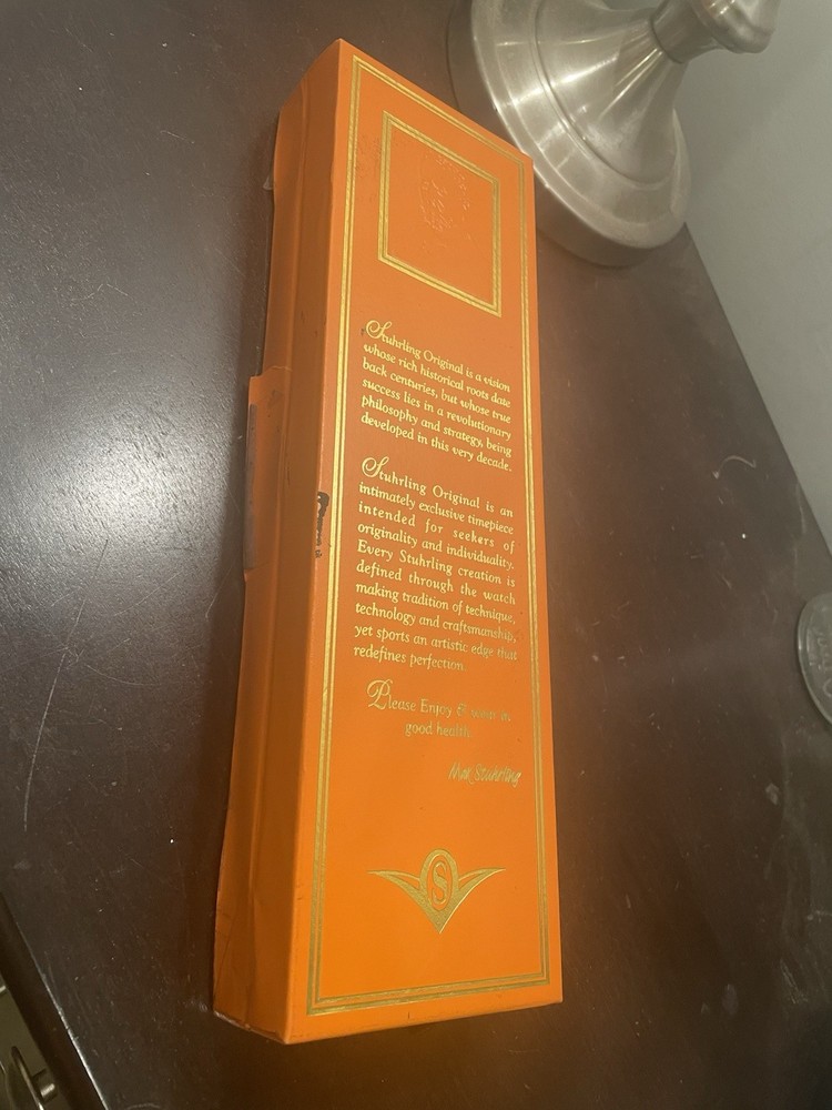 This is an empty STUHRLING watch box. There is a tear on the back side of the box (see photos). Otherwise in good used condition. 11.75” x 3.5” x 1.5”