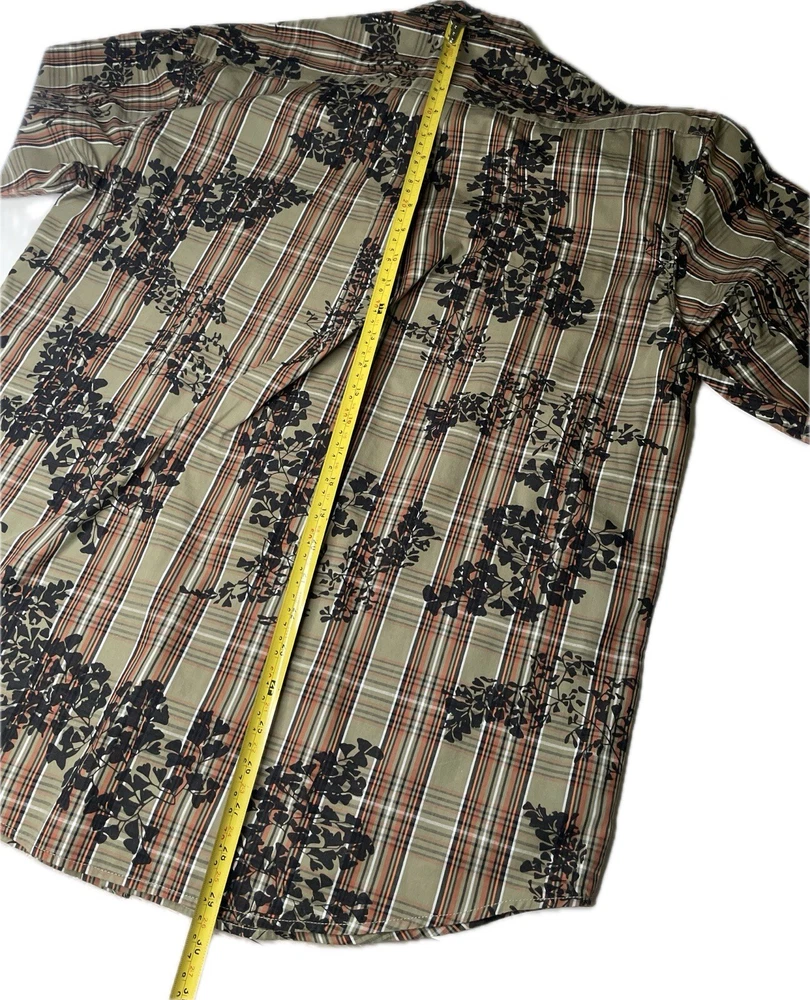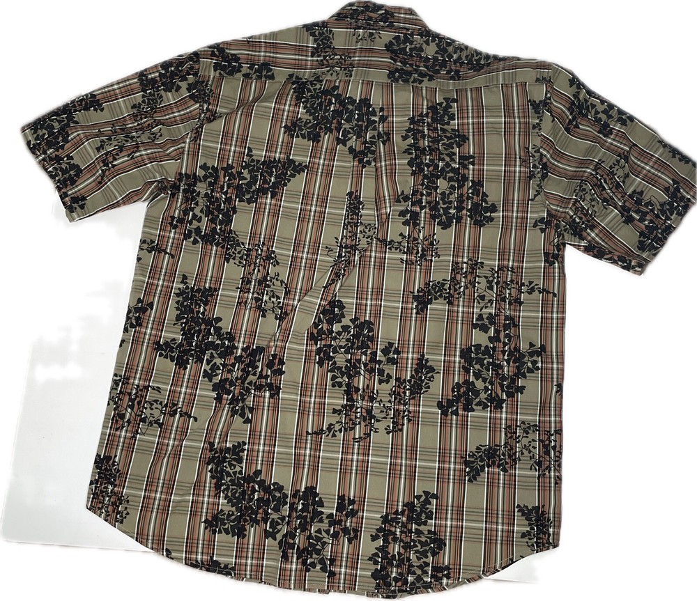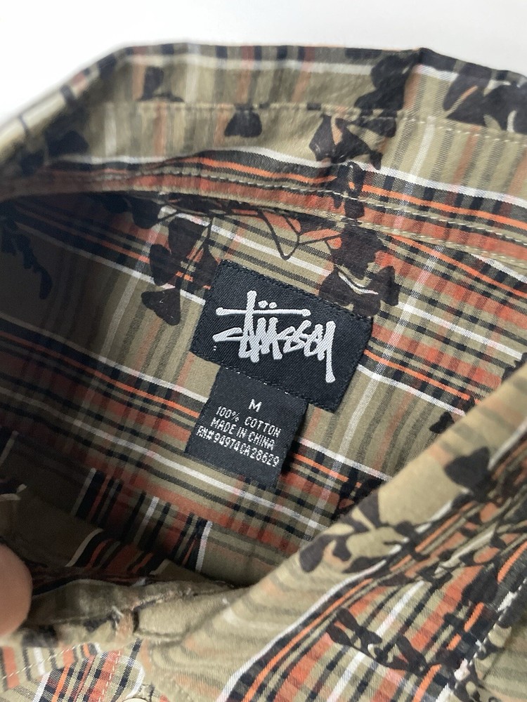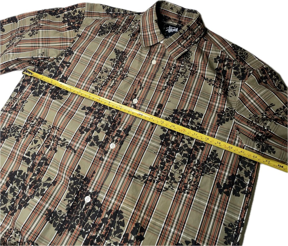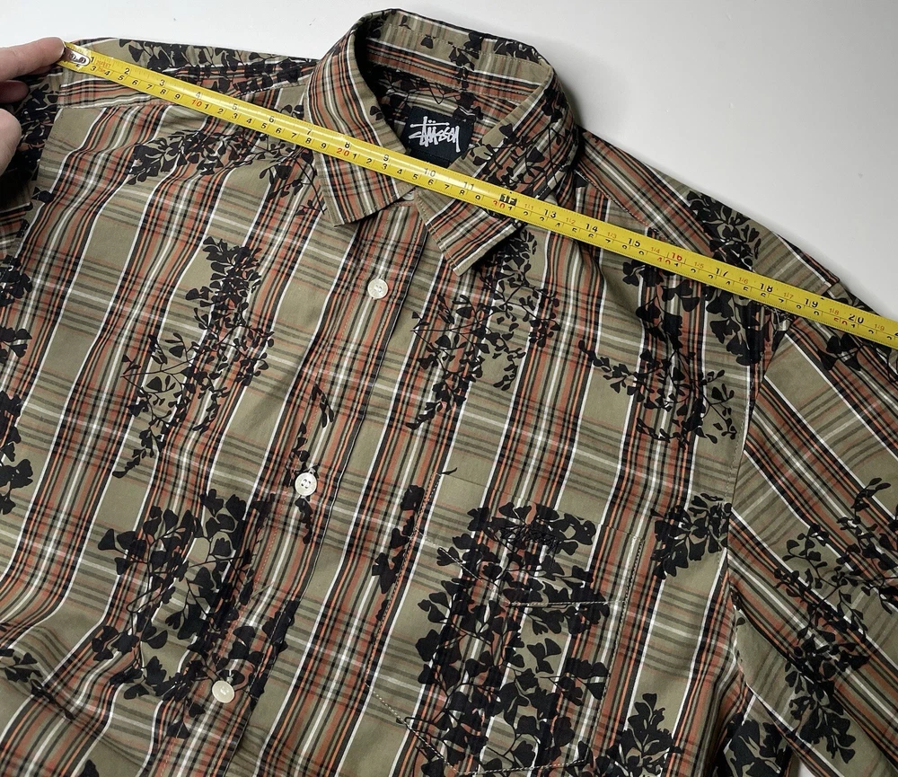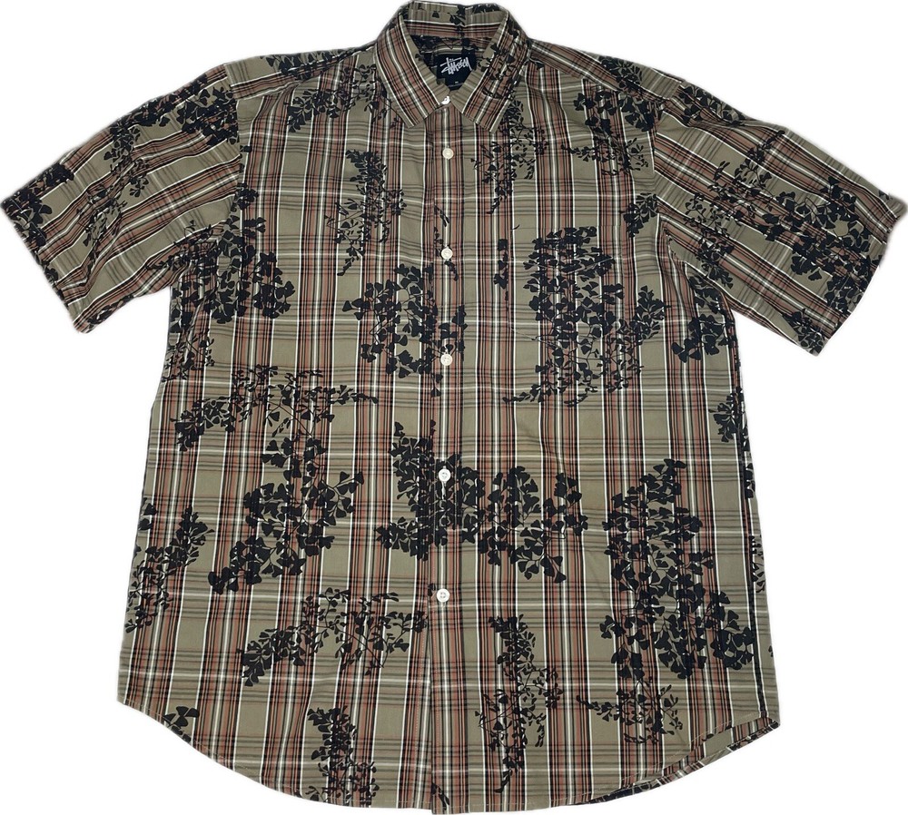 stussy short sleeve Button Down shirt plaid floral Tan Brown M Cotton Pit2pit 22” Shoulders 19” Length 29.5” 100% cotton Excellent condition