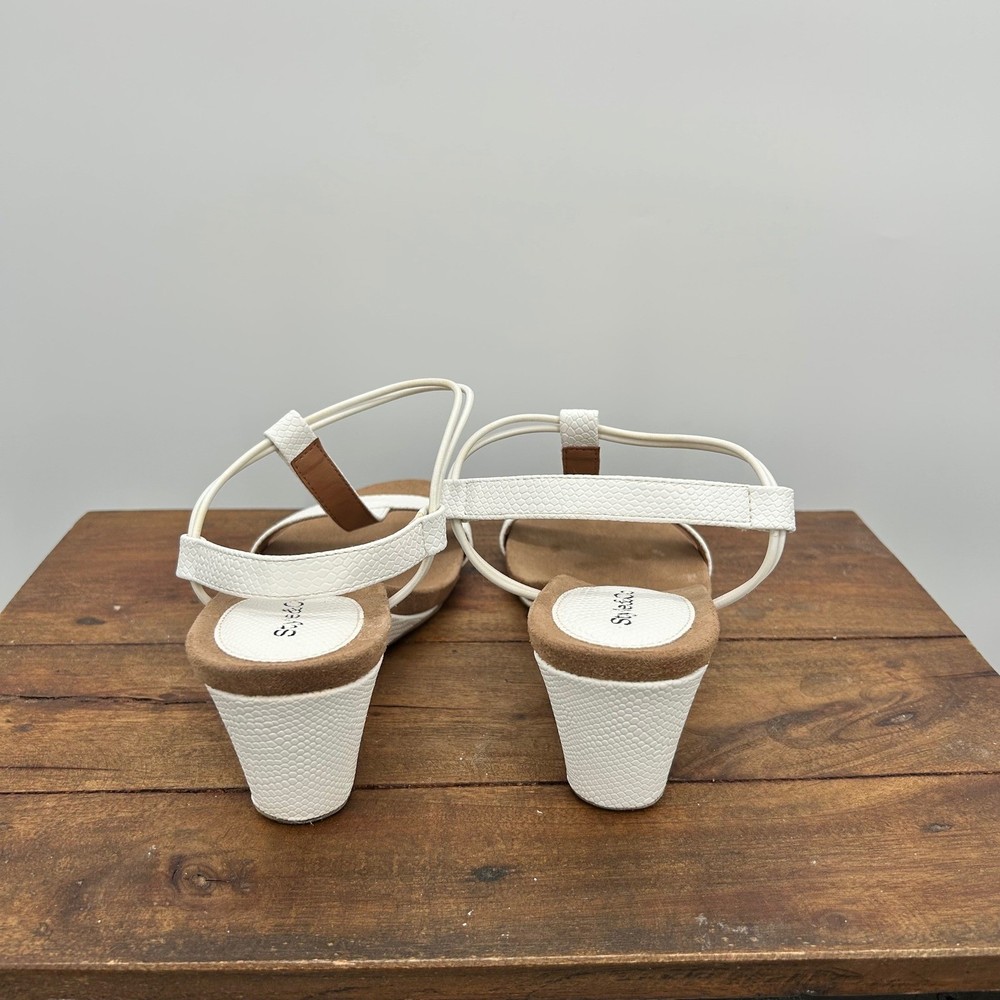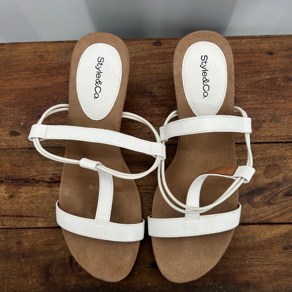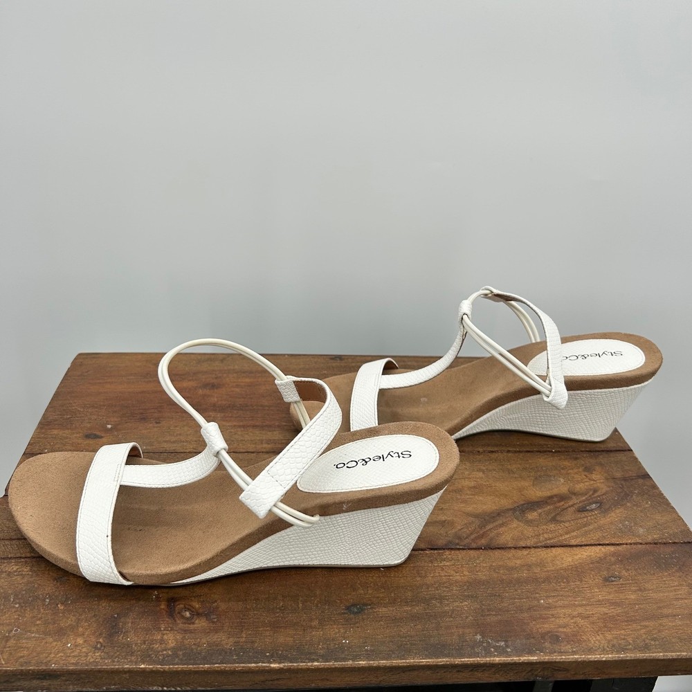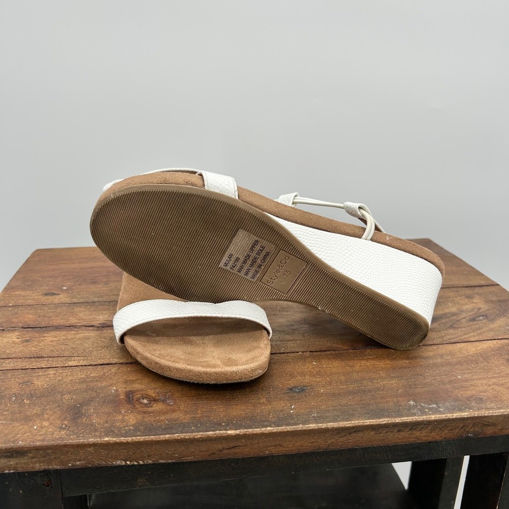 These Style & Co Mulan wedge sandals feature a crisp white textured faux-leather upper with a modern T-strap design and elasticized slingback straps for a comfortable, secure fit. The low wedge heel is wrapped in a matching white snakeskin-embossed material, providing a subtle lift without sacrificing stability. Designed with a cushioned footbed and a durable man-made sole, these versatile sandals are perfect for summer outings, garden parties, or casual office wear. Keywords: Coastal, Summer, Beachy, Minimalist, Snakeskin, Textured, Slingback, Comfort, Casual, Vacation, Resortwear, Modern, T-Strap, Low Wedge, White Sandals Fast Shipping. Please Check all photos!