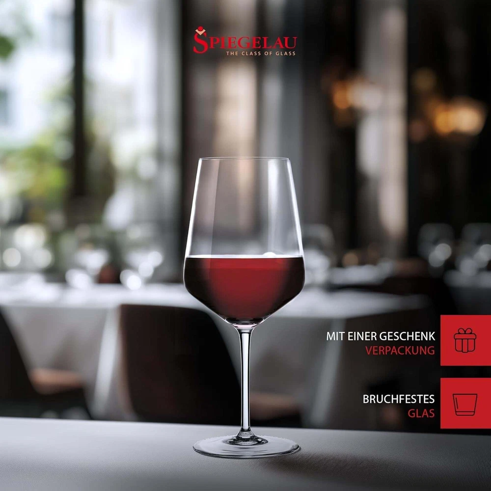EXQUISITE RED WINE GLASS SET – This modern set of red wine glasses will take your sipping experience to a new level. Designed with a narrow rim and generous bowl to enhance the aroma of reds, this crystal stemware is ideal for entertaining. HIGH-END STEMWARE WITH TIMELESS ELEGANCE – The top choice for wine connoisseurs and world-class hospitality, this award-winning wine glass set elevates your favorite red wine. These premium wine glasses are the perfect gift for a wine lover. FLAWLESS LEAD-FREE CRYSTAL – Spiegelau’s expertise results in unblemished, brilliantly clear glassware. Lead-free and seamless, this refined set of wine glasses highlights the natural hue and viscosity of each wine for a holistic tasting experience. DISHWASHER SAFE – Spiegelau’s Platinum Glass process ensures brilliance and crystal clarity. Even when run through 1,500 dishwasher cycles during testing processes, these wine glasses remained flawless, without scratching, fogging, or loss of brilliance. 500 YEARS OF GERMAN CRAFTSMANSHIP – Spiegelau brings centuries of expert craftsmanship to glassware. Spiegelau is part of a proud tradition of elegance and quality, yet perfectly at home with modern lifestyles. Enjoy wine in the glass it deserves. The wine glass set that you sip your favorite red wines matters. With how much wine costs, having a glassware that really shows it off and makes it taste its best is what every red wine deserves. The Spiegelau Style Red Wine Glasses are carefully crafted with a modern design made to allow your red wine to breathe. This helps to enhance the wine by unlocking the aromatics and flavors that were locked away during its bottling. The large 22.2 oz. capacity allows the wine to sit low in crystal stemware, which allows for ultimate breathability. This glassware set includes 4 glasses, which is the perfect foundation every wine lover needs in order to enjoy sips with their favorite people. With exemplary construction, these red wine glasses are made to last. The sturdy construction and finish make these vessels certified dishwasher safe to make cleanup after a party or event simple. These glasses will shine just as bright as the day you bought them after running them through the dishwasher after each use. The modern design also helps them to match with your existing crystal glassware that you use with your wine collection. Adding four more high-quality wine glasses to your collection is a great way to expand your barware and to entertain all of the special people in your life. So, whether you are a wine expert, or just starting out on the journey to wine loving and tasting, enhance your wine experience with this amazing wine glass set. Care instructions - No. Style is a series of glass with a very modern conception of form. With its distinctive silhouette give the glasses any table an air of style and elegance.