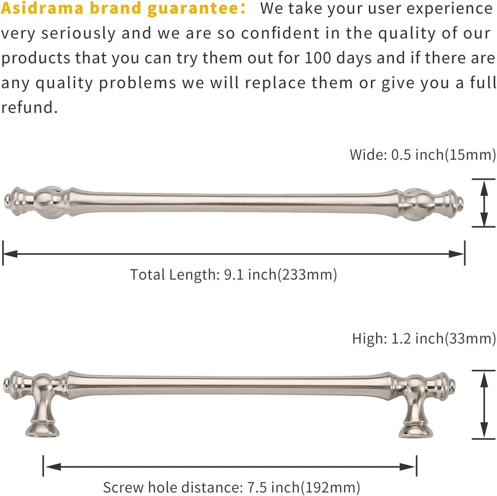 Stylish 10-Pack 7.5 Inch Brushed Satin Nickel Cabinet Pulls - Easy Installation ‹ › ‹ › ‹ › ‹ › ‹ › ‹ › ‹ › ‹ › ‹ › Stylish 10-Pack 7.5 Inch Brushed Satin Nickel Cabinet Pulls Transform your living spaces with our exquisite set of 10 Brushed Satin Nickel Cabinet Pulls, meticulously designed to combine functionality with timeless elegance. Key Features: Each pull measures 7.5 inches (192mm) in hole centers, ensuring a snug fit on your cabinets. Overall length of 9.1 inches (233mm), with a width of 0.5 inches (15mm) and a projection of 1.2 inches (33mm). Crafted from robust zinc alloy, featuring a stylish and durable Brushed Satin Nickel finish. Standard screw spacing facilitates effortless installation and replacement. Individually packaged to prevent scratches and damage during transit. Benefits: Elevate the aesthetics of your kitchen or bathroom with a modern and chic finish. Heavy-duty construction guarantees longevity and resilience, perfect for frequent use. Compatible with a wide array of furniture—a perfect fit for cabinets, closets, cupboards, drawers, dressers, doors, and wardrobes. Simple DIY upgrade allows you to personalize your home without the hassle of a complete renovation. Confidence backed by brand assurance—you’re covered in the unlikely event of quality issues. Why Choose Our Cabinet Pulls? Enhance your home's appeal with our Stylish 10-Pack 7.5 Inch Brushed Satin Nickel Cabinet Pulls. Their elegance, combined with easy installation and a robust build, makes them the perfect choice for your cabinet hardware needs. Don’t settle for ordinary; let your cabinetry shine! Upgrade your space today with this captivating cabinet hardware set and experience a stylish transformation in your interiors. Shipping Free & Fast Shipping - We offer free shipping to most of the USA with a normal delivery time of 3-7 days. However, due to the current situation, additional delivery time (up to 3 weeks) may be required for some items. Alternative Carriers - We may use alternative carriers (e.g. USPS, FedEx, UPS, etc.) to ensure your package arrives safely and on time. Due to the use of multiple carriers, we are unable to provide a tracking number automatically. Handling Time - Orders are processed and shipped within 1-2 business days of receiving cleared payment. Shipping Restrictions - Shipping to Alaska, Hawaii, Puerto Rico, Guam, and other US territories may incur shipping charges or delivery restrictions. Please contact us before ordering, or your order can be refunded/cancelled. State Restrictions - There may be restrictions based on your state of purchase. For example, certain items may not be shipped to California due to state regulations. Contact for Tracking Updates - If you require tracking updates or have any concerns about the delivery of your order, please feel free to contact us, and we will be happy to assist you. Return 30-Day Hassle-Free Returns - We want you to be completely satisfied with your purchase. If you are not, you can return the item within 30 days of receiving it for a full refund or exchange. Easy Return Process - To start a return, simply contact us and we will provide you with a prepaid return shipping label and detailed instructions. Restocking Fee - There are no restocking fees for returns. However, the buyer is responsible for return shipping costs if the return is not due to a seller's error. Refund Processing Time - Refunds will be processed within 5 business days of receiving the returned item in its original condition. Payment We accept all major credit cards, PayPal, and Apple Pay for your convenience. Your payment information is secure and encrypted to ensure a safe and seamless transaction. Please complete your payment within 3 days of purchase to avoid any delays in shipping. Feedback Your feedback is extremely important to us. We strive to provide the best products and customer service possible. If you are satisfied with your purchase, please take a moment to leave us a positive review. If you have any concerns or issues with your order, please contact us before leaving negative feedback. We are committed to resolving any problems and ensuring your satisfaction. Contact Us If you have any questions or concerns, please feel free to reach out to our customer support team. You can contact us through the eBay messaging system. We are available Monday to Friday, 9:00 am to 5:00 pm EST, and we will do our best to respond to your inquiry within 24 hours. Buy it now and enjoy a pleasant shopping experience! UPC: Not Set Unit Quantity: 10 Material: Zinc,Metal Suitable For: Cupboard,Cabinets,Wardrobe,Closets,Drawers,Dressers,Doors Brand: Unbranded Type: Cabinet Pull Color: Brushed Satin Nickel Item Length: Not Set Finish: Brushed Item Diameter: 1 in MPN: Not Set Number in Pack: 10 Style: Modern Center-to-Center Measurement: 7.5 in Country/Region of Manufacture: Not Set Extension Length: Not Set Door Handing: Not Set Manufacturer Warranty: Not Set Unit Type: lb Fixings Supplied: Not Set