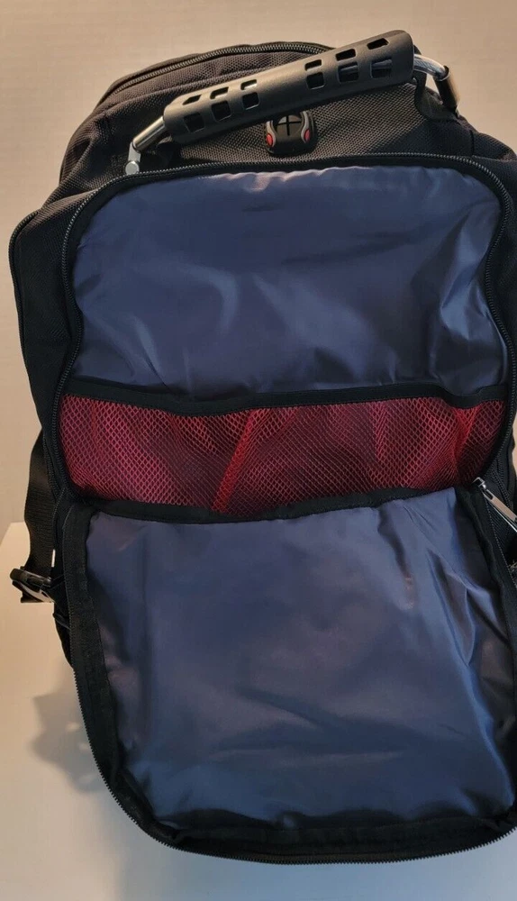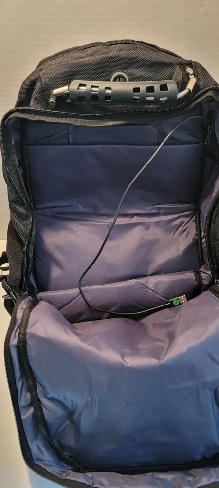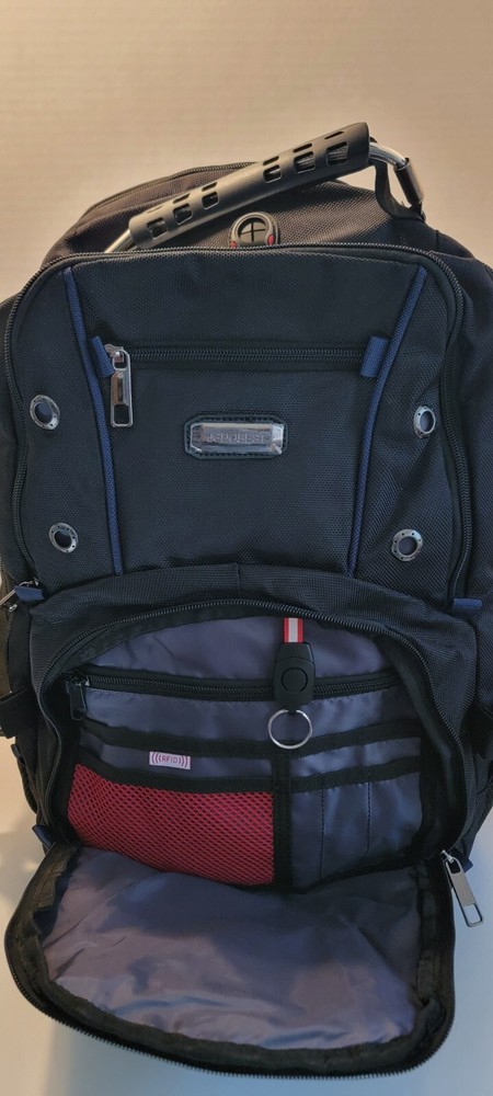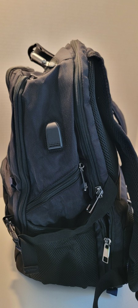 Travel Laptop Backpack 17.3 In Extra Large Capacity College bag Black Blue Trim Looks to be brand new but cannot say 100%. It still has the plastic protector on the brand tag. Large capacity and organized: men travel backpack owns 20 independent pockets for large storage and organization for small items. 3 spacious main multi compartments with many hidden pockets can accommodate lots of stuffs like 2 laptop, travel accessories, clothes, stationery, cord organizer, side deep Zipper pocket for Easy access essentials, side Elastic net pockets conveniently hold travel gear umbrellas or water bottles. Ideal bag backpack perfectly RFID POCKET TSA FRIENDLY: The anti-thief back pocket with RFID blocking can protect your personal information from being stolen (e.g. credit cards, passports, and driver's license). Tsa approved and multipurpose: at Checkpoint, unfolds the extra large backpack 90 180 degree making you quickly through the airport security and keep items tidy, exclusive designed for airplane traveling. The big backpack is perfect for indoor outdoor activities.Served as large backpack Practical and convenient: external USB port with set-in charging cable offers convenient charging your cellphone and other electronic devices everywhere. A hole for headphone outside gives easy access to Earphone usage. Also, the 17.3inch backpack with a sturdy rugged handle with steel cable on the top for carrying, side compression straps keep the exclusive backpack at whatever size you requires. As a men women's backpack, you will enjoy It's fashionable, comfortable and convenient everywhere EXTRA LARGE MATERIAL: Size of extra large backpack: 19. 0x14. 6x10. 2 (inches), Capacity: 45L, separate padded laptop compartment hold for 13, 14, 15, 15. 6, 17 and up to 17.3 inch Laptop backpack/computers for adults, women, men and teacher. The scan smart laptop backpack made from polyester fabric shockproof with high density nylon lining for better TEAR and WATER RESISTANT and heavy duty backpack XL laptop backpack Comfortable: Tech backpack with back U shaped three dimensional ventilation design help for the air convection, ventilation and heat elimination. Comfortable wide breathable mesh shoulder straps with plentiful sponge pad help relieve the stress from your shoulder. Both sides of the shoulder strap with lanyard design, can hang sunglasses and other small pendants. Premium Big bags for men Also computer backpack for women.And it is a ideal present for men women