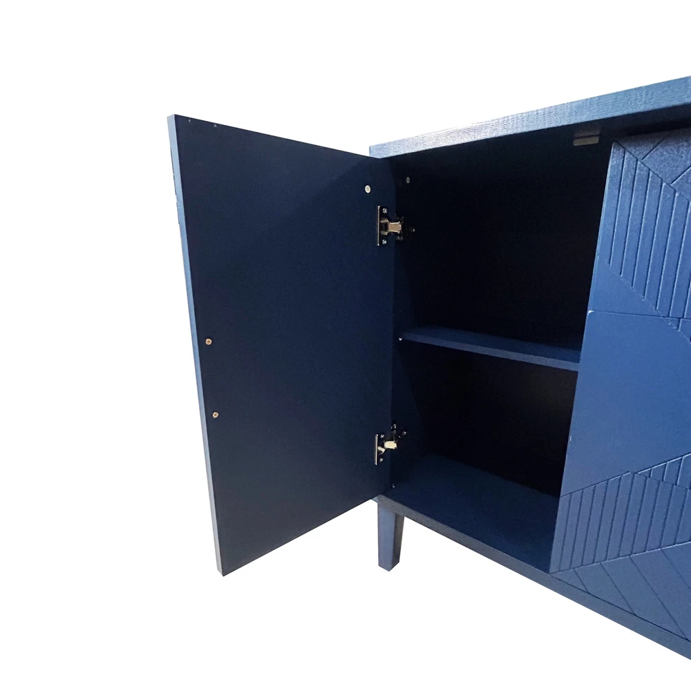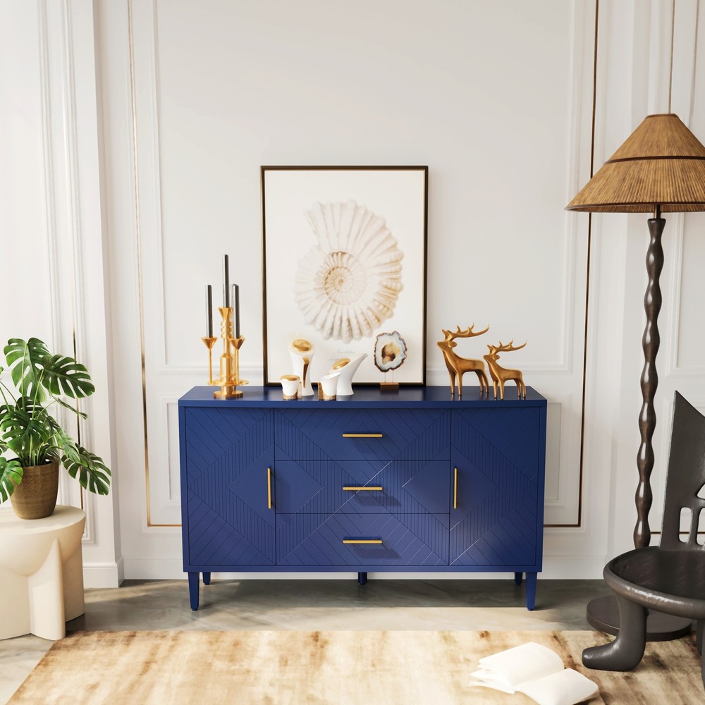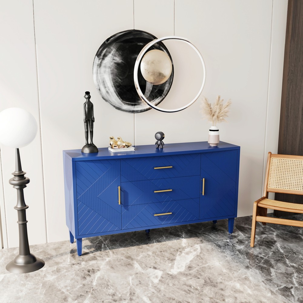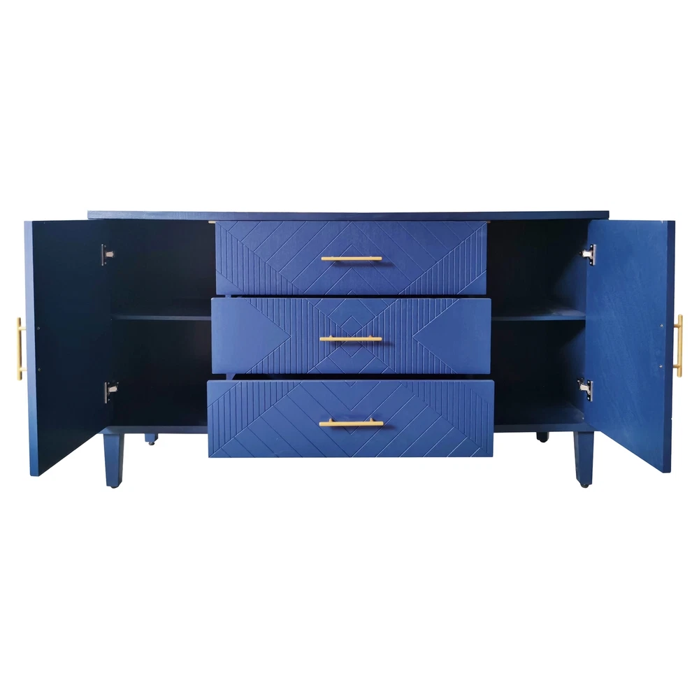 Product Features Exquisite Carving: Elevate your living space with the intricate carved surface of this cabinet, adding a touch of elegance and sophistication to any room. Craftsmanship and Durability:Made of MDF with solid wood veneer, this cabinet is not only visually appealing but also built to last.The sturdy solid wood legs provide stability and support. Curved Desktop: The curved design of the desktop, with a widened extension effect in the center section, provides additional workspace while maintaining a sleek and modern aesthetic. Quality Hardware:Enhanced with zinc alloy handles, the cabinet exudes a sense of luxury and refinement, complementing its overall design. Ample Storage Space:With two separate enclosed cabinets and three large drawers, this cabinet offers abundant storage space to keep your belongings neatly organized and easily accessible. Versatile Usage: Whether you place it in your living room, dining room, or bedroom, this versatile cabinet adds both storage and style to any space. Use it as a display case for your cherished collectibles or as a functional storage solution for everyday items. Built-in Adjustable Shelf: The cabinet is equipped with adjustable shelf that can be set at three different heights, providing you with customizable storage solutions to accommodate various items. Safe and Easy to Assemble:With simple assembly instructions and easy-to-clean surfaces, this storage cabinet is both quick and hassle-free to put together and maintain, saving you time and effort in the long run.Even after years of use, it will not fade or damage, maintaining a good appearance.The storage cabinet are equipped with anti-tipping devices to protect you and your family from potential hazards. Description Features: Experience the perfect blend of style and functionality with this exquisite cabinet, designed to enhance your home décor while offering practical storage solutions.Its exquisite craftsmanship, ample storage space, versatile functionality, and sturdy construction make it a must-have addition to any room. Whether you place it in your living room, dining room, or bedroom, this cabinet is a versatile piece of furniture. It can be used as a stylish storage solution, a display case for your treasured collectibles, or even as a media console for your entertainment devices. Specifications: Color Navy Blue Material MDF with solid wood veneer+pine legs Handle material zinc alloy Product Dimension 55.12"L x 15.75"-17.72"W x 32.68"H Weight Capacity Tabletop: 100lbs Shelf: 60lbs Drawer: 20lbs Shelf adjustable or not Yes Assembly Required Yes Package Number 1 Notice: 1. Due to lighting or display, the actual product color may differ slightly from the image. 2. Manual measurement was used, and there may be some reasonable errors. Curved Desktop: The curved design of the desktop, with a widened extension effect in the center section, provides additional workspace while maintaining a sleek and modern aesthetic.