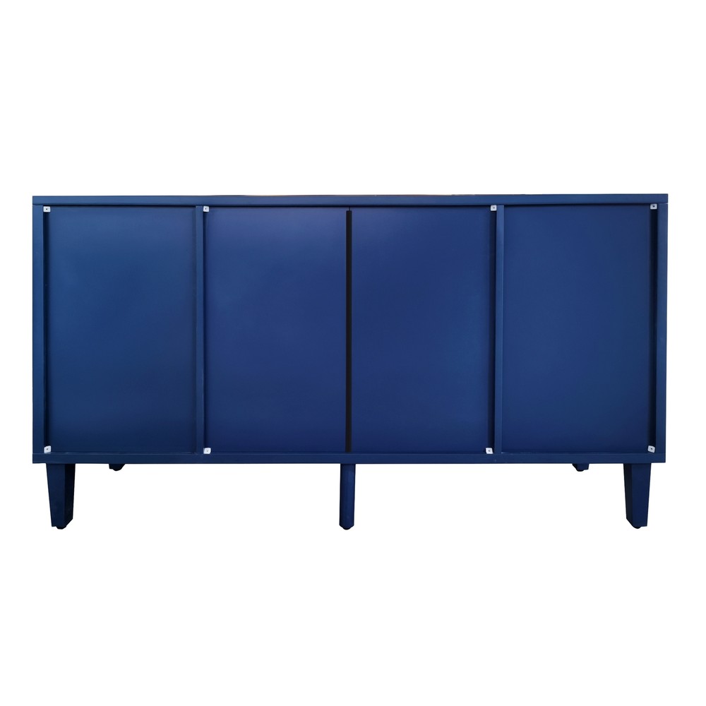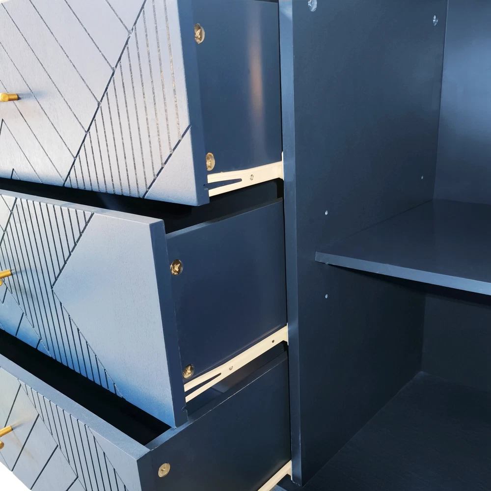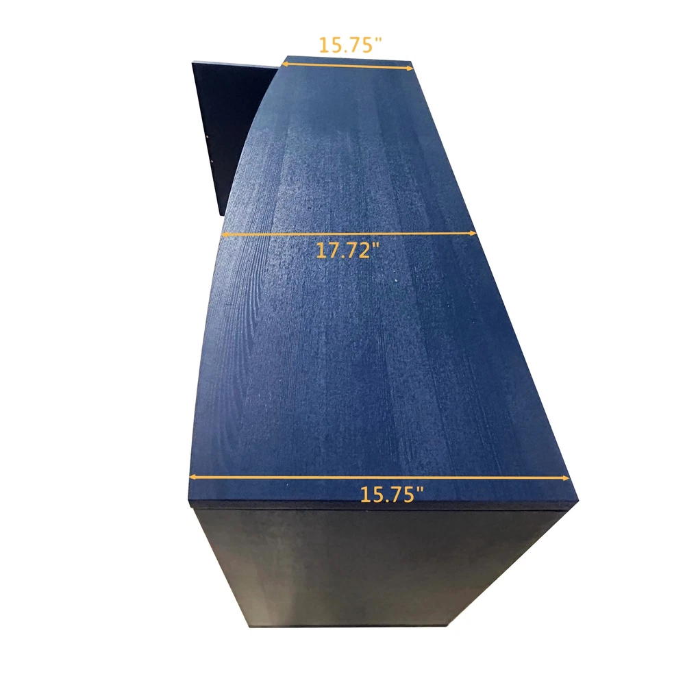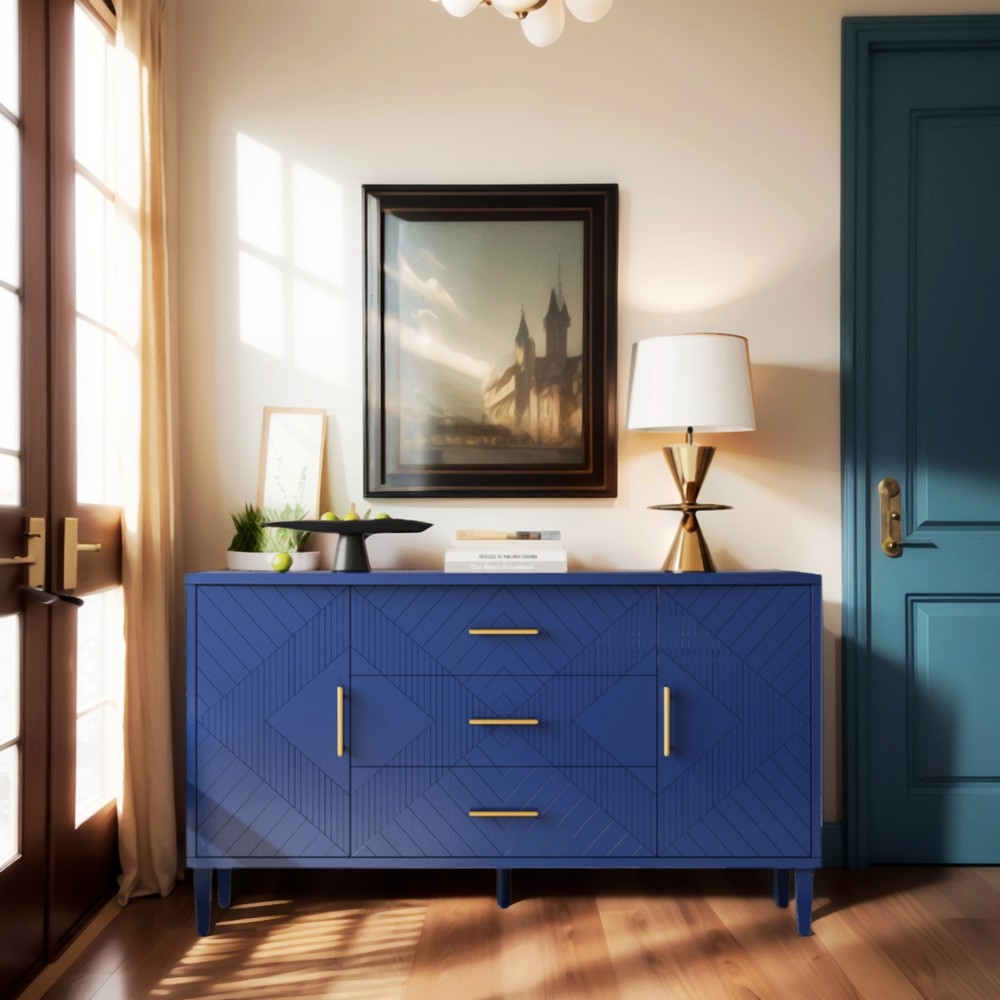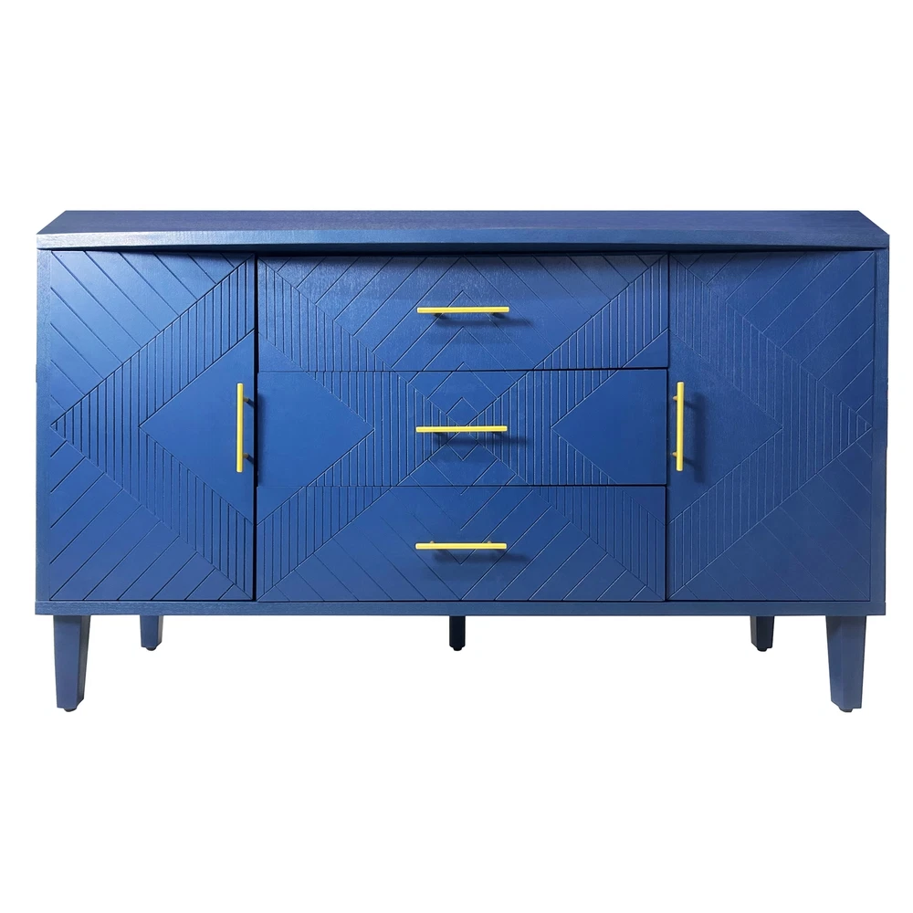 Product Features Exquisite Carving: Elevate your living space with the intricate carved surface of this cabinet, adding a touch of elegance and sophistication to any room. Craftsmanship and Durability:Made of MDF with solid wood veneer, this cabinet is not only visually appealing but also built to last.The sturdy solid wood legs provide stability and support. Curved Desktop: The curved design of the desktop, with a widened extension effect in the center section, provides additional workspace while maintaining a sleek and modern aesthetic. Quality Hardware:Enhanced with zinc alloy handles, the cabinet exudes a sense of luxury and refinement, complementing its overall design. Ample Storage Space:With two separate enclosed cabinets and three large drawers, this cabinet offers abundant storage space to keep your belongings neatly organized and easily accessible. Versatile Usage: Whether you place it in your living room, dining room, or bedroom, this versatile cabinet adds both storage and style to any space. Use it as a display case for your cherished collectibles or as a functional storage solution for everyday items. Built-in Adjustable Shelf: The cabinet is equipped with adjustable shelf that can be set at three different heights, providing you with customizable storage solutions to accommodate various items. Safe and Easy to Assemble:With simple assembly instructions and easy-to-clean surfaces, this storage cabinet is both quick and hassle-free to put together and maintain, saving you time and effort in the long run.Even after years of use, it will not fade or damage, maintaining a good appearance.The storage cabinet are equipped with anti-tipping devices to protect you and your family from potential hazards. Description Features: Experience the perfect blend of style and functionality with this exquisite cabinet, designed to enhance your home décor while offering practical storage solutions.Its exquisite craftsmanship, ample storage space, versatile functionality, and sturdy construction make it a must-have addition to any room. Whether you place it in your living room, dining room, or bedroom, this cabinet is a versatile piece of furniture. It can be used as a stylish storage solution, a display case for your treasured collectibles, or even as a media console for your entertainment devices. Specifications: Color Navy Blue Material MDF with solid wood veneer+pine legs Handle material zinc alloy Product Dimension 55.12"L x 15.75"-17.72"W x 32.68"H Weight Capacity Tabletop: 100lbs Shelf: 60lbs Drawer: 20lbs Shelf adjustable or not Yes Assembly Required Yes Package Number 1 Notice: 1. Due to lighting or display, the actual product color may differ slightly from the image. 2. Manual measurement was used, and there may be some reasonable errors. Curved Desktop: The curved design of the desktop, with a widened extension effect in the center section, provides additional workspace while maintaining a sleek and modern aesthetic.