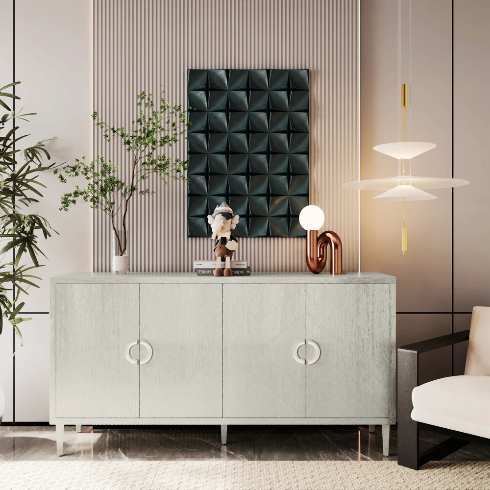 Product Features Durable Construction: Made of high quality MDF with solid wood veneer and pine legs, this cabinet is sturdy and durable, providing long-lasting use for all your storage needs. Contemporary & Concise Style: The 4 doors are accentuated by sculpted lines and zinc alloy semi-circular pulls. The champagne color scheme giving it a minimalist and stylish appearance that is perfect for your personal taste and interior decoration, perfectly matching most home decor. Versatile Use: Whether you need to store clothes, files, tools, or other items, this storage cabinet can accommodate them all, making it a versatile solution for all your storage needs. Reasonable Load-bearing Capacity:In order to meet a variety of requirements in your daily life, the load-bearing capacity setting of this cabinet is reasonable and practical. The load-bearing capacity of the tabletop is 80 pounds. In that case, you can put most of daily sundries on the tabletop without worried about the load-bearing issues. The load-bearing capacity of the cabinet layer board is 60 pounds. Description Notice 1. Due to the material the color of the product will be slightly different in different light. 2. Due to lighting or monitor display, the color of the real product may be slightly different from the image. 3. Manual measurement has been used, and there may be some reasonable errors. Specifications Color champagne/Navy Blue Material MDF with solid wood veneer+ pine legs Product Dimension 59.84"L x 15.75"W x 32.48"H Weight Capacity Tabletop: 80lbs Shelf: 60lbs Assembly Required Yes Package Number 1