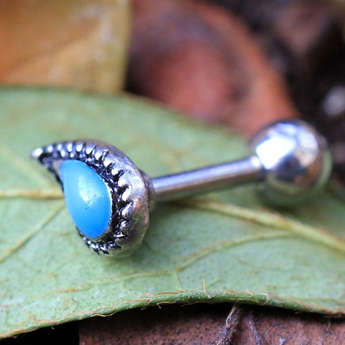 • Cartilage / Tragus Earring with a Teardrop design • Aqua color enamel on an ornate design teardrop • Bar Thickness : 16GA | 1.2mm • Bar Length : 1/4' | 6mm • Teardrop Size : 4.5(L) x 8(W)mm • Ball Size : 4mm • Thread Type : Externally Threaded • Materials : 316L Stainless Steel, Zinc Alloy, Enamel