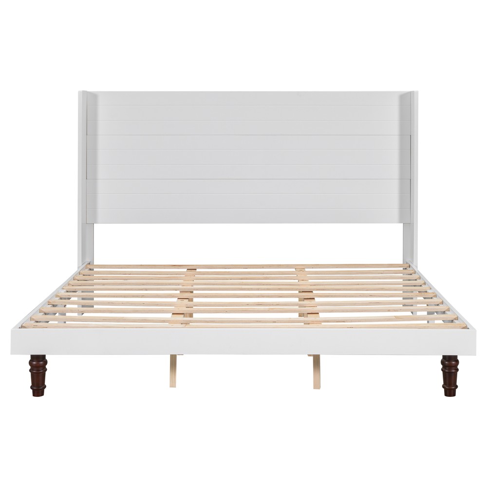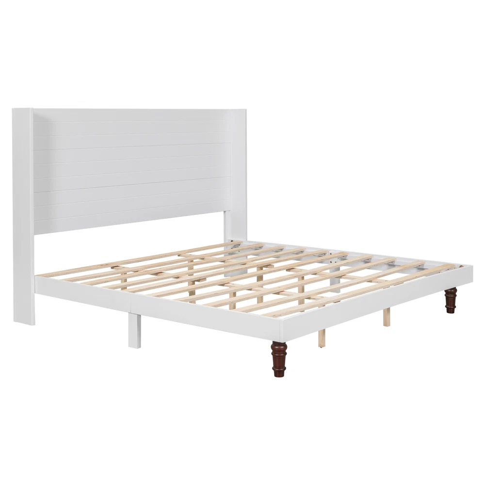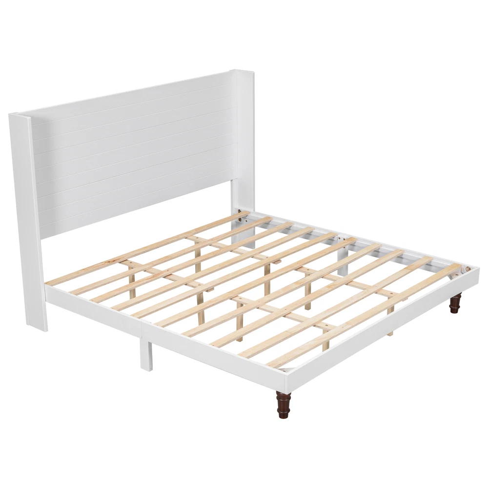Stylish Bed Frame,54 "High Headboard Bed King Size White Bed Frame for Bedroom Features Stylish High Headboard Design: The 54-inch high headboard not only adds elegance and sophistication to your bedroom decor, but also provides extra back support, making it ideal for reading or relaxing in bed. High quality materials: Constructed of high quality MDF, plywood, rubber wood and pine, this bed frame ensures durability and long-lasting support for a restful night's sleep. Moreover, the load-bearing capacity of this bed is reasonable and practical, and the load bearing capacity of the bed is 800 lbs. Variety of options: With two colors and two sizes to choose from, the high headboard bed can accommodate a variety of room sizes and personal preferences, making it perfect for any space. Minimalist Aesthetic:With its simple, clean design, the High Headboard bed blends effortlessly with modern and traditional decor to enhance the overall ambiance of your bedroom. Description Notice 1.Real Product's Color may be a little different from the image due to the lighting or monitor's display. 2.Manual measurement has been used, there may be some reasonable error. Description Color White Material MDF, plywood, rubber wood and pine Size King Product Dimension 82.5"L x 80.1"W x 54"H Weight Capacity 800 lbs Numbers of Package 1 Assembly Required Yes