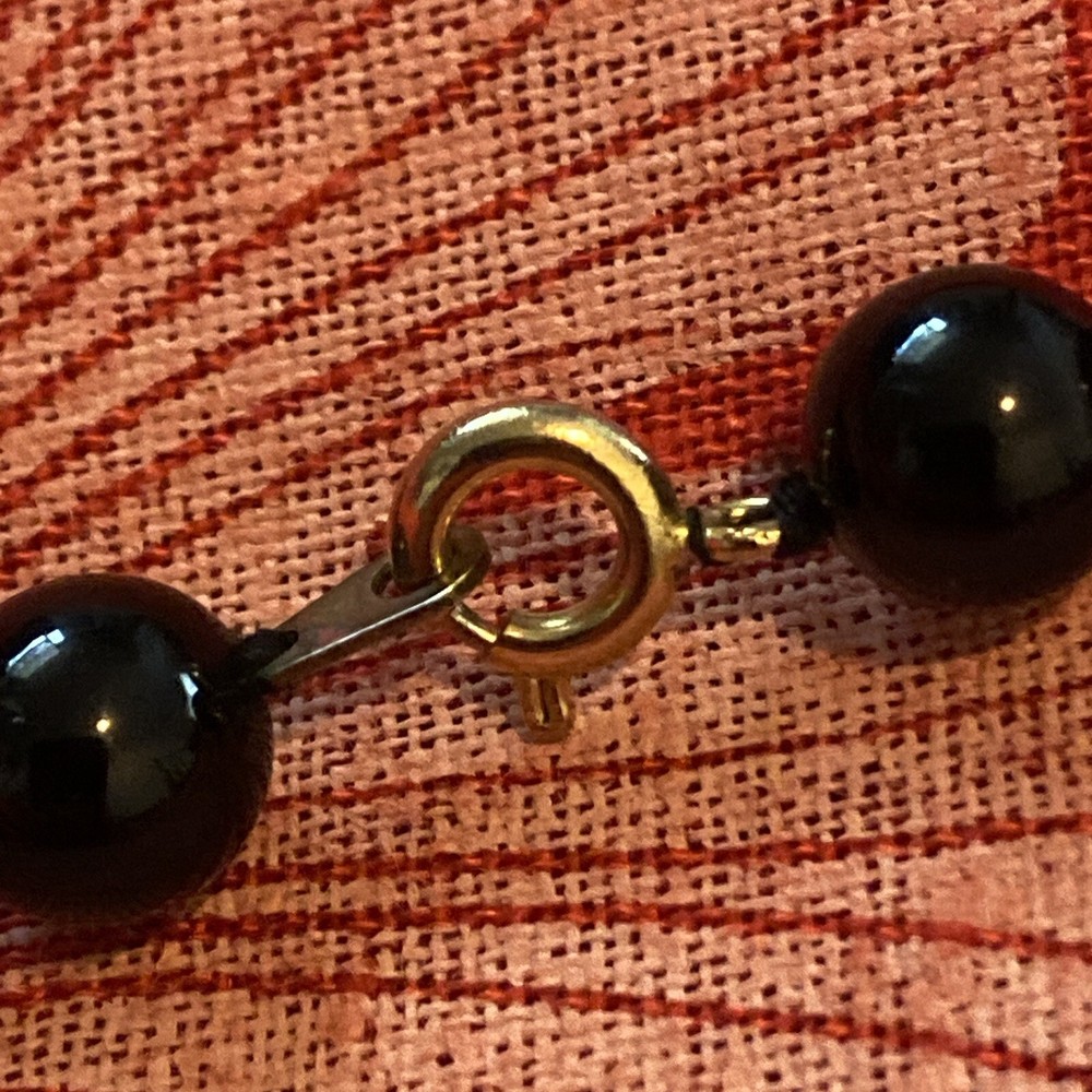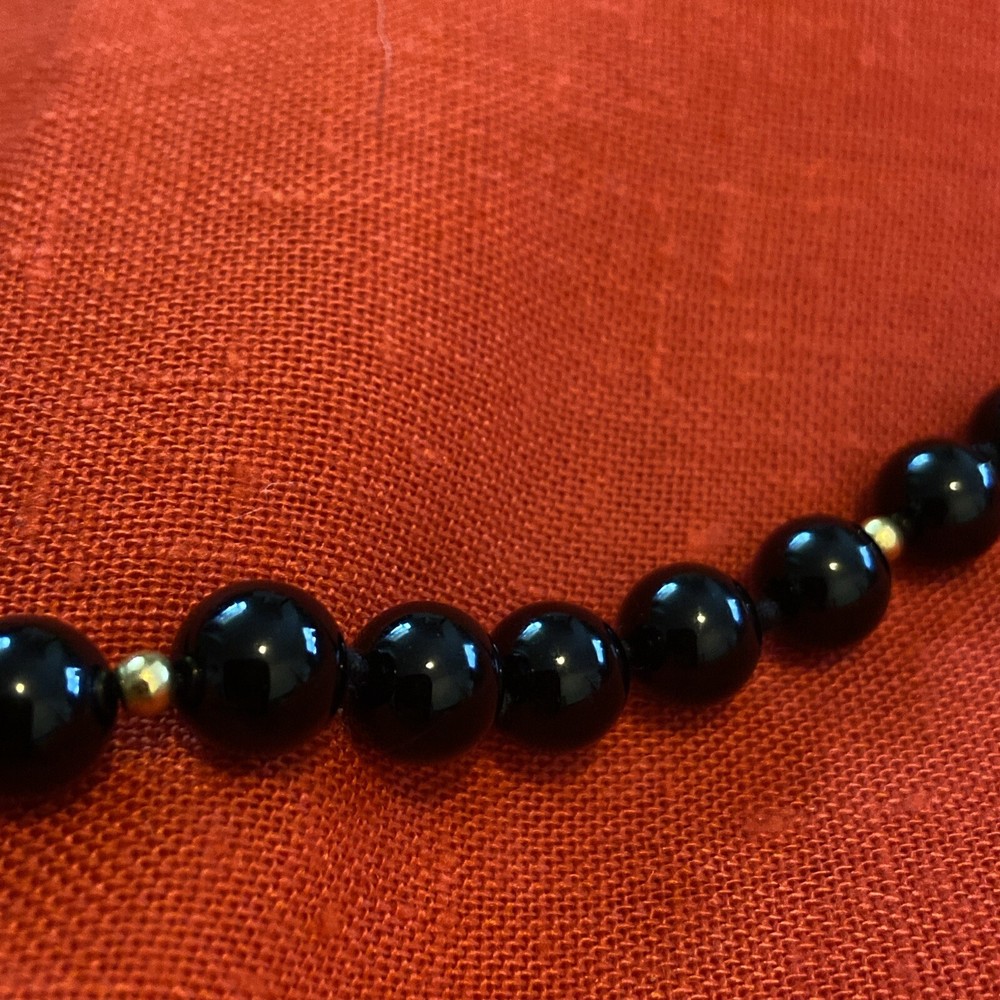12” drop (24 total ) 30 perfect genuine Onyx stone beads hand knotted with black silk cord. Gold plated clasp and small accent beads (12) Great condition