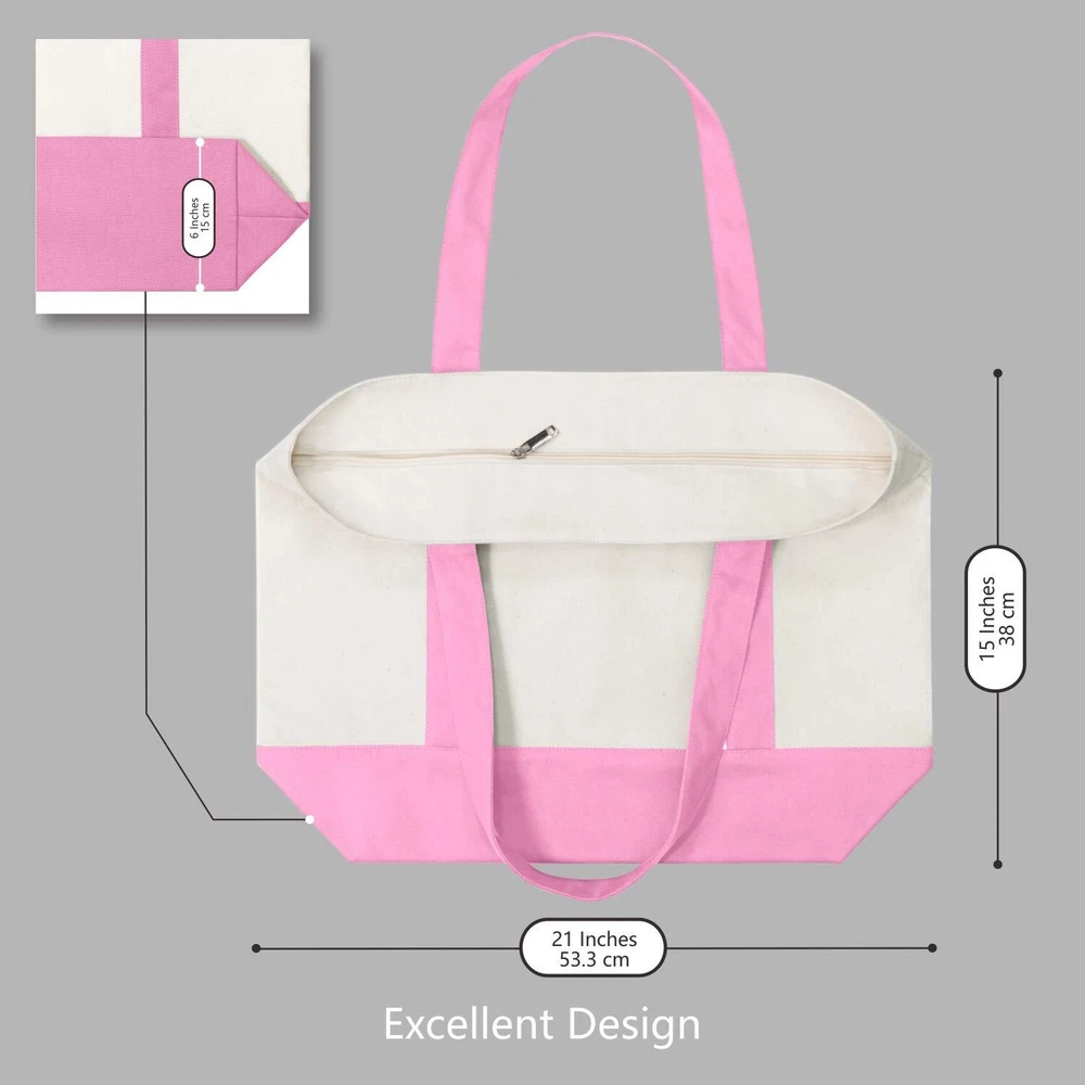 LARGE CAPACITY & DURABILITY: the size is 21" x 15" x 6" and it is made of heavy duty 12oz canvas with 8" x 8" outside pocket for carrying small items. Further, the top zipper closure makes your goods safer. Its handle is 1.5" W x 25" L, which is easy to carry or slung over a shoulder. The bags are made with dense thread and exquisite workmanship. All seams are reinforced and sewn to ensure their durability. MULTI-PURPOSE: it is an ideal bag for beach, teachers, nurse, work, travel, swimming, sport, yoga, dance, travel, carry-on, luggage, camping, hiking, team work picnic, party, gym, library, spa, trade show, wedding, conference, etc. ECOFRIENDLY: we cherish protecting the earth and with reusable grocery shopping bags, you may say no to paper or plastic bags and protect the earth's environment which is home to all mankind. WASHING NOTICE: cleaning of canvas bags is not recommended. The washing shrinkage rate is about 5% -10%. Should it be seriously dirty, it is recommended to wash it in cold water by hand. Hang dry is necessary before high- temperature ironing. Please notice that the fabric may not return to the original flatness. Flash drying, machine wash, soaking, and wash with other light-colored fabrics shall be prohibited. WORRY-FREE SHOPPING: bags can normally last for years. If it is damaged within 1 year, we will provide free .