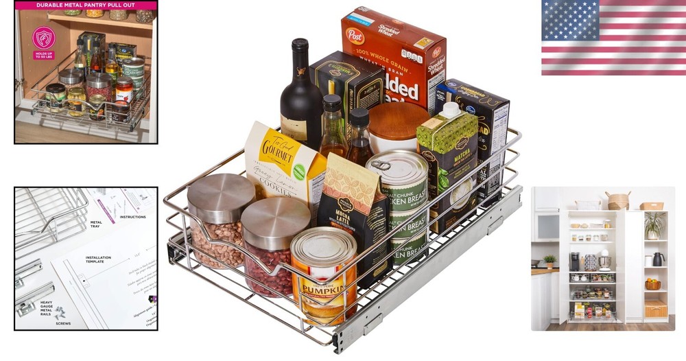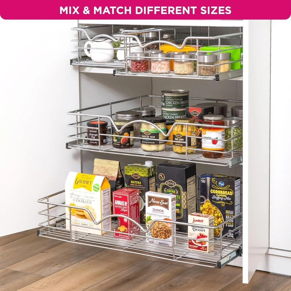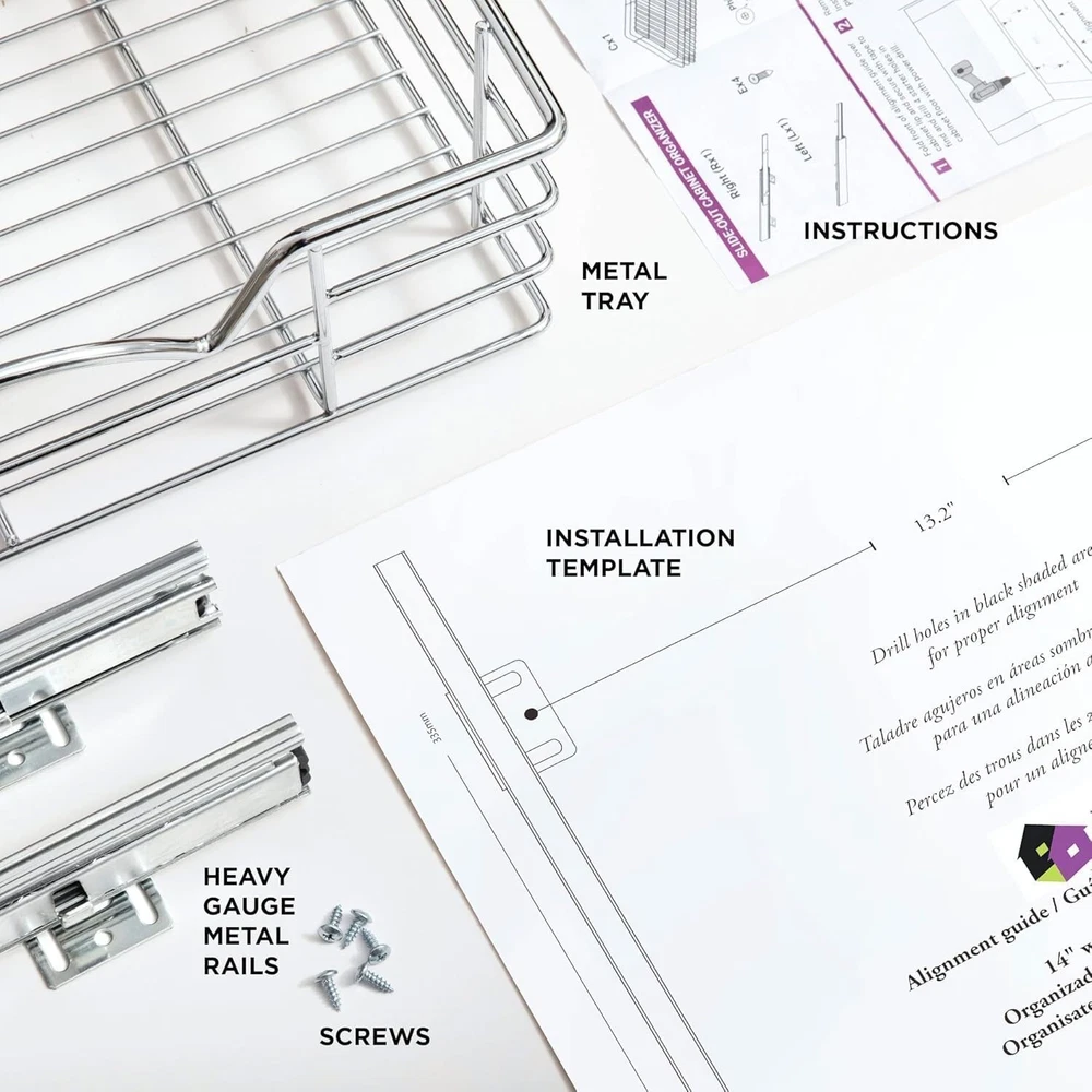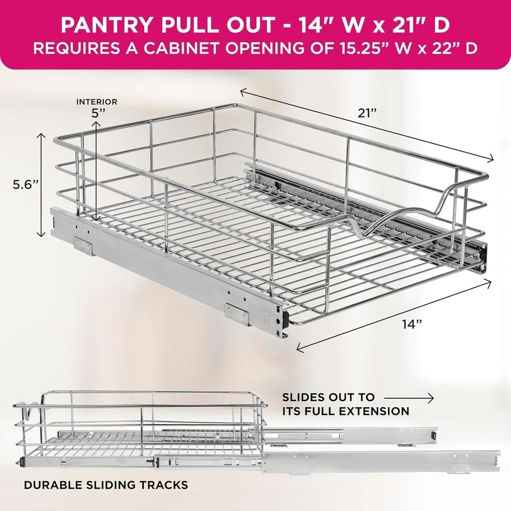 Item Length: Pull Out Cabinet Organizer Special Features: Ultra-smooth Sliding System Package Type: Standard Packaging Set Includes: Metal Basket, 2 Rails, Installation Template, Screws Number Of Items: 1 Batteries Required?: No Product Dimensions: 21"d X 14"w X 5"h Capacity: 50 pounds Color: Chrome Specific Uses For Product: Kitchen Organization Special Feature: Ultra-smooth Sliding System Item Height: 21 in Brand: Unbranded Number of Shelves: 1 Finish: Chrome Finish Rack Type: Pull Down Material: Metal Style: Modern Batteries Included?: No Mounting: Drawer Mounted, Insert Mount Number Of Pieces: 1 Item Width: 14 in Item Depth: 21 in Shape: Rectangle Item Weight: 9.63 pounds Size: 14 inch Department: Unisex Baby & Toddler Number of Tiers: 1 Finish Type: Chrome Finish Number of Compartments: 1 Type: Pantry Organizer Rack UPC: Does Not Apply Pattern: Solid Maximum Weight Recommendation: 5e+1 Pounds Item Package Quantity: 1 Features: Easy to Clean, Ultra-smooth sliding system, Easy to Install Personalize: No gtin13: Does Not Apply