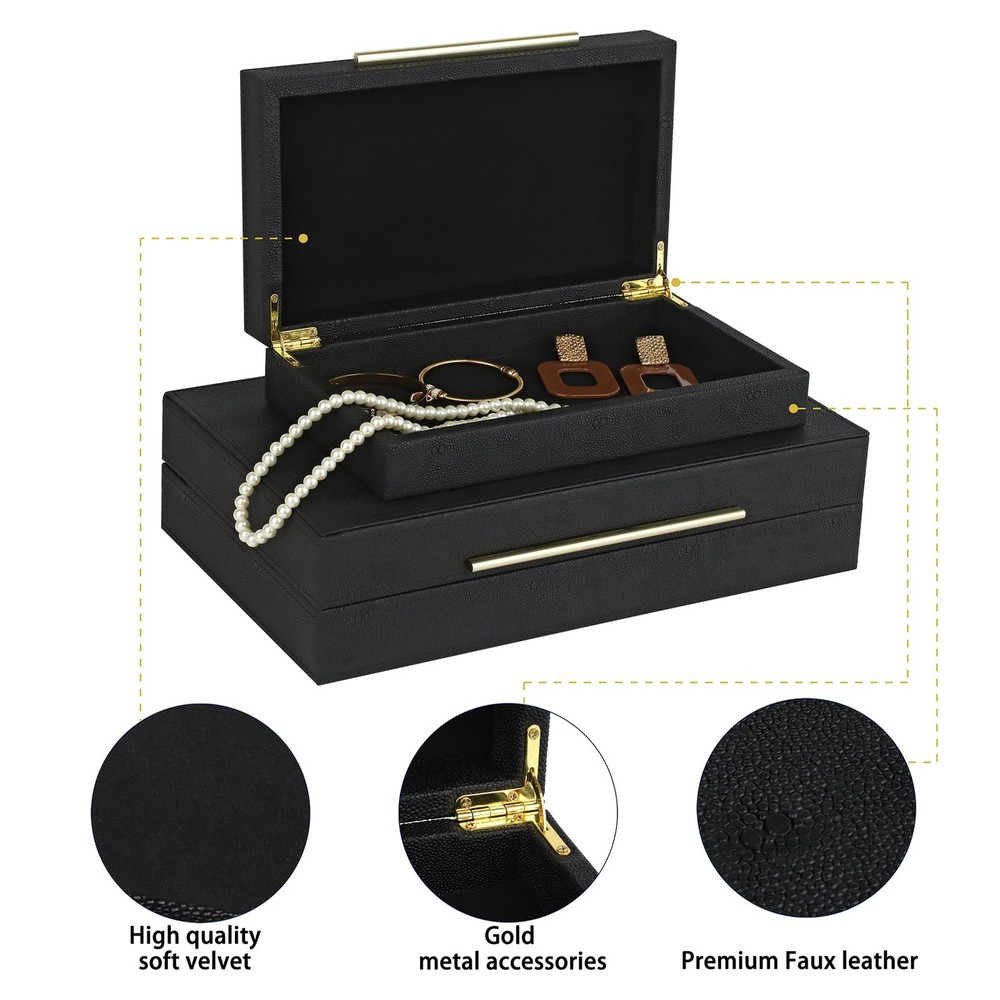 Introducing the Large Wooden Structure Keepsake Box - the perfect accessory organizer for your home or office! This decorative box features a sleek and modern design, made from high-quality faux leather with a sturdy wooden structure. The hinged lid provides easy access to your belongings, while the interior is spacious and organized with multiple compartments and dividers. Whether you're looking for a jewelry organizer, a storage box for small items, or a keepsake box for precious memories, the Large Wooden Structure Keepsake Box has got you covered. With its versatile design and sturdy construction, it's a must-have accessory for anyone who values style and functionality. Multi-purpose storage: Shagreen Faux Leather Decorative Box with wooden structure can store a wide range of items, making it great for organizing your home or office space. Large Capacity: the dimensions of the decorative storage box are S: 11x6.3x2.8 inches, l: 14.2x8.7x3.6 inches (L x W x H). Timeless design: The antique style storage box with lid boasts a classic and elegant look that will blend in with any decor, making it a stylish keepsake box that complements any environment. Allowing you to organize your items neatly and easily. The hinged lid provides easy access to your belongings while keeping them securely stored. Ample storage space: The large wooden box with hinged lid is spacious enough to store all your necessities, configurations, and personal items, without taking up too much space on your desk or shelf, providing ample space for storing various items such as jewelry, cosmetics, accessories, craft supplies, office supplies, and more. Premium Material: The storage box is made of faux leather, which not only looks elegant but also feels soft and comfortable to the touch. The sturdy wooden structure ensures the long-lasting use of the box while maintaining its functional and decorative purpose. A perfect gift: Surprise your loved ones with this stylish decorative box that is a perfect keepsake box for special moments and occasions, with the recipient cherishing it for years to come.