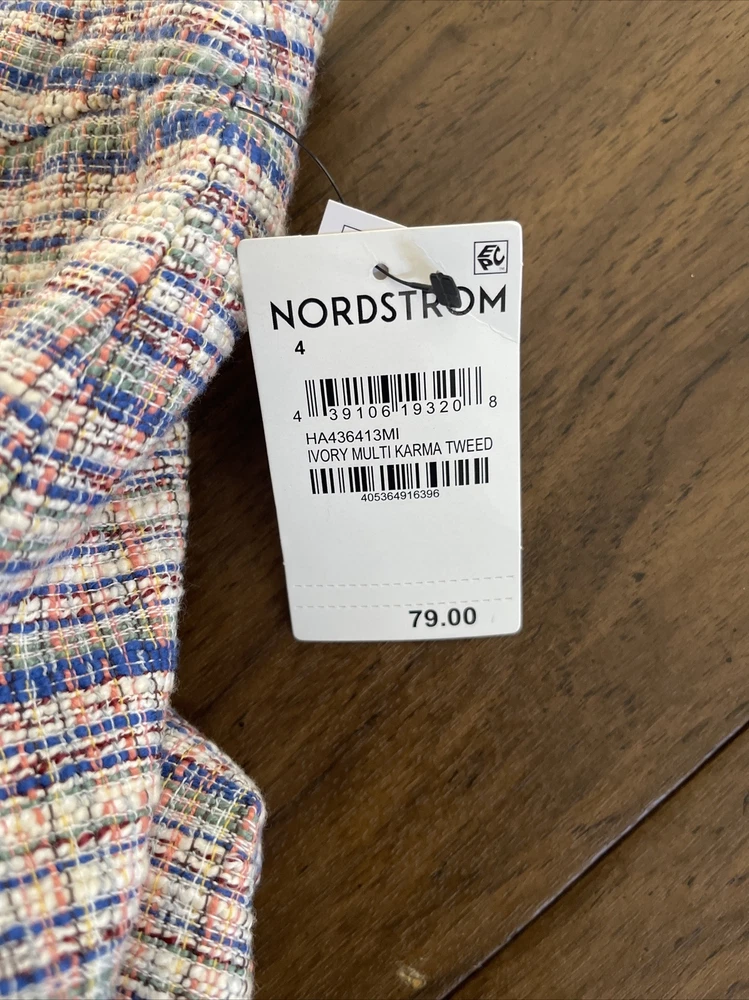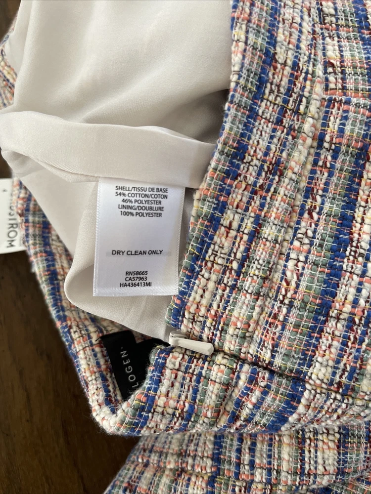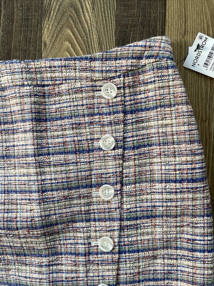 **Ivory Multi Karma Tweed Skirt by Halogen This Halogen pencil skirt is a stylish addition to any wardrobe. The skirt is made of tweed and features a plaid pattern in multicolor. It has a mid-rise waist and a button closure. The knee-length skirt has a straight and pencil style, with a faux wrap design that adds a touch of elegance. Ideal for formal occasions, business meetings, weddings, and parties, the skirt is lined and has a slit for added comfort. The skirt is a size 4 and is perfect for women who like to dress stylishly without compromising on comfort. Made in Indonesia, this skirt is a must-have for any fashion-conscious woman who wants to look and feel her best.