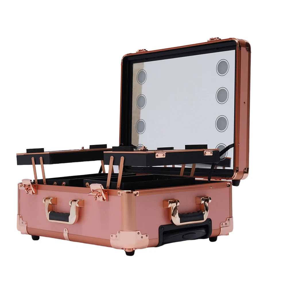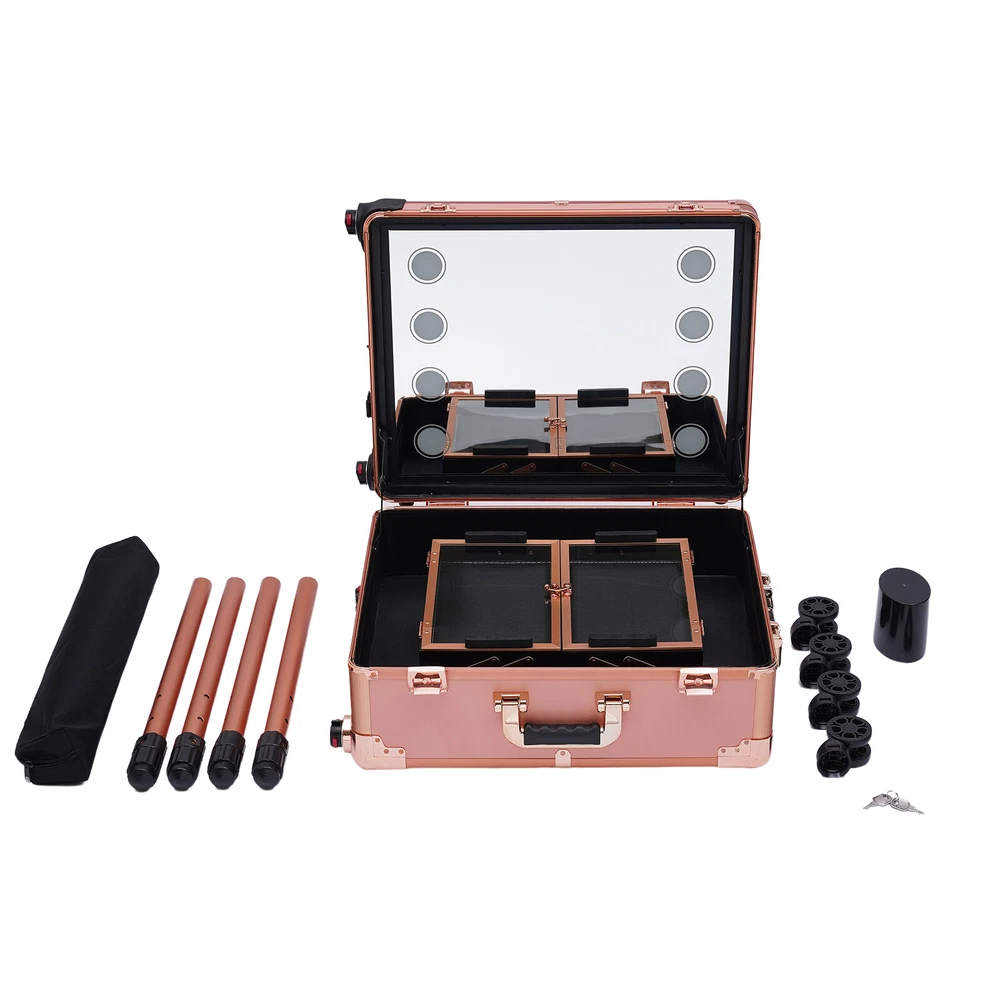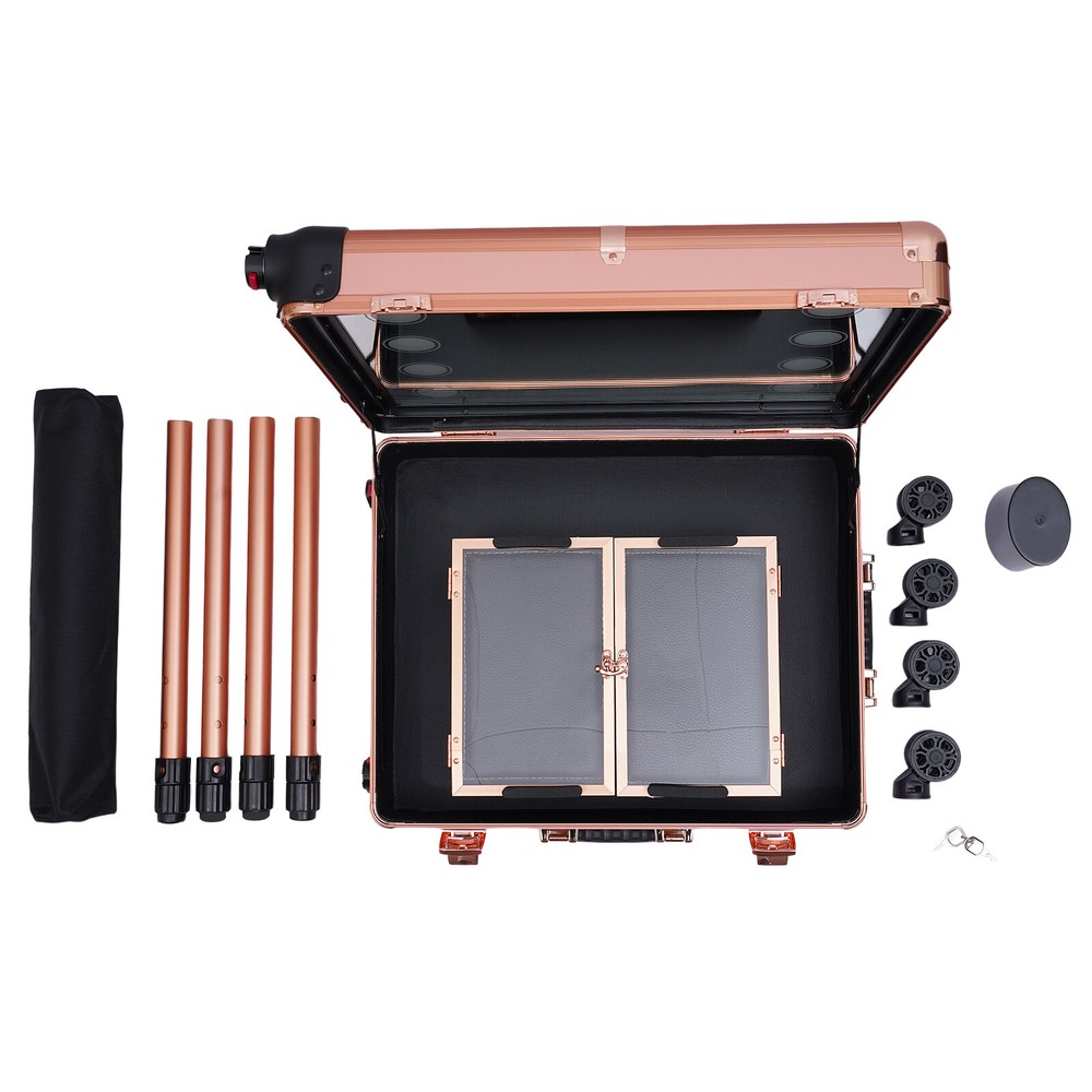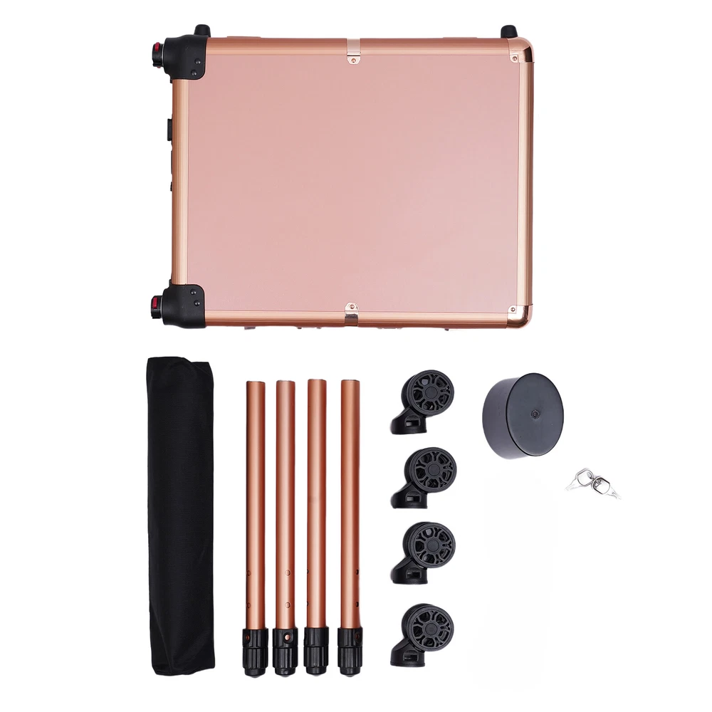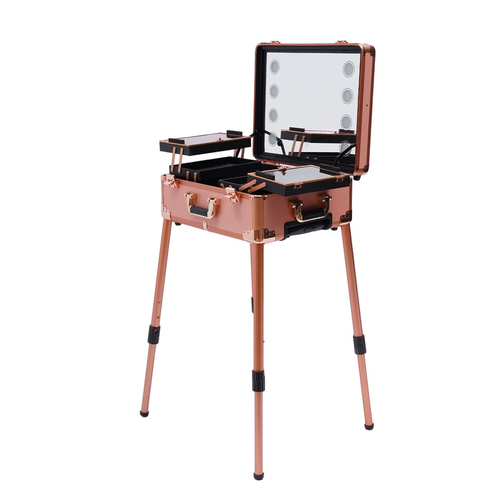 Size: 22" Voltage: 12v Light Source Diameter: 5cm/1.97inch Mounting Type: Free Standing Plug: US Standard Number of Wheels: 4 UPC: Does not apply Features: Durable Type: Makeup Case Package Size: 67.5*51*29cm/26.57*20.08*11.42inch Gross Weight: 14kg/30.86lbs MPN: Does not apply Light Color Type: White, Yellow, Yellow-White Mix Shape: Rectangular Supporting Leg Max. Height: 82cm/32.3inch Tray Distance From Floor: 96cm/37.8in gtin13: Does not apply Color: Rose gold Brand: Unbranded Top Cover Size: 52*40cm/20.5*15.7inch Net Weight: 12kg/26.46lbs Max. Load-bearing Capacity: 50kg/110.23lbs Mirror Size: 49*36cm/19.3*14inch Highlights: Compact Design,Unique Appearance,high reliability Bulb Type: 8pcs 5W LED Bulbs (Included) Overall Case Height: 133cm/52.4inch Material: Aluminum Alloy, Decorative High-pressure Laminate Wheel Material: Nylon Tray Size: 16.5*26.5*3cm/6.5*10.4*1.2inch Surface Treatment: Oxidation