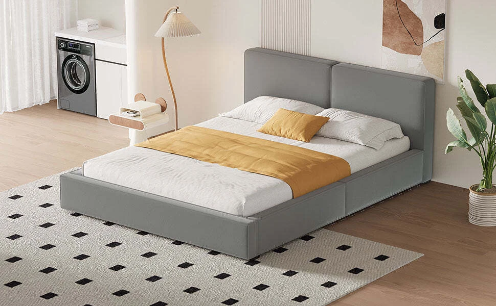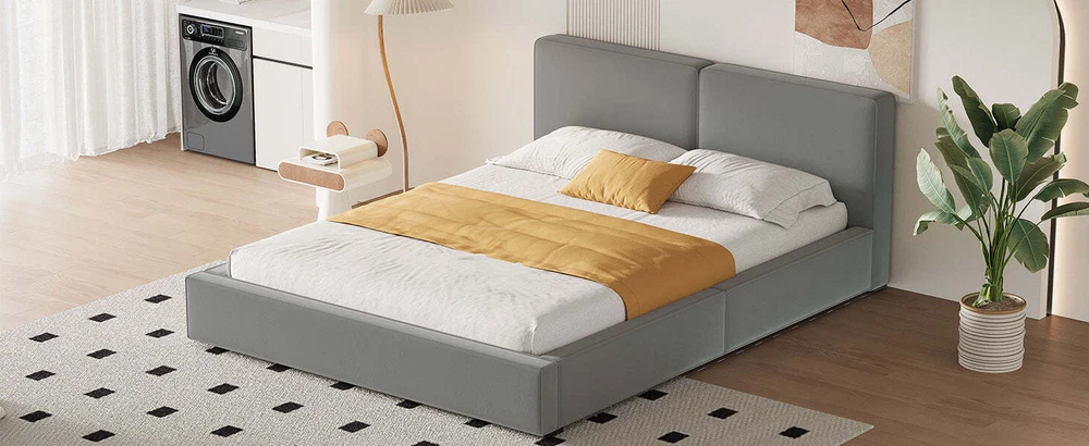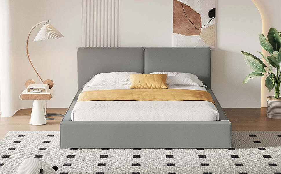 Specifications Place of Origin #originPlace# Main Color Gray Main Material Velvet Bed Size Queen Dangerous Goods #dangerFlag# Dimensions & Weights Assembled Length (in.) 84.00 Assembled Width (in.) 68.00 Assembled Height (in.) 25.00 Weight (lbs) 117.00 Product Features [Elegant Design]Wrapped in velvet for a welcoming touch. It gives any room a spark of style that's both modern and timeless. This platform bed not only suits any home décor, but will be a beautiful piece for your room. [Soft and Comfortable] With soft velvet fabric upholstered all around the bed frame, this platform bed provides a comfortable sleeping and relaxing environment, relieving your fatigue throughout the day. [Stability] The bed frame is made of solid MDF and particle board, providing a dense and strong support for you. The construction ensures both a lifetime of use, and a sturdy bed frame with a head which won't wobble. Enjoy many long years of relaxation and family fun, secure in this meticulously designed upholstered platform bed. [Easy Assembly]The platform bed is delivered in two packages, along with the installation manual and full set of hardware necessary to guide you through the process of assembly, and the bed will definitely be assembled conveniently. [Dimensions] Overall Product Dimension: 84"L x68"W x 25"H. Mattress not included. Some assembly is required, although we have provided clear instructions and tools. Description This beautiful Upholstered Platform Bed adds a contemporary chic look to your bedroom and is upholstered in soft velvet fabric to add extra comfort. Sturdy wood frame construction and a wooden slat system to add extra stability and safety.Enjoy many long years of relaxation and family fun, secure in this meticulously designed platform bed.This grounded upholstered bed will be both a beautiful piece in the room and a place full of fun for your family. Weight & Dimensions Overall Product Dimension 84"L x68"W x 25"H Detail Product Dimension Please refer to the Size image Number of Package 2 Package Dimension Please refer to