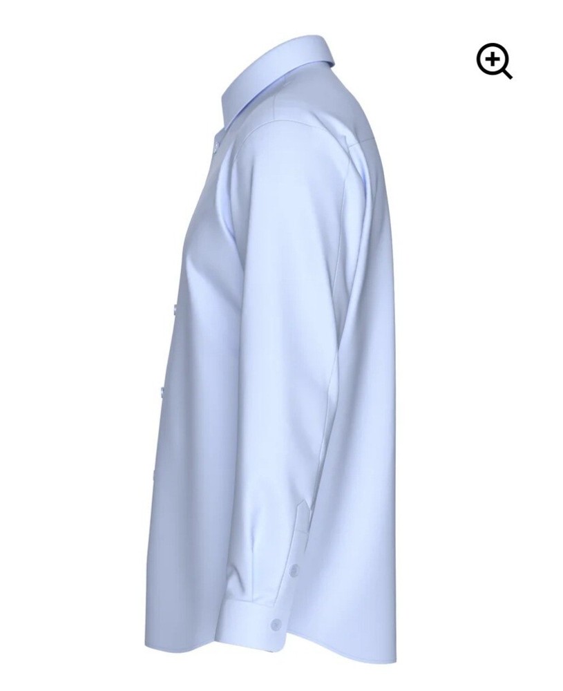 This tailored dress shirt is in a solid sky blue color with a collared neckline and button closure. It features long sleeves with barrel cuffs and is made from a comfortable 4-way stretch fabric (82% nylon, 18% spandex), making it breathable and suitable for various occasions such as travel, weddings, parties, or everyday wear. The shirt is in a size small and is machine washable, ideal for both formal and casual settings.