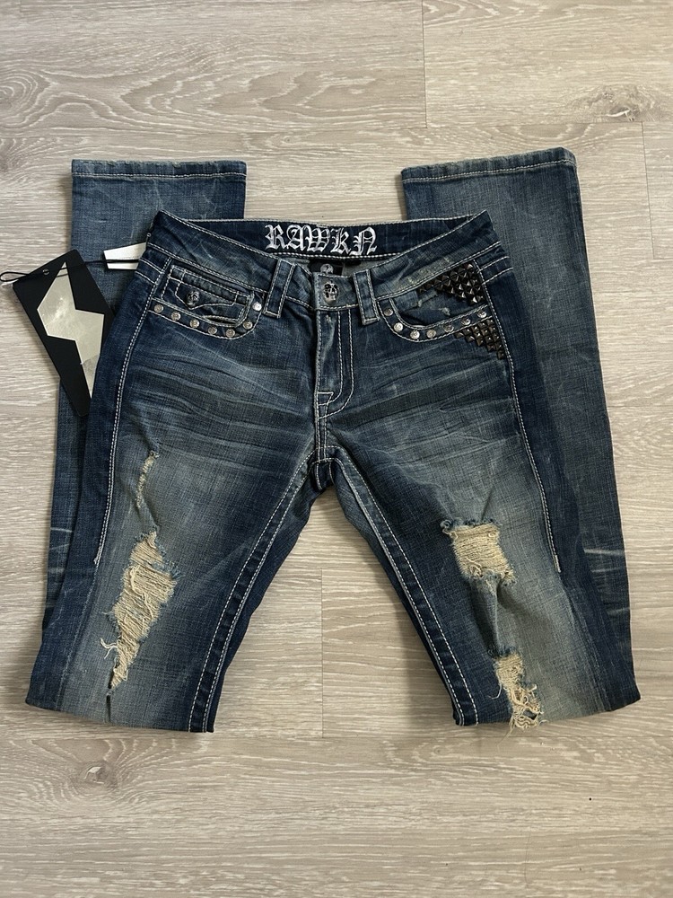 studded rawkn jeans, studs and buttons, and spider design!!! new with tag. unknown brand called rawkn , size 2 / size 26inches in waist. these jeans are seen on pinterest Cybergoth mallgoth affliction emocore draingang haunted mound fairycore fairygoth scene cybergoth gothic streetwear skater punk cyberpunk tattoo tribal baggy jessepinkman distressed × sinister carbon black thermal cyber y2k thermal tapout goth scenecore semetary girly 2000s new brand designer y2k stylish archive keycloset designer