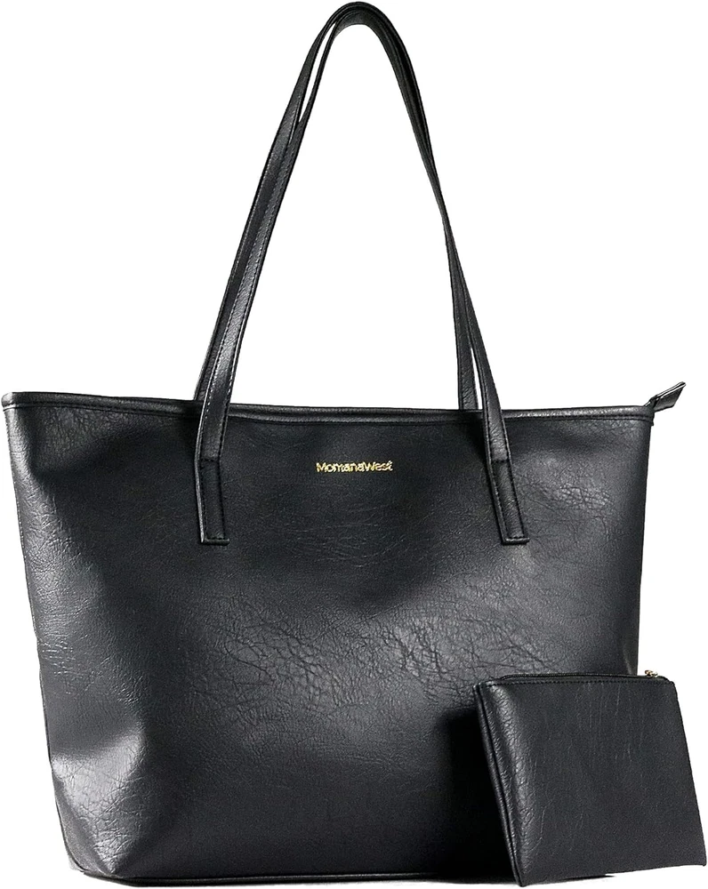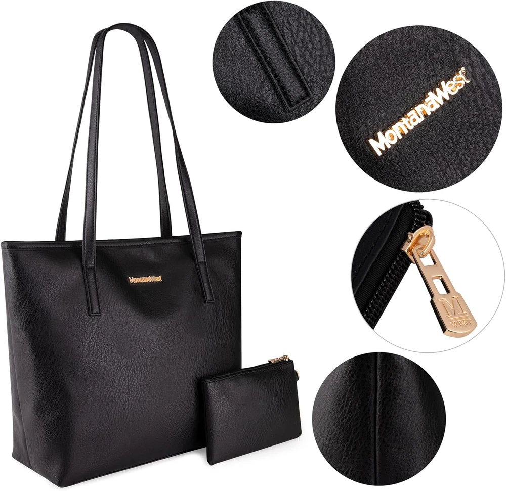 Product Description This tote bag has the capacity to be filled with all of your belongings without any kind of drag while carrying. Besides the tensile strength, it has enough space for your runs, shopping, and more. The material used is durable enough to last even after prolonged use with heavy loads. Iconic behavior at any era. Timeless Trend Montana West tote bags are an excellent match for any of your outfits. You can coordinate any aesthetic with any of our designs. The standard of the material makes our bags last long even with extended use - while still maintaining a high quality. No amount of wear, tear, and moisture can damage excellent craftsmanship by our own. The design transcends seasons. The minimalist approach of the bag makes it capable of maintaining its relevance wherever and whenever. Elegant. Simple. Versatile. The video showcases the product in use. The video guides you through product setup. The video compares multiple products. The video shows the product being unpacked. 1 Front 2 Bottom 3 Inner WHY US? Your ultimate carry-all companion is designed for style, convenience, and unmatched durability. This spacious tote bag is meticulously crafted with premium PU leather, ensuring a long-lasting and resilient accessory that withstands the test of time. With its generous capacity and well-organized interior, this effortlessly accommodates all your daily essentials, making it perfect for work, travel, or leisure. As an added b.o.n.u.s, we provide a matching wallet made from the same high-quality material, ensuring both the tote and wallet are designed to withstand the rigors of everyday use while maintaining their elegant appearance. Embrace the luxury and practicality of this bag and its accompanying wallet, and experience the confidence of carrying a fashion-forward accessory that is built to last. Make a statement with a carry-all tote bag that perfectly combines style and durability, elevating your fashion choices to new heights while embracing the reliability that comes with superior craftsmanship. Various designs to meet your different needs Add to Cart Add to Cart Add to Cart Customer Reviews 4.4 out of 5 stars 8,488 4.4 out of 5 stars 8,488 4.4 out of 5 stars 8,488 4.4 out of 5 stars 8,488 4.4 out of 5 stars 8,488 4.4 out of 5 stars 430 4.4 out of 5 stars 8,488 Price $19.99 $ 19 . 99 — — — $26.99 $ 26 . 99 — $24.99 $ 24 . 99 With Pouch ✔ ✔ ✔ ✔ ✘ ✔ ✔ Back Zipper Pocket ✘ ✘ ✔ ✔ ✔ ✘ ✘ Vegan Leather ✔ ✔ ✔ ✔ ✔ ✔ ✔ Top Zipper ✔ ✔ ✔ ✔ ✔ ✔ ✔ Adjustable Shoulder Strap ✘ ✘ ✘ ✘ ✔ ✘ ✘