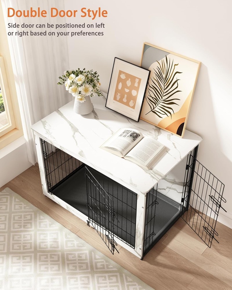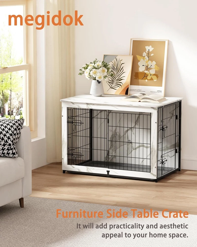 Product details: 【Recommended Size】: M-inner size:30*20*25.5 Suitable for Weight<40lbs, Length<28inch, Height<23.5inch, L-inner size: 36*24*25inch.Suitable for Weight<60lbs, Length<34inch, Height<23inch, XL-Inner size:41.5*27.5*30inch.Suitable for Weight<80lbs, Length<40inch, Height<28inch ,(Before purchas,please measure your dog's size to ensure he has enough room to move in the crate) The top static load can be up to 200lbs. 【Durable Material】: This dog crate is made of high-density fiberboard, which is more durable than fragile particle board. The high-quality reinforced steel mesh has been treated with rust prevention. And double doors and double locks are more sturdy and durable. 【Furniture-style Dog Crate】The natural grain effortlessly complements your home decor, adding practicality and aesthetics to your home.The side door can be placed on the left or right according to your needs, and the rounded edge design avoids bumping and injury. 【Easy-to-clean Tray】The interior of the dog crate needs regular disinfection and cleaning of fur and dirt. The durable, odor-resistant tray can be easily pulled out and cleaned in case of accidents, something a wooden board can't do. The bone-shaped baffle secures the tray in the crate and prevents it from sliding out. (The tray comes with 5 felt pads underneath to protect your floor from scratches) 【Value for Money】: You don't need to purchase a separate cushion as the package includes a 1.5-inch thick coral fleece soft cushion that is perfect for the dog crate. This product has excellent quality and a sturdy structure, with positive feedback from customers. It is the best choice for long-term companionship with pets and it will also save you money. Brand Megidok Product Dimensions 37"L x 25"W x 26"H Material High Density Fiberboard; Reinfoced Steel Mesh Specific Uses For Product Indoor Special Feature Durable