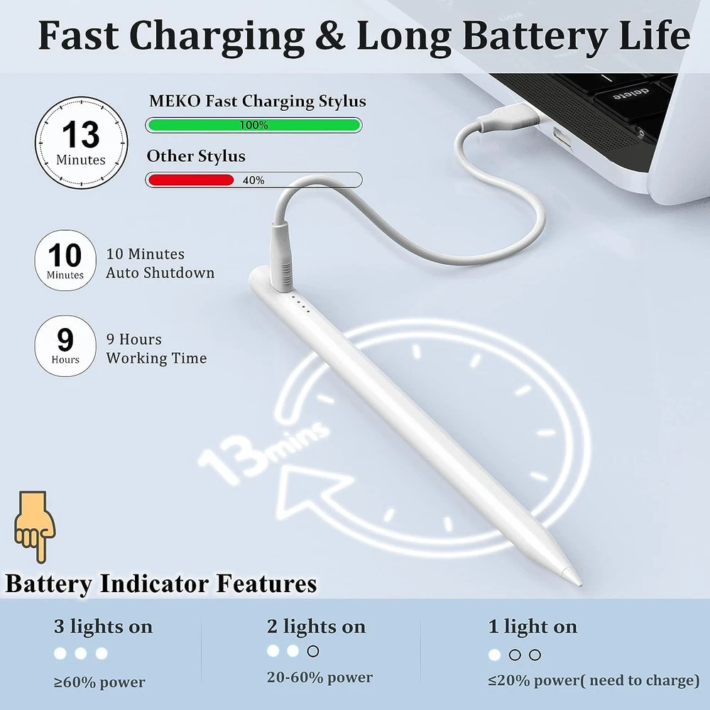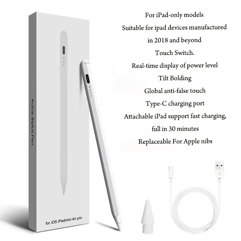 About this item [Precise and Sensitive]- The POM tip of these stylists are made of special material,which effectively improve the accuracy and sensitivity of tablet stylus pen writing. The nib of this pencil is smooth and wear-resistant,which can prevent damage to the screen,provide better accuracy and compatibility without delays and disconnections,allowing you to create with maximum precision at all times. Additionally,the pen for iphone comes with 1 spare nibs to extend the apple pens lifespan. [Intelligent Design]-The active stylus pen for ipad no need for drivers or bluetooth setting.Just double tap the pen cap and then start to use,create anything without limitation.The iphone pencil stylus can also be used as a useful gift for your family/friends around you who love to create.Our fine point stylus is equipped with smart energy-saving features, automatically switching to "sleep mode" after 5 minutes of inactivity to conserve power and avoid unnecessary battery consumption. [Magnetic Adsorption & Fast Charging]- The magnetic design,keep their lapiz para ipad close at hand and prevent it from getting lost, more portable and more easier to organize.Please note: Devices that support magnetic adsorption function: iPad Pro12.9" (third/fourth/fifth generation); iPad Pro11"; iPad air4; iPad mini6.The pen fully charged in just 60-80 minutes and provide up to 10 hours of active use on a single charge. Once the indicator light turns on,the ipad pro pencil is active. [Widely Compatible]- Our rechargeable apple stylus for ipad is compatible with almost all touch screen devices,including popular Apple products like iPad /Mini/Pro/and iPhone, as well as other smartphones and tablets (iOS/ Android) devices.It's good for writing,drawing and note-taking.This tablet pencil may not be compatible with laptops running on Windows systems, due to varying software and hardware configurations. [After-Sales Service]- Here are some helpful tips: ①Make sure the drawing stylus has enough electricity. ②The low-quality screen protector results in bad electric conductivity.③The apple ipad pen does not support palm rejection④If your device was previously connected to an Pencil via bluetooth, please forget the encil on bluetooth and turn off bluetooth to use our ipad pens.Our cheap styluses support 1-year product warranty