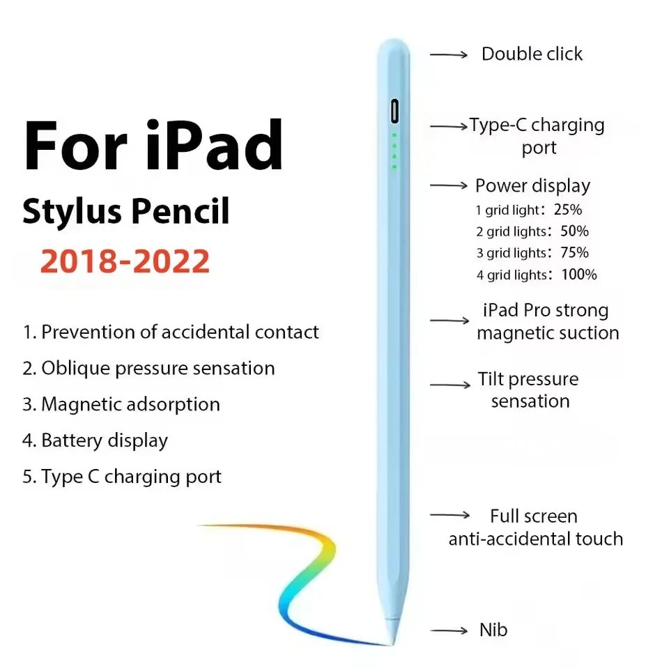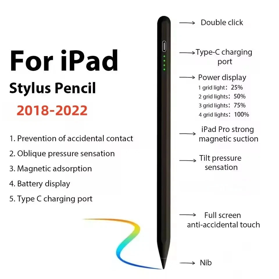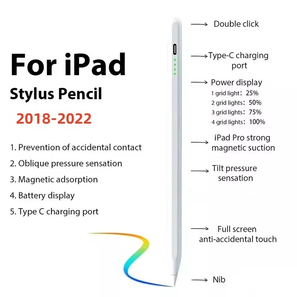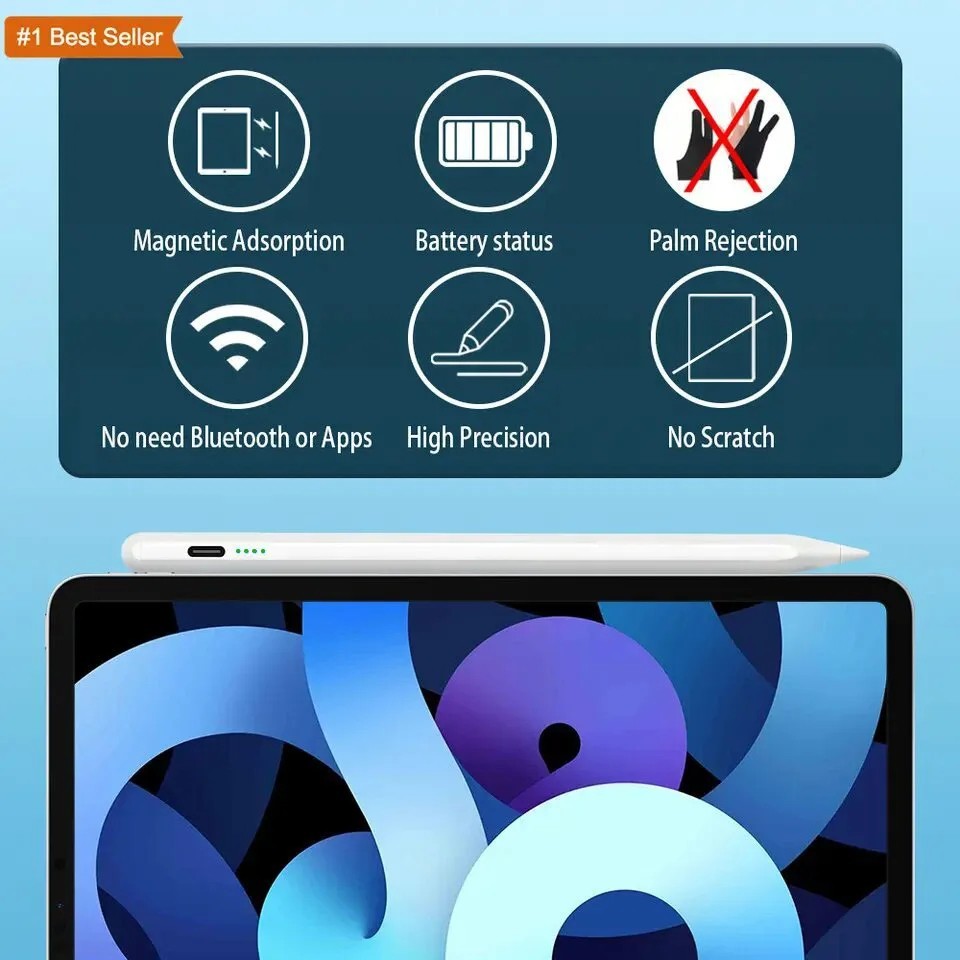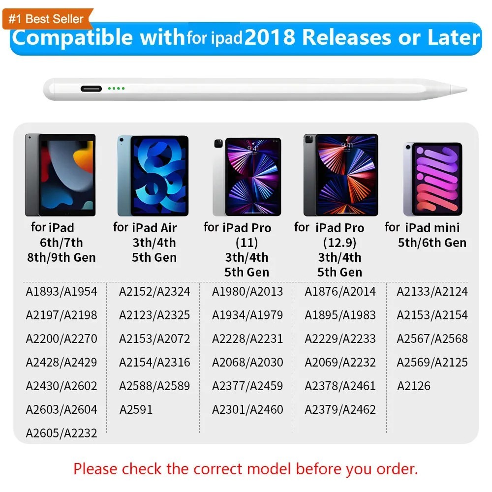 Description Report this item or seller Stylus Pen for iPad,Active Pencil with Palm Rejection,Compatible with iPad Pro 6th/5th/4th/3rd,iPad Air 5th/4th/3rd,iPad 10th/9th/8th/7th/6th,iPad Mini 5th/6th,for Writing Drawing Sketching 【Compatible with iPad Models】This stylus pen compatible with 2018-2022 iPad & iPad Pro. Such as for iPad Pro 6th/5th/4th/3rd,iPad Air 5th/4th/3rd,iPad 10th/9th/8th/7th/6th,iPad Mini 5th/6th.Not compatible with 2017 and earlier Apple iPad, and also does not support for Android, iPhone, Microsoft devices. Please confirm whether your model is compatible before buying. 【Smart Touch Operation & Extra Long Standby】No Need Bluetooth or any Apps.Double touches on the top to start or stop the stylus pencil.Built-in 130mAh, battery provides 9 hours active use and 365 days standby time, for only 1.2-hours charging by a USB-C cable. It will automatically turn in "Sleep Mode" after idle for 30 minutes to save power. 【Stylus Pen With Palm Rejection】You can rest your palm comfortably on the screen when writing or drawing by the upgraded active pencil with palm rejection. No need to wear gloves. This technology provids you with a more smoother,naturaller writing/drawing experience. 【Magnetically Attach 】This rechargeable stylus pen can be attached to the side of iPad by the powerful magnetic, but does not support magnetic charging. More portable, easier to organize,No more rolling and lost. 【 Perfect Precision】This Stylus Pen for iPad has an ultra-fine 1.5mm tip which allows precise strokes and easier to write small characters. No scratching the screen, no lag, no skipping. Not easy to break! Description: If you are someone curious about or in need of a stylus pen for drawing, writing, or note-taking, this is an excellent value at its price. This stylus pen with lndicator light and smart touch switch, can be rechargeable by Type-C cable.It comes with a USB-C charging cable and can be charged in 1.2 hours with the charge lasting approximately 9 continuous hours.Our Pencil comes with 2 durable and usable, removable & replaceable pentips which made of high quality POM materials,friendly to your iPad screen and easier to replace. No scratching the screen, no lag, no skipping, and more freedom and naturally to write and working.Take it as the gift to your love, family members.It won't let you down. Compatible Models: Stylus Pen Compatible with apple iPad (6th,7th,8th,9th,10th generations) It compatible with iPad 10th (10.2-inch) A2696/A2757/A2777 It compatible with iPad 9th (10.2-inch) A2602/A2604/2603/2605 It compatible with iPad 8th(10.2-inch) A2270/A2428/A2429/A2430 It compatible with iPad 7th(10.2-inch) A2197/A2198/A2200 It compatible with iPad 6th (9.7-inch) A1893/A1954 It compatible with iPad Pro 3 (11-inch ) A1980/A2013/A1934/A1979 It compatible with iPad Pro 3 (11-inch ) A2228/A2068/A2030/A2231 It compatible with iPad Pro 3 (11-inch ) A2377/A2459/A2301/A2460 It compatible with iPad Pro 3rd (12.9-inch) A1876/A2014/A1895/A1983 It compatible with iPad Pro 4th (12.9-inch) A2229/A2233/A2069/A2232 It compatible with iPad Pro 5th (12.9-inch) A2378/A2461/A2379/A2462 It compatible with iPad Mini 5th (7.9-inch ) A2133/A2124/A2126/A2125 It compatible with iPad Mini 6th (8.3-inch) A2567/2568/2569 It compatible with iPad Air 3rd (10.5-inch) A2152/A2123/A2153/A2154 It compatible with ipad Air 4th (10.9-inch) A2316/A2324/A2325/A2072 NOTE: If your iPad Bluetooth connection uses the Apple Pencil, please clear the Apple Pencil from the Bluetooth list and turn off the Bluetooth function. This will prevent the stylus from being used with the iPad. Features: -Palm rejection design -Magnetic adsorption -Integrated design -Charging time: 1.2 hours -Continuous Working Time: 9 hours -Standby time: 365 days -Compatible with most notes & drawing software in the APP Store. Specification: Material: Aluminum Alloy Color:White Pencil Diameter Size: 9mm Pencil Nib Size:1.5mm Pencil Length: about 16.5cm/6.5" Weight:15g Charging Port:USB-C Battery Capacity:130ma/h Package Included: 1* Stylus Pen 2* Replacement Tips 1* USB C Charging Cable 1* User's manual 1* Storage Box class="extend--iframe--to7hHIV" data-spm-anchor-id="a2g0o.detail.0.i1.538a9Iic9Iic2p" data-spm-act-id="a2g0o.detail.0.i1.538a9Iic9Iic2p" style="box-sizing: border-box; -webkit-tap-highlight-color: transparent; outline: 0px; margin: 0px; padding: 0px; height: 9464.04px; position: absolute; top: 0px; visibility: hidden; width: 1048.85px; z-index: -1;">