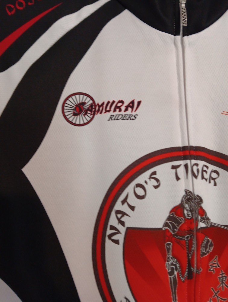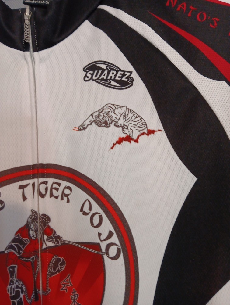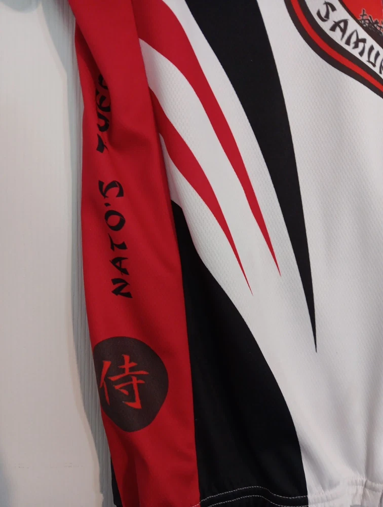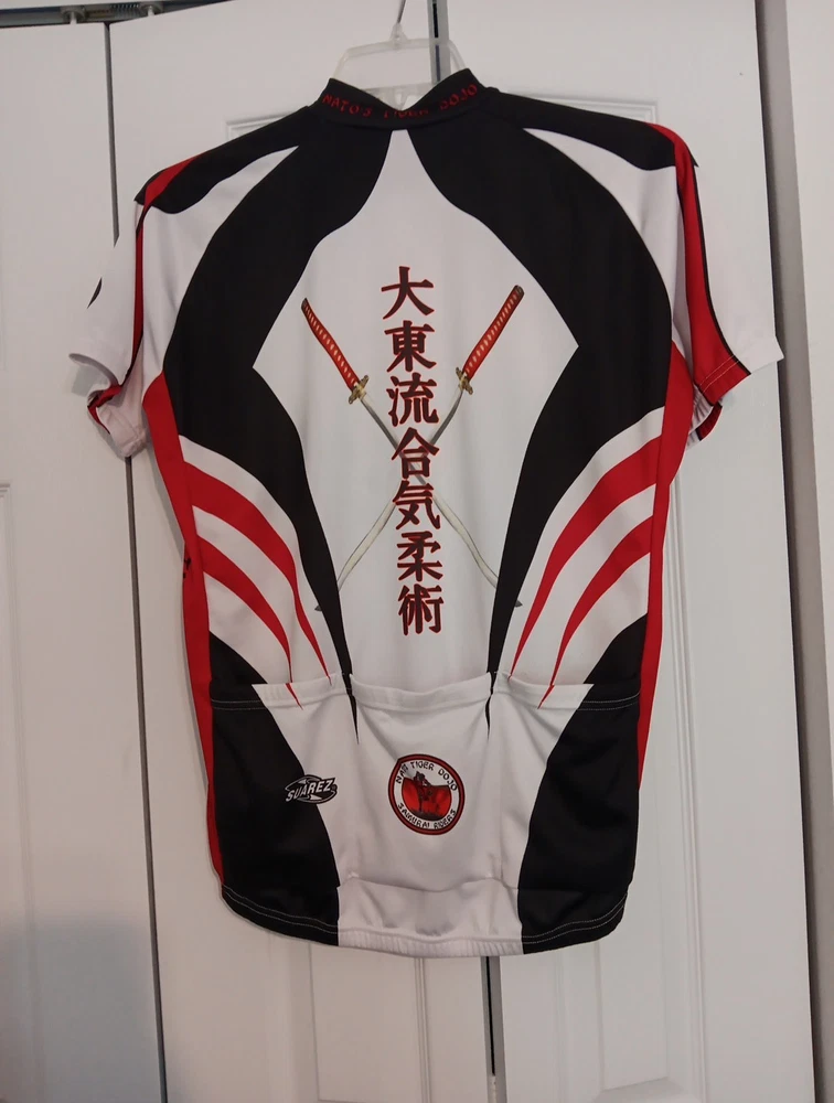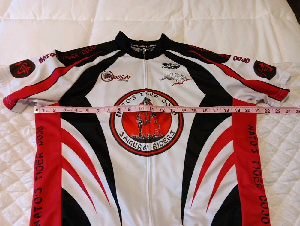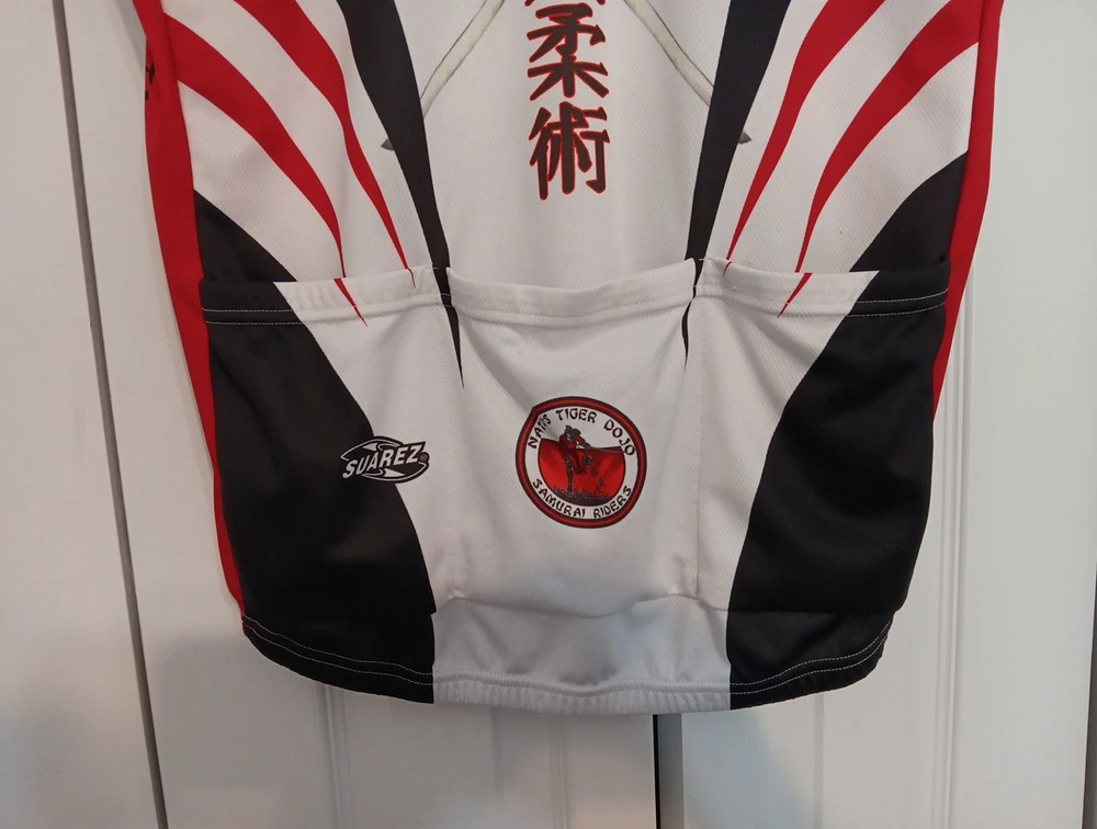 Pre-owned cycling jersey by Suarez. The graphic design features Nato's Tiger Dojo Samurai Riders on the front in red, black, and white. The size is XL. There is a full zip front, elastic at the sleeves and bottom and pockets on the back. There is a small discoloration near the armpit in the front and another on the interior of a back pocket. Please see photos. Please message me for additional photos, measurements, or information.