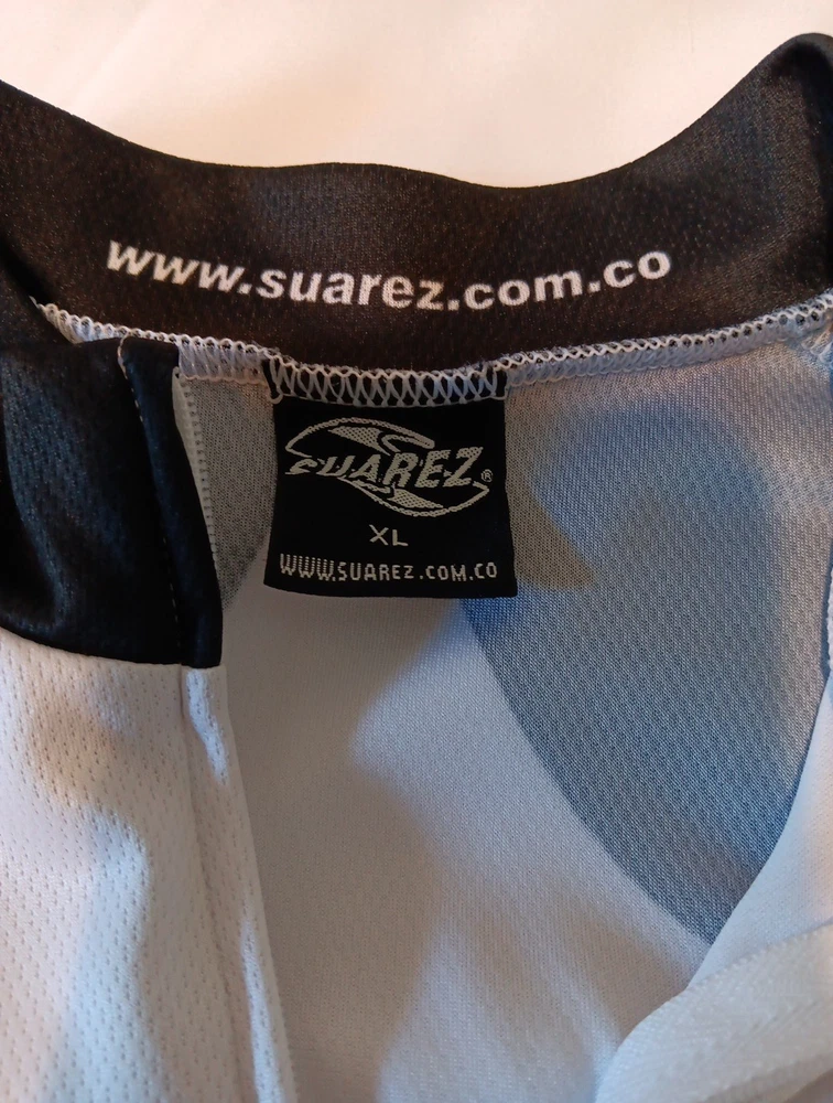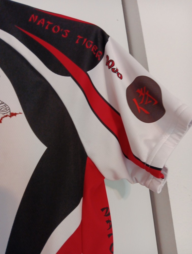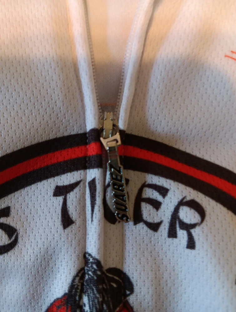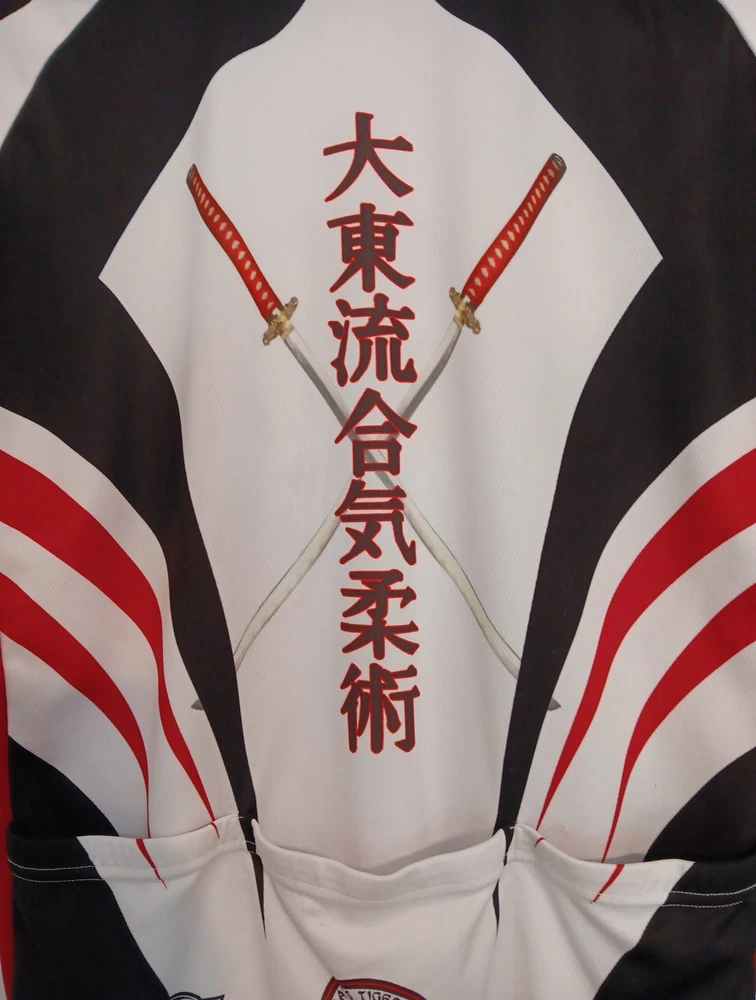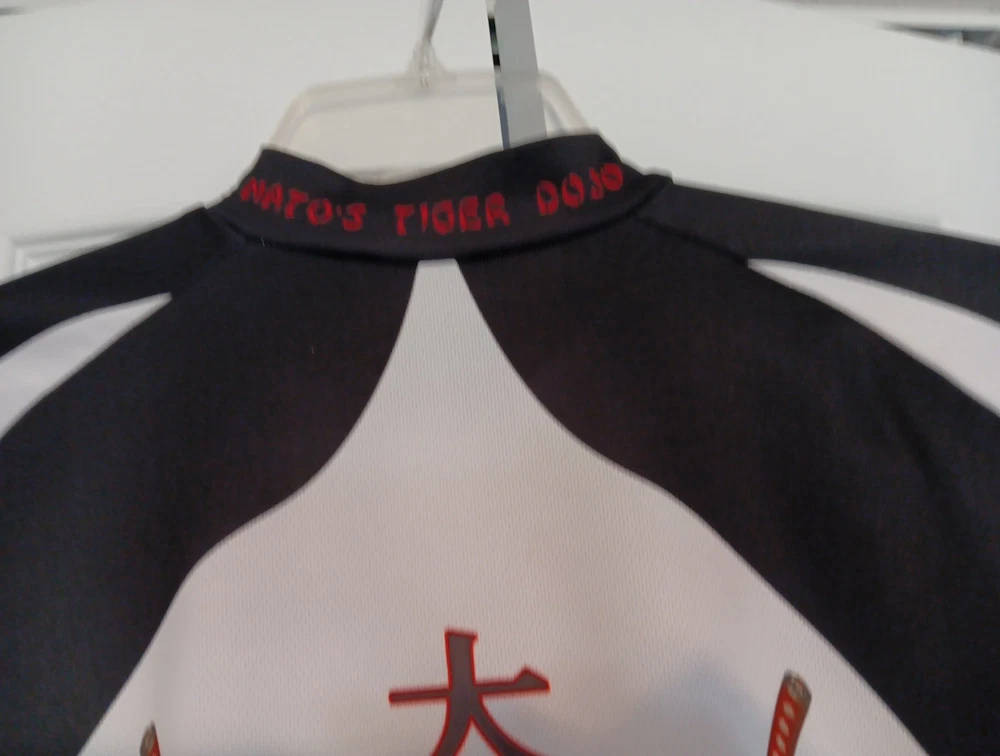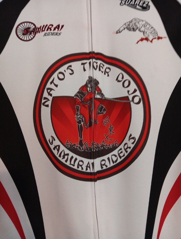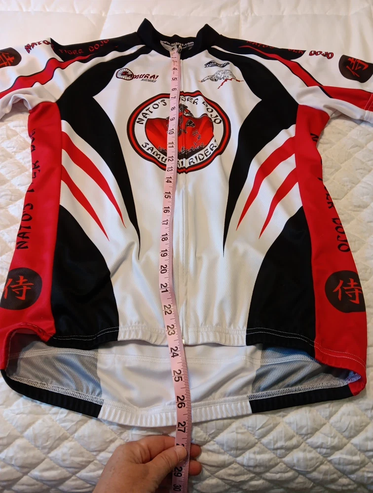 Pre-owned cycling jersey by Suarez. The graphic design features Nato's Tiger Dojo Samurai Riders on the front in red, black, and white. The size is XL. There is a full zip front, elastic at the sleeves and bottom and pockets on the back. There is a small discoloration near the armpit in the front and another on the interior of a back pocket. Please see photos. Please message me for additional photos, measurements, or information.