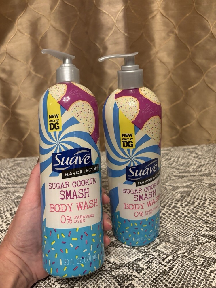 Suave flavor factory sugar cookie smash body wash, 2 large bottles , new Caramel, Brown sugar and rich vanilla ! This is the favorite among fans of the flavor factory This body wash gently cleanses skin, so that you can feel fresh and smell great! You will receive the two bottles pictured all sales final no returns Retail 6.49-9.99
