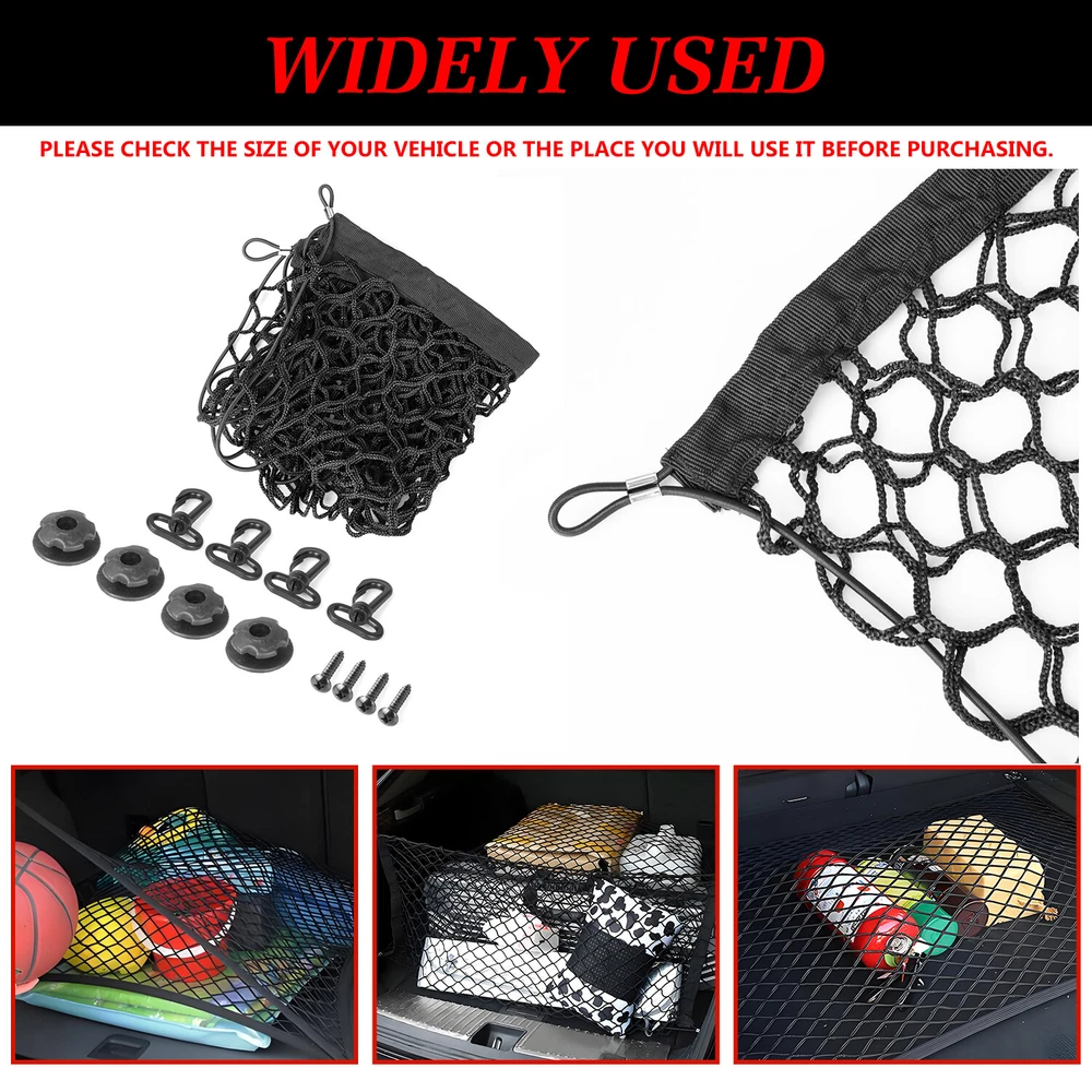Description: 1. Unique shape, simple style, easy to install.drive organized & be clutter-free! 2. Smooth elastic net, strong scalability, it won’t be dropping for lack of resilience.that holds items upright and in place. 3. Use the Hook contact the Fixed point(Your Rear Trunk Need Have The Fixed Point) 4. Natural size : 125cm (49.21" inch) x 40cm (15.74"inch ) Notice: 1. Before Purchase Check Your Rear Trunk Have Attachment Points.(as picture show) 2. There may be 1-3cm tolerance due to manual measurement. D rive organized & be clutter-free! The days of groceries rolling around on the drive home are over. Custom-crafted for the cargo area, this durable elastic-mesh net has a floor-style design That holds items upright and in place. It attaches in seconds to mounting points in the cargo area and folds flat when not in use. Great storage solution to help you driving be organize and clutter-free! It’s Stretchable to Fit the Span the Width of The Pickup Bed or Wherever It Is Needed. The Truck Net Stretches Around Your Stuff and You Can Cram Even More Things in It Than Ever Before Package Includes: 1 x Fixed Cargo Double Elastic Net Bag 4 x Screw 4 x Hook 4 x Adapter Hook