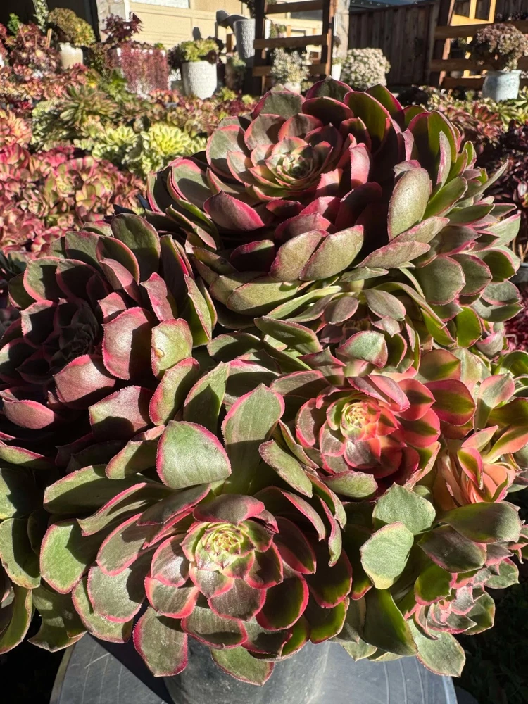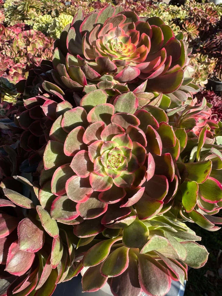 A Unique Edition of Big Aeonium Yeyan variegated cluster In one gallons pot (Cluster may be separated during shipping) SUCCULENT CARE TIPS Taking proper care of your succulents ensures they thrive and grow beautifully. Follow these tips for a healthy start: Unpacking Your Succulents • Unpack your succulents as soon as they arrive, handling them with care. • Trim dead roots: Remove any dried or damaged roots. • Remove dead leaves: Discard leaves that are transparent, shriveled, or dead. Loose or wrinkled leaves are normal and may be used for propagation if still healthy. Preparing Your Succulents for Planting • Rest and acclimate: Place the succulents in a cool, ventilated area for 1-2 days before planting to allow them to adjust. • Soil selection: Use fast-draining soil. Our recommended mix is: o 3 parts cactus and succulent soil o 1 part perlite o 1 part pumice Adjust the soil mix based on your local climate and growing conditions. • Potting: Always use pots with drainage holes to promote healthy root growth and prevent waterlogging. • Optional top layer: Add a layer of Akadama soil on top to encourage root development. • Place the succulent on top of the soil, without deeply burying the stem. Light and Watering Tips • Light conditions: o Keep succulents in a dry, well-lit area with no direct sunlight until they are fully rooted. o Once rooted, gradually move them to partial sunlight, then to full sun exposure. • Watering: o Water every 7–14 days, depending on pot size, pot material, weather and season. o Let the soil dry completely from top to bottom before rewatering. A common mistake is watering again when only the topsoil appears dry, leading to potential root rot Normal Adaptation Signs • During the first few weeks: o Succulents may appear wrinkled, soft, or lose a few leaves. This is normal as they use stored water to survive while growing new roots. o Old bottom leaves may dry up during this process—this is part of their natural growth cycle. • Once rooted: o Succulents will absorb water and regain their plump, vibrant appearance. They may also grow new leaves or pups (baby plants) if mature. o If flowering while rooting, we recommend trimming the flowers to redirect energy toward root development. Growth Expectations • Unique growth: Every succulent is unique and grows differently based on its environment, including lighting, weather, and care. • Patience is key: It may take a few weeks for succulents to root and several months to fully establish themselves. • Observation is crucial: Regularly monitor your plants’ condition to better understand their needs and adjust your care techniques accordingly. Sustaining Vibrant Color and Health To maintain your succulents’ stunning colors and healthy growth: • Provide sufficient sunlight. • Water appropriately. • Ensure a balanced temperature suitable for their species.