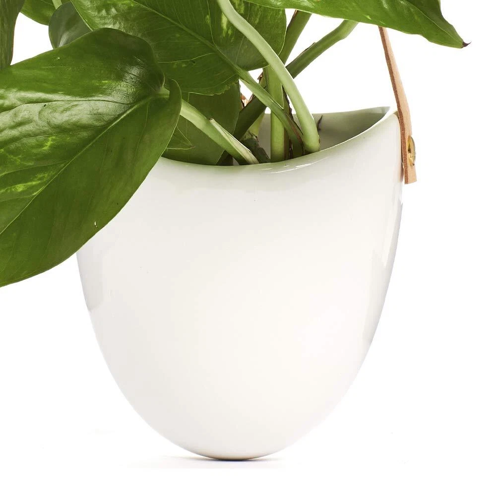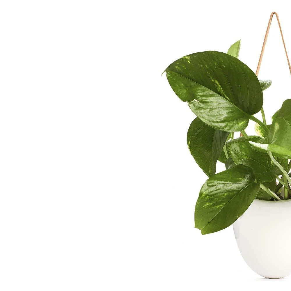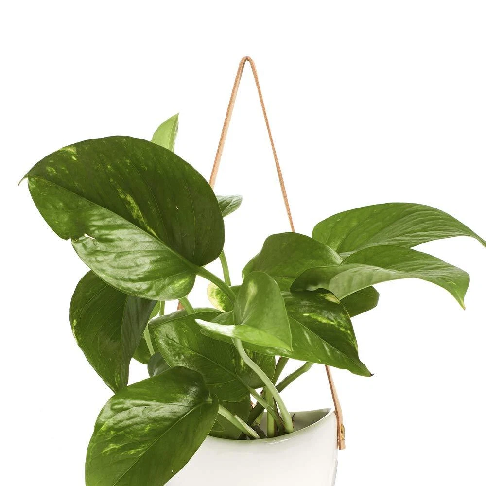 Epipremnum aureum Pothos, also known as Devil's Ivy indoor plant is a trailing ivy known for its ability to thrive in a variety of light exposure. Pothos is a houseplant that can thrive in indirect filtered sunlight or darker rooms and apartments. Houseplants and live indoor plants are a great addition to your home décor because they not only add a natural design element, but they also purify the air in your home! Use this plant hanger for trendy boho bedroom decor or modern farmhouse kitchen decor, your choice! INCLUDED: 4.5" x 4.5" Ceramic Hanging Planter with 12.5" Leather Strap. This houseplant planter includes a live Pothos indoor plant. ABOUT THE PLANT: Pothos Devil's Ivy is a well known hanging house plant that thrives in bright light and low light conditions. This indoor plant is easy to care for and exceptionally resilient, great for new plant parents! WATER: Pothos plants do best if you allow the top inches of soil to dry out between waterings to keep the plant's roots moist. If the leaves begin to droop or turn yellow, water your plant. DÉCOR USE: The back of the planter is slightly flat allowing the planter to hang comfortably against a wall. CUSTOMER : We stand 100% behind our products and our plant quality. If for any reason you are unsatisfied with your pruchase, please us, and we will take wonderful care of you!