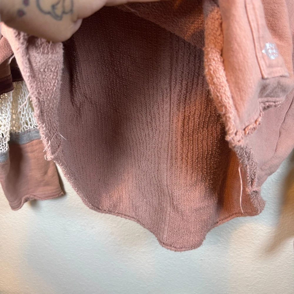 Brand: Free People Movement Size: XS Features: Drawstring Hood Lace crochet detail on sleeves Cropped Length Distressed Look Slightly oversized. Probably could fit a small V-neck cut out detail Condition: Preowned excellent condition. Just a little discoloration on inside of sleeves. See picture. Not noticeable from the outside. Approximate Measurements pictured in the last photo. Please compare these to similiar items you own to ensure proper fit. Preowned items are cleaned to industry standards. They may have smell of detergent/fabric softener All new items may be stored with preowned items that have been washed or have a scent. New items may have a scent of other items/detergent *Items stored in a non smoking environment but pet friendly home
