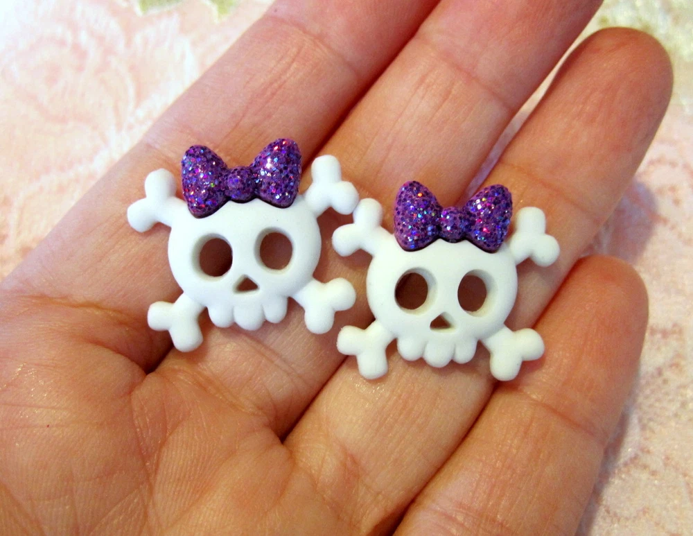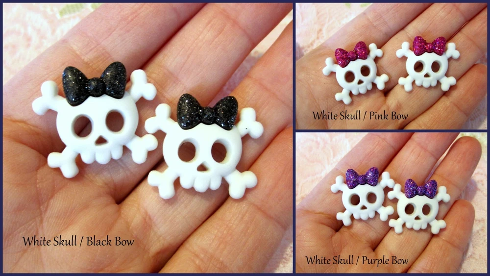 DETAILS ***PLEASE NOTE~these are made upon order so please allow 2-3 days for shipping.*** This listing is for an adorable pair of skull / skullette stud earrings handmade by me! They are white skulls with glitter bows. These earrings are very light weight and measure approx. 7/8 inch long by 7/8 inch wide. I attached them to surgical steel hypoallergenic ear posts with nuts. These earrings are truly gorgeous and handmade with care by me using only the highest quality products!!! FEEDBACK POLICY DUE TO A LARGE NUMBER OF BUYERS THAT NEVER RETURN FEEDBACK...I WILL ONLY GIVE IT AFTER THE BUYER DOES. WHEN THE BUYER RECEIVES THEIR ITEM AND LEAVES ME POSITIVE FEEDBACK, I PROMISE TO RETURN THE FEEDBACK TO THEM. SOMETIMES IT TAKES ME A FEW DAYS BUT I WILL GET IT TO YOU!! IF THE BUYER IS NOT HAPPY WITH SOMETHING I ASK THEM TO PLEASE CONTACT ME BEFORE LEAVING FEEDBACK AND GIVE ME THE FAIR CHANCE TO MAKE THINGS RIGHT!! I HOPE THAT MY BUYERS WILL UNDERSTAND AND I THANK YOU!! QUESTIONS Ask any question that you may have. If you are not happy with this item when you receive it.... please contact us instead of leaving a negative feedback. We are always willing to work anything out. Our customers come first and we want them to be happy. We always promise excellent customer service. A happy customer comes back!! We stand 100% behind our products and 100% guarantee all of them!! PAYMENT DETAILS USA and OUTSIDE USA: We accept PAYPAL payments. We do combine shipping on multiple items IF all items are paid within one payment. PLEASE WAIT FOR COMBINED SHIPPING INVOICE!! If you cannot pay with Paypal immediate, please let us know right away. This will keep us from bothering you with tons of invoices because we will know when to expect your payment!! Items MUST be paid for within 4 days. If not, We will relist the item and file a Non-Paying Bidder complaint. We truly hope that all transactions can be smooth and pleasant!! PLEASE understand that shipping is more than just stamps or postage. We do combine shipping on multiple items IF all items are paid within one payment. PLEASE WAIT FOR COMBINED SHIPPING INVOICE!! I try and ship items out within 24-48 hours after payment is received. I am very careful to package items extremely well which requires alot of high quality packing materials. Please also understand that no matter how fast I ship...the postal service is out of our control. Thank you! FOR RETURNS If you feel that you are not happy with an item, please CONTACT ME before leaving feedback. If the item is broken...I require return and will refund your payment in full when the item gets back to me. If you just dont want the item and choose a REFUND please understand that I cannot issue it until I have the item back in my home and it is in the EXACT shape as when it left. You will need to return the item at your own expense and refunds do not include shipping unless the item is broken or not as described. This is the only way that I can recover some of my costs that I would otherwise lose. THANK YOU!!