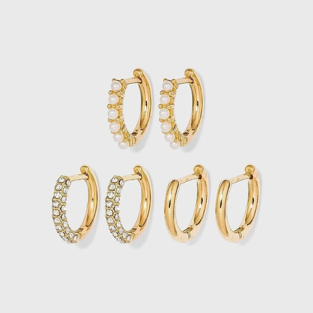 Brand new Sugarfix by Baublebar 3 Piece Earring set Crystal Gold & Pearl Hoop Earrings Nickel Free Color: Gold