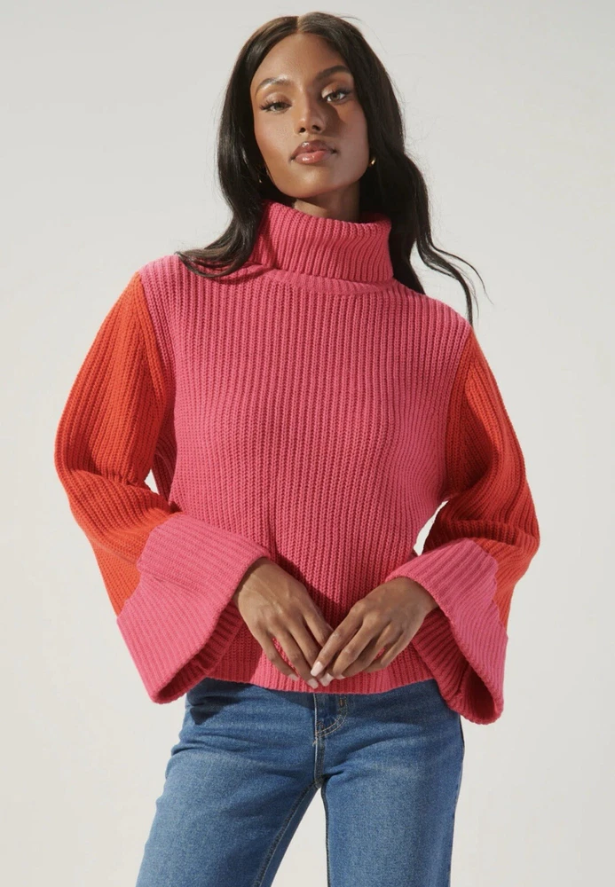 Embrace the cooler seasons with the Sugarlips Sweater Top, a chic and cozy addition to your wardrobe. This pullover is designed with an eye-catching colorblock pattern in a delightful pink and red scheme, complemented by a sophisticated turtleneck and elegant bell sleeves. The geometric pattern adds a modern twist to the classic sweater, making it a versatile piece for casual outings. Crafted from soft acrylic, the sweater ensures both warmth and comfort. Its oversized fit provides a relaxed feel, while the machine-washable fabric allows for easy care. The long sleeves make it ideal for fall, spring, and winter wear, effortlessly transitioning from day to night. This Sugar Lips creation is a must-have for those who appreciate style with practicality.