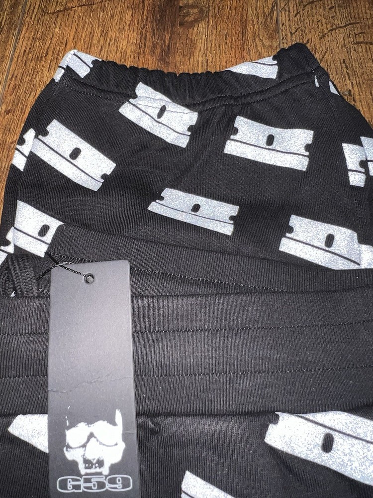Elevate your style with these G59 sweatpants—super comfy with an edgy razor blade design! The black and grey combo looks sleek, and the elastic waist ensures a perfect fit. Made from a durable poly-cotton blend, they’re great for workouts or casual wear. Plus, the pockets are super handy. Love the relaxed fit and bold look—definitely stands out!